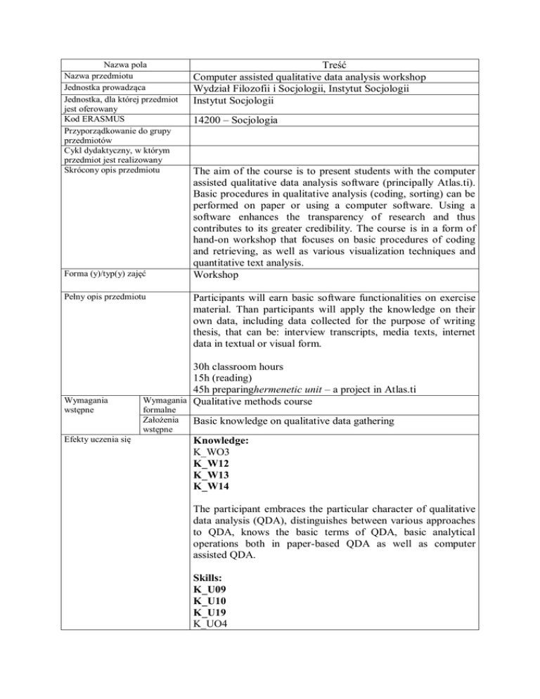 Nazwa pola Nazwa przedmiotu Jednostka prowadząca Jednostka, dla której przedmiot jest oferowany Kod ERASMUS Przyporządkowanie do grupy przedmiotów Cykl dydaktyczny, w którym przedmiot jest realizowany Skrócony opis przedmiotu Forma (y)/typ(y) zajęć Pełny opis przedmiotu Wymagania wstępne Efekty uczenia się Treść Computer assisted qualitative data analysis workshop Wydział Filozofii i Socjologii, Instytut Socjologii Instytut Socjologii 14200 – Socjologia The aim of the course is to present students with the computer assisted qualitative data analysis software (principally Atlas.ti). Basic procedures in qualitative analysis (coding, sorting) can be performed on paper or using a computer software. Using a software enhances the transparency of research and thus contributes to its greater credibility. The course is in a form of hand-on workshop that focuses on basic procedures of coding and retrieving, as well as various visualization techniques and quantitative text analysis. Workshop Participants will earn basic software functionalities on exercise material. Than participants will apply the knowledge on their own data, including data collected for the purpose of writing thesis, that can be: interview transcripts, media texts, internet data in textual or visual form. 30h classroom hours 15h (reading) 45h preparinghermenetic unit – a project in Atlas.ti Wymagania Qualitative methods course formalne Założenia wstępne Basic knowledge on qualitative data gathering Knowledge: K_WO3 K_W12 K_W13 K_W14 The participant embraces the particular character of qualitative data analysis (QDA), distinguishes between various approaches to QDA, knows the basic terms of QDA, basic analytical operations both in paper-based QDA as well as computer assisted QDA. Skills: K_U09 K_U10 K_U19 K_UO4 K_UO6 K_U12 Participant executes basic analytical actions „on paper” and in the computer software. Participant is able to start and develop an analytical project in the computer software. Social competences: K_K06 K_K14 The participant works individually and as part of a team. Punkty ECTS Metody i kryteria oceniania Sposób zaliczenia Rodzaj przedmiotu Sposób realizacji przedmiotu Język wykładowy Literatura Praktyki zawodowe w ramach przedmiotu Imię i nazwisko koordynatora przedmiotu Prowadzący zajęcia Uwagi Acquiring and presenting the data for analysis Analysis of excersise data Analysis of own data in the form of hermeneutic unit Active participation in class a) obowiązkowy b) studia II st. c) stacjonarne In classroom English Nc Anna Kordasiewicz B. Informacje szczegółowe Imię i nazwisko wykładowcy (prowadzącego zajęcia/grupę zajęciową) Stopień/tytuł naukowy Forma dydaktyczna zajęć Efekty uczenia się zdefiniowane dla danej formy dydaktycznej zajęć w ramach przedmiotu Metody i kryteria oceniania dla danej formy dydaktycznej zajęć w ramach przedmiotu Sposób zaliczenia dla danej formy dydaktycznej zajęć w ramach przedmiotu Zakres tematów Anna Kordasiewicz Ph.D. Workshop Jw. Jw. Jw. The course consists of following parts: QDA introduction: various strategies presentation Computer assisted QDA presentation Computer assisted QDA: learning of basic actions: starting up a project, various coding strategies, codes and their combinations retrieving, simple quantitative analysis of text, visualizing the analysis through „network views”, memo creation. Workshop on own data Metody dydaktyczne Literatura Limit miejsc w grupie Terminy odbywania zajęć Miejsce odbywania zajęć The course is divided in three major parts: 1) Introduction into QDA and computer assisted QDA, as well as discussing analytical strategies based on reading 2) Hand-on workshop on excercise data 3) Working on individual projects on participants data Workshop techniques, e.g. small groups work Individual analysis of data Group analysis of data Workshop on the Atlas.ti software, accompanied by a thorough, 20-page Atlas.ti introduction manual Jw. 15 Everyt woweeks, Tuesday 9-12 410