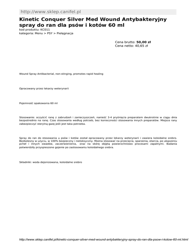 http://www.sklep.canifel.pl Kinetic Conquer Silver Med Wound Antybakteryjny spray do ran dla psów i kotów 60 ml kod produktu: KC011 kategoria: Menu > PSY > Pielęgnacja Cena brutto: 50,00 zł Cena netto: 40,65 zł Wound Spray Antibacterial, non-stinging, promotes rapid healing Opracowany przez lekarzy weterynarii Pojemność opakowania 60 ml Stosowanie: oczyścić ranę z zabrudzeń i zanieczyszczeń, nanieść 3-4 pryśnięcia preparatem dwukrotnie w ciągu dnia bezpośrednio na ranę. Czas stosowania według potrzeb, bez konieczności stosowania innych preparatów. Miejsce rany zabezpieczyć sterylną gazę jeśli jest taka potrzeba. Spray do ran do stosowania u psów i kotów został opracowany przez lekarzy weterynarii i zawiera koloidalne srebro. Bezbolesny w użyciu, w 100% bezpieczny i nietoksyczny. Można stosować na przecięcia, sparzenia, otarcia, po ukąszeniu pcheł i innych owadów, zaczerwienienia, oraz na skórę objętą powierzchniowo procesami zapalnymi. Badania potwierdziły przyspieszone gojenie po zastosowaniu koloidalnego srebra. Składniki: woda dejonizowana, koloidalne srebro http://www.sklep.canifel.pl/kinetic-conquer-silver-med-wound-antybakteryjny-spray-do-ran-dla-psow-i-kotow-60-ml.html