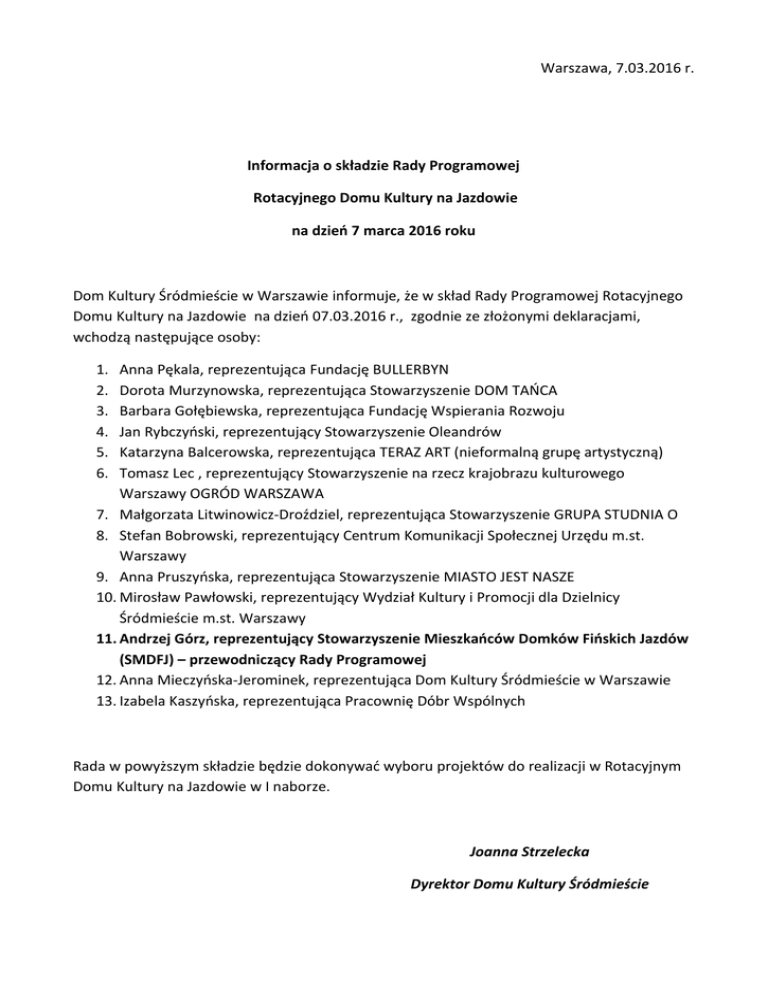 Warszawa, 7.03.2016 r. Informacja o składzie Rady Programowej Rotacyjnego Domu Kultury na Jazdowie na dzień 7 marca 2016 roku Dom Kultury Śródmieście w Warszawie informuje, że w skład Rady Programowej Rotacyjnego Domu Kultury na Jazdowie na dzień 07.03.2016 r., zgodnie ze złożonymi deklaracjami, wchodzą następujące osoby: 1. 2. 3. 4. 5. 6. Anna Pękala, reprezentująca Fundację BULLERBYN Dorota Murzynowska, reprezentująca Stowarzyszenie DOM TAŃCA Barbara Gołębiewska, reprezentująca Fundację Wspierania Rozwoju Jan Rybczyński, reprezentujący Stowarzyszenie Oleandrów Katarzyna Balcerowska, reprezentująca TERAZ ART (nieformalną grupę artystyczną) Tomasz Lec , reprezentujący Stowarzyszenie na rzecz krajobrazu kulturowego Warszawy OGRÓD WARSZAWA 7. Małgorzata Litwinowicz-Droździel, reprezentująca Stowarzyszenie GRUPA STUDNIA O 8. Stefan Bobrowski, reprezentujący Centrum Komunikacji Społecznej Urzędu m.st. Warszawy 9. Anna Pruszyńska, reprezentująca Stowarzyszenie MIASTO JEST NASZE 10. Mirosław Pawłowski, reprezentujący Wydział Kultury i Promocji dla Dzielnicy Śródmieście m.st. Warszawy 11. Andrzej Górz, reprezentujący Stowarzyszenie Mieszkańców Domków Fińskich Jazdów (SMDFJ) – przewodniczący Rady Programowej 12. Anna Mieczyńska-Jerominek, reprezentująca Dom Kultury Śródmieście w Warszawie 13. Izabela Kaszyńska, reprezentująca Pracownię Dóbr Wspólnych Rada w powyższym składzie będzie dokonywać wyboru projektów do realizacji w Rotacyjnym Domu Kultury na Jazdowie w I naborze. Joanna Strzelecka Dyrektor Domu Kultury Śródmieście