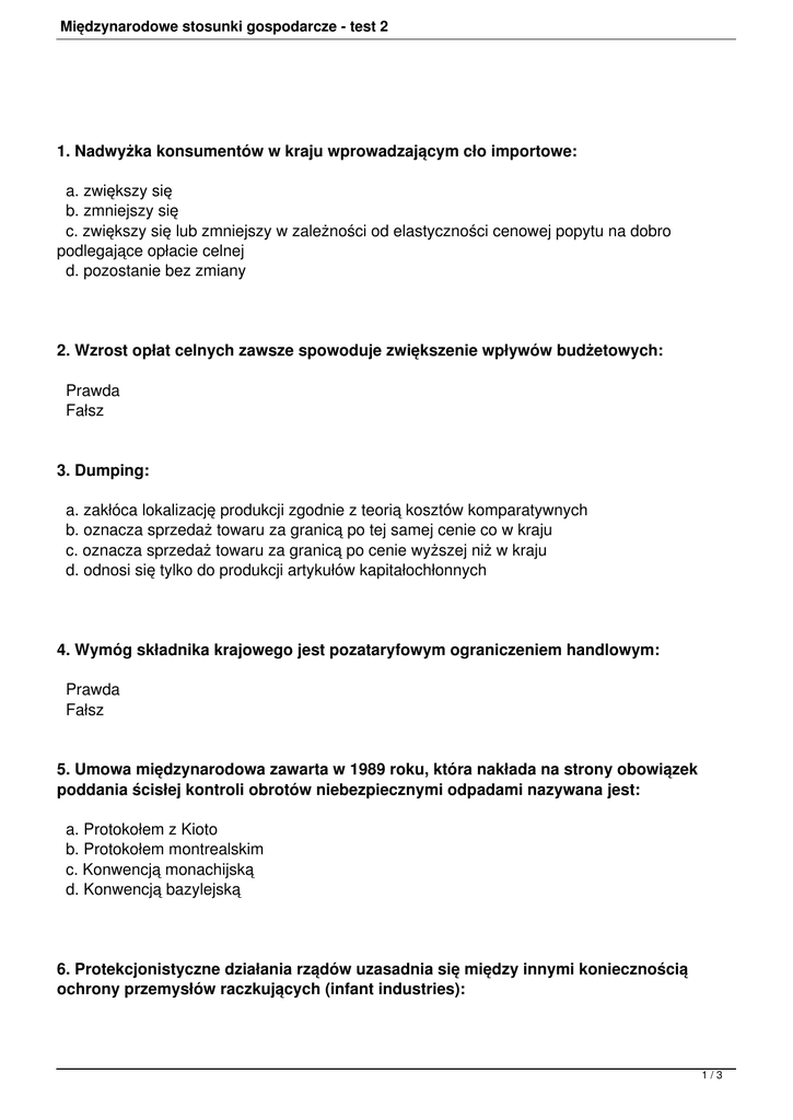 Międzynarodowe stosunki gospodarcze - test 2 1. Nadwyżka konsumentów w kraju wprowadzającym cło importowe: a. zwiększy się b. zmniejszy się c. zwiększy się lub zmniejszy w zależności od elastyczności cenowej popytu na dobro podlegające opłacie celnej d. pozostanie bez zmiany 2. Wzrost opłat celnych zawsze spowoduje zwiększenie wpływów budżetowych: Prawda Fałsz 3. Dumping: a. zakłóca lokalizację produkcji zgodnie z teorią kosztów komparatywnych b. oznacza sprzedaż towaru za granicą po tej samej cenie co w kraju c. oznacza sprzedaż towaru za granicą po cenie wyższej niż w kraju d. odnosi się tylko do produkcji artykułów kapitałochłonnych 4. Wymóg składnika krajowego jest pozataryfowym ograniczeniem handlowym: Prawda Fałsz 5. Umowa międzynarodowa zawarta w 1989 roku, która nakłada na strony obowiązek poddania ścisłej kontroli obrotów niebezpiecznymi odpadami nazywana jest: a. Protokołem z Kioto b. Protokołem montrealskim c. Konwencją monachijską d. Konwencją bazylejską 6. Protekcjonistyczne działania rządów uzasadnia się między innymi koniecznością ochrony przemysłów raczkujących (infant industries): 1/3 Międzynarodowe stosunki gospodarcze - test 2 Prawda Fałsz 7. Likwidacja ceł i ograniczeń pozataryfowych we wzajemnych stosunkach handlowych z jednoczesnym zachowaniem swobody stosowania narzędzi polityki handlowej wobec państw nie biorących udziału w porozumieniu handlowym następuje w wyniku powstania: a. unii celnej b. unii walutowej c. strefy wolnego handlu d. wolnej strefy ekonomicznej 8. Klauzula narodowa mówi, że towary pochodzące z zagranicy nie mogą być na danym rynku traktowane lepiej niż produkty krajowe: Prawda Fałsz 9. Zakup amerykańskich obligacji skarbowych przez polskiego obywatela i następnie trzymanie ich w portfelu inwestycyjnym, aż do terminu wykupu, wpływa na następujące pozycje polskiego bilansu płatniczego: a. rachunek obrotów bieżących i rachunek obrotów kapitałowych b. rachunek obrotów bieżących i rachunek obrotów finansowych c. rachunek obrotów kapitałowych i rachunek obrotów finansowych d. rachunek obrotów bieżących, kapitałowych i finansowych 10. Bilans handlowy jest częścią bilansu obrotów bieżących: Prawda Fałsz 11. Operacja walutowa mająca na celu wyeliminowanie ryzyka kursowego to inaczej: a. spekulacja stabilizująca b. hedging c. arbitraż procentowy d. aprecjacja 2/3 Międzynarodowe stosunki gospodarcze - test 2 12. O sile danej waluty świadczy trwałość jej kursu: Tak Nie Za każdą poprawną odpowiedź otrzymuje się 1 punkt. Maksymalna ilość punktów - 12. Test został przygotowany na podstawie: 1. A. Budnikowski, Międzynarodowe stosunki gospodarcze, Warszawa 2006. 3/3