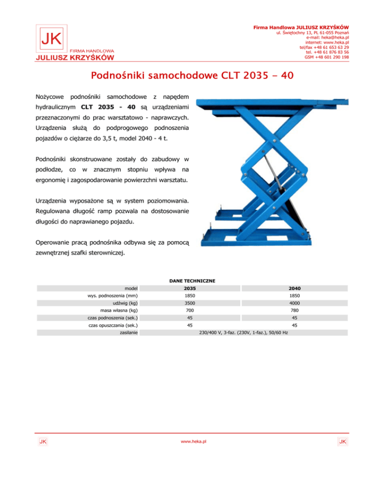 Firma Handlowa JULIUSZ KRZYŚKÓW ul. Świętochny 13, PL 61-055 Poznań e-mail: [email protected] internet: www.heka.pl tel/fax +48 61 653 63 29 tel. +48 61 876 83 56 GSM +48 601 290 198 Podnośniki samochodowe CLT 2035 - 40 Nożycowe podnośniki samochodowe z napędem hydraulicznym CLT 2035 - 40 są urządzeniami przeznaczonymi do prac warsztatowo - naprawczych. Urządzenia służą do podprogowego podnoszenia pojazdów o ciężarze do 3,5 t, model 2040 - 4 t. Podnośniki skonstruowane zostały do zabudowy w podłodze, co w znacznym stopniu wpływa na ergonomię i zagospodarowanie powierzchni warsztatu. Urządzenia wyposażone są w system poziomowania. Regulowana długość ramp pozwala na dostosowanie długości do naprawianego pojazdu. Operowanie pracą podnośnika odbywa się za pomocą zewnętrznej szafki sterowniczej. DANE TECHNICZNE model 2035 2040 wys. podnoszenia (mm) 1850 1850 udźwig (kg) 3500 4000 masa własna (kg) 700 780 czas podnoszenia (sek.) 45 45 czas opuszczania (sek.) 45 zasilanie 45 230/400 V, 3-faz. (230V, 1-faz.), 50/60 Hz www.heka.pl Data: 07/11/07 Layout CLT 2035 Comer Lift Technology Disegnato: CLT Rev. Doc. Foglio 1 di 1 MAX 2100 (*) 800 550 (*) 1900 550 MAX 2000 (*) Suggested dimension Il presente documentoè proprietà della .L.T. C Srl e non può essere riprodotto nè portato a conoscenza di terzi senza l'autorizzazione scritta This document is a property of.L.T. C Srl and it cannot be reproduced or send to others without written authorization MAX 1850 MIN 280 MIN 1525