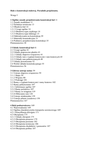 Hale o konstrukcji stalowej. Poradnik projektanta. Wstęp 5 1 Ogólne zasady projektowania konstrukcji hal 11 1.1 Zasady modularne 11 1.2 Dylatacje termiczne 13 1.3 Obudowa hal 14 1.3.1 Uwagi ogólne 14 1.3.2 Obudowa typu ciężkiego 14 1.3.3 Obudowa typu lekkiego 15 1.4 Oddziaływania na konstrukcję 29 1.5 Materiały konstrukcyjne 31 1.6 Podstawy projektowania konstrukcji 35 Piśmiennictwo 38 2 Układy konstrukcji hal 41 2.1 Uwagi ogólne 41 2.2 Układy poprzeczne płaskie 41 2.2.1 Układy słupowo-wiązarowe 41 2.2.2 Układy ram z ryglami kratowymi i ram kratowych 45 2.2.3 Układy ram pełnościennych 48 2.3 Układy przestrzenne 52 2.4 Wybór układu konstrukcyjnego 55 Piśmiennictwo 56 3 Główne ustroje nośne 59 3.1 Ustroje słupowo-wiązarowe 59 3.1.1 Słupy 59 3.1.2 Wiązary 80 3.1.3 Podciągi 101 3.2 Ramy z ryglami kratowymi i ramy kratowe 102 3.3 Ramy pełnościenne 107 3.3.1 Informacje ogólne 107 3.3.2 Ramy portalowe 107 3.3.3 Ramy ze ściągiem 119 3.3.4 Obliczanie ram 128 3.4 Ustroje strukturalne 139 3.5 Ustroje pilaste (szedowe) 158 Piśmiennictwo 167 4 Beki podsuwnicowe 169 4.1 Wprowadzenie 169 4.2 Ogólna charakterystyka transportu suwnicowego 169 4.2.1 Klasyfikacja dźwignic 171 4.3 Obciążenia 175 4.3.1 Układy obciążeń 175 4.3.2 Obciążenia pionowe 179 4.3.3 Obciążenia poziome 182 4.3.4 Obciążenia termiczne 186 4.3.5 Obciążenia chodników i pomostów 187 4.3.6 Obciążenia próbne 187 4.3.7 Oddziaływania wyjątkowe 187 4.3.8 Obciążenie wiatrem i śniegiem 189 4.3.9 Dobór i kojarzenie obciążeń 189 4.4 Wytrzymałość zmęczeniowa 191 4.5 Stany graniczne użytkowalności 198 4.5.1 Deformacje i przemieszczenia graniczne 198 4.5.2 Ograniczenie "oddychania" środników 200 4.5.3 Warunki stanu sprężystego 201 4.5.4 Drgania pasów dolnych 201 4.6 Kształtowanie i obliczanie belek suwnic natorowych 202 4.6.1 Ogólne zasady projektowania belek 202 4.6.2 Szyny jezdne 203 4.6.3 Belki pełnościenne 206 4.6.4 Belki kratowe 217 4.6.5 Kozły odbojowe 222 4.7 Kształtowanie i obliczanie belek suwnic podwieszonych 224 4.8 Dojścia i przejścia do suwnic natorowych 231 Piśmiennictwo 232 5 Konstrukcje wsporcze dachów 235 5.1 Dachy bezpłatwiowe 235 5.2 Dachy płatwiowe 237 5.2.1 Informacje ogólne 237 5.2.2 Płatwie z kształtowników giętych 238 5.2.3 Płatwie z kształtowników walcowanych 251 5.2.4 Płatwie kratowe 253 5.2.5 Obliczanie płatwi 255 Piśmiennictwo 261 6 Konstrukcje wsporcze ścian 263 6.1 Informacje ogólne 263 6.2 Rygle 268 6.3 Słupki 269 6.4 Obliczanie rygli i słupków 271 7 Stężenia 273 7.1 Informacje ogólne 273 7.2 Stężenia dachowe 273 7.2.1 Rodzaje i rozmieszczenie stężeń 273 7.2.2 Stężenia połaciowe poprzeczne 274 7.2.3 Stężenia połaciowe podłużne 275 7.2.4 Stężenia podłużne w poziomie pasa dolnego wiązarów 276 7.2.5 Stężenia pionowe 276 7.3 Stężenia słupów 280 7.4 Obliczanie stężeń 286 7.4.1 Ogólne zasady obliczeń 286 7.4.2 Obliczanie stężeń dachowych 286 7.4.3 Obliczanie stężeń słupów 288 8 Współdziałanie szkieletu hal z lekką obudową z blachy profilowanej 291 8.1 Informacje ogólne 291 8.2 Zachowanie się blachy jako płyty 291 8.3 Zachowanie się blachy jako tarczy 292 8.4 Przepony z blach 294 8.5 Przykład konstrukcji tarczy dachowej 297 9 Wybrane przykłady rozwiązań konstrukcyjnych hal o dużych rozpiętościach 299 9.1 Wprowadzenie 299 9.2 Konstrukcje łukowe 299 9.2.1 Kształtowanie i obliczanie łuków 299 9.2.2 Przykłady konstrukcji 301 9.3 Konstrukcje cięgnowe 312 9.3.1 Rodzaje konstrukcji cięgnowych 312 9.3.2 Elementy i materiały konstrukcyjne 314 9.3.3 Ogólne zasady obliczania konstrukcji linowych 316 9.3.4 Przykłady konstrukcji 321 Piśmiennictwo 335 10 Komputerowe wspomaganie projektowania konstrukcji hal 337 10.1 Wprowadzenie 337 10.2 Programy CAD - Dokumentacja techniczna 337 10.3 Programy CAE - Obliczenia statyczno-wytrzymałościowe 347 10.4 Wybrane przykłady zastosowań analiz inżynierskich CAE 353 Piśmiennictwo 361 11 Zabezpieczenie konstrukcji przed korozją i ogniem 363 11.1 Ochrona przed korozją 363 11.1.1 Informacje ogólne 363 11.1.2 Kształtowanie elementów konstrukcji z uwzględnieniem uwarunkowań korozyjnych 365 11.1.3 Projektowanie zabezpieczeń antykorozyjnych 367 11.2 Ochrona przed ogniem 370 Piśmiennictwo 374 12 Przykłady obliczeń głównych ustrojów nośnych hal 377 12.1 Ustrój słupowo-wiązarowy hali bez transportu suwnicowego 377 12.1.1 Założenia projektowe 377 12.1.2 Sprawdzenie nośności płatwi 381 12.1.3 Obliczenia statyczne ramy w osiach 35-38 382 12.1.4 Sprawdzenie nośności wiązara 387 12.1.5 Sprawdzenie nośności słupów ramy 403 12.2 Układ przegubowy stężony w płaszczyźnie dachu i ścian 409 12.2.1 Założenia projektowe 409 12.2.2 Sprawdzenie nośnosci konstrukcji dachu 412 12.2.3 Sprawdzenie nośności płatwi 412 12.2.4 Sprawdzenie nośności wiązarów 414 12.2.5 Sprawdzenie nośności słupów 422 12.2.6 Stężenia hali 427 12.3 Rama ze ściągiem hali z suwnicą podwieszoną 433 12.3.1 Założenia projektowe 433 12.3.2 Obliczenia statyczne ramy 436 12.3.3 Sprawdzenie nośności rygla ramy 441 12.3.4 Sprawdzenie nośności słupów 448 12.3.5 Sprawdzenie nośności ściągu 454 12.4 Rama wieloprzęsłowa z ryglem kratowym 455 12.4.1 Założenia projektowe 455 12.4.2 Sprawdzenie nośności płatwi 458 12.4.3 Sprawdzenie nośności rygla ramy 464 12.4.4 Sprawdzenie nośności słupów 474