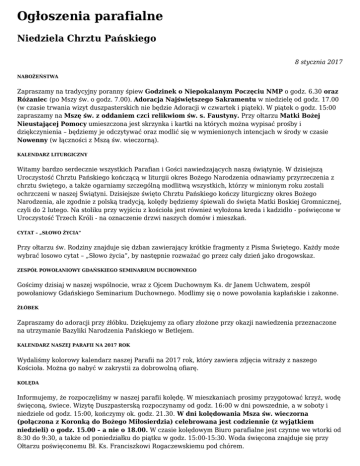 Ogłoszenia parafialne Niedziela Chrztu Pańskiego 8 stycznia 2017 NABOŻEŃSTWA Zapraszamy na tradycyjny poranny śpiew Godzinek o Niepokalanym Poczęciu NMP o godz. 6.30 oraz Różaniec (po Mszy św. o godz. 7.00). Adoracja Najświętszego Sakramentu w niedzielę od godz. 17.00 (w czasie trwania wizyt duszpasterskich nie będzie Adoracji w czwartek i piątek). W piątek o godz. 15:00 zapraszamy na Mszę św. z oddaniem czci relikwiom św. s. Faustyny. Przy ołtarzu Matki Bożej Nieustającej Pomocy umieszczona jest skrzynka i kartki na których można wypisać prośby i dziękczynienia – będziemy je odczytywać oraz modlić się w wymienionych intencjach w środy w czasie Nowenny (w łączności z Mszą św. wieczorną). KALENDARZ LITURGICZNY Witamy bardzo serdecznie wszystkich Parafian i Gości nawiedzających naszą świątynię. W dzisiejszą Uroczystość Chrztu Pańskiego kończącą w liturgii okres Bożego Narodzenia odnawiamy przyrzeczenia z chrztu świętego, a także ogarniamy szczególną modlitwą wszystkich, którzy w minionym roku zostali ochrzczeni w naszej Świątyni. Dzisiejsze święto Chrztu Pańskiego kończy liturgiczny okres Bożego Narodzenia, ale zgodnie z polską tradycją, kolędy będziemy śpiewali do święta Matki Boskiej Gromnicznej, czyli do 2 lutego. Na stoliku przy wyjściu z kościoła jest również wyłożona kreda i kadzidło - poświęcone w Uroczystość Trzech Króli - na oznaczenie drzwi naszych domów i mieszkań. CYTAT – „SŁOWO ŻYCIA” Przy ołtarzu św. Rodziny znajduje się dzban zawierający krótkie fragmenty z Pisma Świętego. Każdy może wybrać losowo cytat – „Słowo życia”, by następnie rozważać go przez cały dzień jako drogowskaz. ZESPÓŁ POWOŁANIOWY GDAŃSKIEGO SEMINARIUM DUCHOWNEGO Gościmy dzisiaj w naszej wspólnocie, wraz z Ojcem Duchownym Ks. dr Janem Uchwatem, zespół powołaniowy Gdańskiego Seminarium Duchownego. Modlimy się o nowe powołania kapłańskie i zakonne. ŻŁÓBEK Zapraszamy do adoracji przy żłóbku. Dziękujemy za ofiary złożone przy okazji nawiedzenia przeznaczone na utrzymanie Bazyliki Narodzenia Pańskiego w Betlejem. KALENDARZ NASZEJ PARAFII NA 2017 ROK Wydaliśmy kolorowy kalendarz naszej Parafii na 2017 rok, który zawiera zdjęcia witraży z naszego Kościoła. Można go nabyć w zakrystii za dobrowolną ofiarę. KOLĘDA Informujemy, że rozpoczęliśmy w naszej parafii kolędę. W mieszkaniach prosimy przygotować krzyż, wodę święconą, świece. Wizytę Duszpasterską rozpoczynamy od godz. 16:00 w dni powszednie, a w soboty i niedziele od godz. 15:00, kończymy ok. godz. 21.30. W dni kolędowania Msza św. wieczorna (połączona z Koronką do Bożego Miłosierdzia) celebrowana jest codziennie (z wyjątkiem niedzieli) o godz. 15.00 – a nie o 18.00. W czasie kolędowym Biuro parafialne jest czynne we wtorki od 8:30 do 9:30, a także od poniedziałku do piątku w godz. 15:00-15:30. Woda święcona znajduje się przy Ołtarzu poświęconemu Bł. Ks. Franciszkowi Rogaczewskiemu pod chórem. Wizyta duszpasterska jest okazją do wspólnej modlitwy o Boże błogosławieństwo dla naszych domów i rodzin. Dziękujemy za życzliwe przyjęcie. Tradycyjne Ofiary składane podczas Kolędy w tym roku przeznaczone są na wymianę stolarki okiennej w pomieszczeniach pod kościołem i w wieży. Plan kolęd na najbliższe dni przedstawia się następująco: 2017-01-08 niedziela Biskupia 4, 6, Na Stoku 3, 7, 8/9, 10, 23, 25, 35, 37, 38, 39, 41, 41A, 42, 42 A, 43, 45, 53/55 2017-01-09 poniedziałek Na Stoku 11, 12 A B C D, 14, 15, 40, 40 A, B, Wyczółkowskiego 27-69 (nieparzyste), 71-109 2017-01-10 wtorek Wyczółkowskiego 1-34, Kolonia Wyżyny, Powst. Warszawskich 25, Legnicka 1/3, 13, 30, 32/34, 36/38, 40, 42, 42 AB, 44 2017-01-11 środa Legnicka 2, 4, 6, 8, 9, 10, 11, 12 A, B, 14, 15, 16, 17, 18, 19, 20, 21, 23, 25, 26, 28, Gierymskiego, Pankiewicza, Powst. Warszawskich 26-40 (parzyste) 2017-01-12 czwartek Powst. Warszawskich 3, 12, 14, 15, 16, 17, 18, 20, 22, 24, 42, 44, 46, 2017-01-13 piątek 3 Maja 16, 21, 24, 25, 25 A 2017-01-14 sobota Wrocławska 1, 2, 3-23 (nieparzyste), 18-34 (parzyste), Bema 7-17 2017-01-15 niedziela Płowce SPOTKANIA Dziś o godz. 11:00 - Msza św. w intencji Kręgów Domowego Kościoła naszej Parafii, a po niej spotkanie opłatkowe i agapa w salce kominkowej. Kandydaci przygotowujący się do Sakramentu Bierzmowania spotykają się w środę o godz. 17:30. W czasie ferii nie będzie Mszy św. o 16.00. Najbliższe spotkanie dla Dzieci przygotowujących się do I Komunii Świętej i ich Rodzin odbędzie się w niedzielę 5 lutego br. PRASA KATOLICKA Zachęcamy do nabycia i czytania prasy katolickiej - w sposób szczególny nowego numeru „Gościa niedzielnego” oraz naszego parafialnego biuletynu. PODZIĘKOWANIA Składamy serdeczne podziękowania za wszelkie złożone ofiary, szczególnie za złożone na tacę w Uroczystość Trzech Króli na Krajowy Fundusz Misyjny oraz dzisiaj na nasze potrzeby inwestycyjne i spłatę pozostałych zobowiązań, a także wpłacone na nasze parafialne konto bankowe. W przyszłą niedzielę zbiórka do puszki na obiady dla najuboższych uczniów naszej parafii. Dziś oraz w przyszłą niedzielę nasza Schola Królewska będzie rozprowadzać nagrane przez siebie płyty, które będą cegiełką na organizacją zimowiska. Serdecznie dziękujemy Wszystkim za pomoc i życzliwe wsparcie. ŻYCZENIA Wszystkim naszym Parafianom, wszystkim Gościom oraz tym, którzy w najbliższym czasie będą obchodzili swoje Imieniny, Urodziny, Jubileusze składamy nasze najserdeczniejsze życzenia. Zapraszamy również na naszą stronę internetową - www.chrystuskrol.diecezja.gda.pl. Są jeszcze wolne intencje mszalne, które można zamawiać w biurze parafialnym. KRONIKA ŻAŁOBNA Naszym zwyczajem na zakończenie niedzielnej Eucharystii pomódlmy się za zmarłych: Duszpasterzy, Siostry zakonne, Dobrodziejów naszej Parafii, Parafian: + Zofia