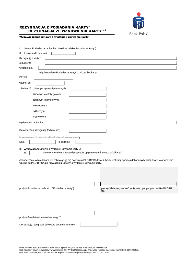 REZYGNACJA Z POSIADANIA KARTY/ REZYGNACJA ZE WZNOWIENIA KARTY *) Wypowiedzenie umowy o wydanie i używanie karty I. Nazwa Posiadacza rachunku / Imię i nazwisko Posiadacza karty*) II. Z dniem (dd.mm.rrrr) Rezygnuję z karty 1) o numerze wydanej dla Imię i nazwisko Posiadacza karty/ Użytkownika karty* PESEL ważnej do z limitem*): dziennym operacji płatniczych dziennym wypłaty gotówki dziennym internetowym miesięcznym cyklicznym kredytowym wydanej do rachunku Data złożenia rezygnacji (dd.mm.rrrr) Karta została zwrócona / nie została zwrócona*) i została zniszczona / nie została zniszczona* Dnia o godzinie ) : III. Wypowiadam Umowę o wydanie i używanie karty 2) za dniowym terminem wypowiedzenia /z upływem terminu ważności karty*). Jednocześnie oświadczam, że zobowiązuję się do zwrotu PKO BP SA kwot z tytułu realizacji operacji dokonanych kartą, które to obciążenia wpłyną do PKO BP SA po rozwiązaniu Umowy o wydanie i używanie karty. podpis Posiadacza rachunku / Posiadacza karty*) pieczęć dzienna, pieczęć funkcyjna i podpis pracownika PKO BP SA podpis Przedstawiciela ustawowego 3) Dyspozycję rezygnacji odwołano dnia (dd.mm.rrrr) Powszechna Kasa Oszczędności Bank Polski Spółka Akcyjna, 02-515 Warszawa, ul. Puławska 15 Sąd Rejonowy dla m.st. Warszawy w Warszawie, XIII Wydział Gospodarczy Krajowego Rejestru Sądowego numer KRS 0000026438, NIP: 525-000-77-38, REGON: 016298263; kapitał zakładowy (kapitał wpłacony) 1 250 000 000 PLN podpis Posiadacza rachunku / Posiadacza karty*) podpis Przedstawiciela ustawowego 3) 1) proszę wpisać nazwę karty wypełnij, jeżeli rezygnacja z karty skutkuje wypowiedzeniem umowy dotyczy wyłącznie karty do rachunku SUPERKONTO GRAFFITI ) * niepotrzebne skreślić 2) 3) pieczęć dzienna, pieczęć funkcyjna i podpis pracownika PKO BP SA