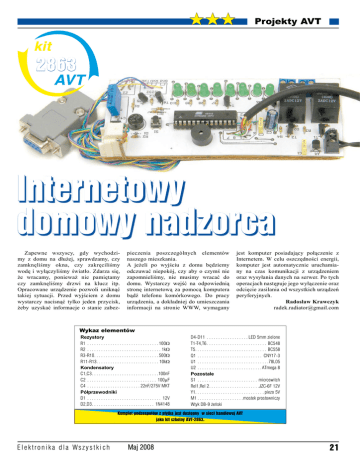 Projekty AVT 2863 Internetowy domowy nadzorca Zapewne wszyscy, gdy wychodzimy z domu na dłużej, sprawdzamy, czy zamknęliśmy okna, czy zakręciliśmy wodę i wyłączyliśmy światło. Zdarza się, że wracamy, ponieważ nie pamiętamy czy zamknęliśmy drzwi na klucz itp. Opracowane urządzenie pozwoli uniknąć takiej sytuacji. Przed wyjściem z domu wystarczy nacisnąć tylko jeden przycisk, żeby uzyskać informacje o stanie zabez- pieczenia poszczególnych elementów naszego mieszkania. A jeżeli po wyjściu z domu będziemy odczuwać niepokój, czy aby o czymś nie zapomnieliśmy, nie musimy wracać do domu. Wystarczy wejść na odpowiednią stronę internetową za pomocą komputera bądź telefonu komórkowego. Do pracy urządzenia, a dokładniej do umieszczania informacji na stronie WWW, wymagany jest komputer posiadający połączenie z Internetem. W celu oszczędności energii, komputer jest automatycznie uruchamiany na czas komunikacji z urządzeniem oraz wysyłania danych na serwer. Po tych operacjach następuje jego wyłączenie oraz odcięcie zasilania od wszystkich urządzeń peryferyjnych. Radosław Krawczyk [email protected] Wykaz elementów Rezystory R1 . . . . . . . . . . . . . . . . . . . . . . . . . . . . . . . 100Ω R2 . . . . . . . . . . . . . . . . . . . . . . . . . . . . . . . . 1kΩ R3-R10. . . . . . . . . . . . . . . . . . . . . . . . . . . . 500Ω R11-R13. . . . . . . . . . . . . . . . . . . . . . . . . . . 10kΩ Kondensatory C1,C3. . . . . . . . . . . . . . . . . . . . . . . . . . . . .100nF C2 . . . . . . . . . . . . . . . . . . . . . . . . . . . . . . 100µF C4 . . . . . . . . . . . . . . . . . . . . . . . 22nF/275V MKT Półprzewodniki D1 . . . . . . . . . . . . . . . . . . . . . . . . . . . . . . . . 12V D2,D3. . . . . . . . . . . . . . . . . . . . . . . . . . . 1N4148 D4-D11 . . . . . . . . . . . . . . . . . . LED 5mm zielone T1-T4,T6 . . . . . . . . . . . . . . . . . . . . . . . . . . BC548 T5. . . . . . . . . . . . . . . . . . . . . . . . . . . . . . . BC558 Q1 . . . . . . . . . . . . . . . . . . . . . . . . . . . . CNY17-3 U1 . . . . . . . . . . . . . . . . . . . . . . . . . . . . . . .78L05 U2 . . . . . . . . . . . . . . . . . . . . . . . . . . . . ATmega 8 Pozostałe S1 . . . . . . . . . . . . . . . . . . . . . . . . . . microswitch Rel1,Rel 2. . . . . . . . . . . . . . . . . . . . . .JZC-6F 12V Y1. . . . . . . . . . . . . . . . . . . . . . . . . . . . . . piezo 5V M1 . . . . . . . . . . . . . . . . . . . .mostek prostowniczy Wtyk DB-9 żeński Komplet podzespołów z płytką jest dostępny w sieci handlowej AVT jako kit szkolny AVT-2863. E l e k t r o n i k a d l a Ws z y s t k i c h Maj 2008 21