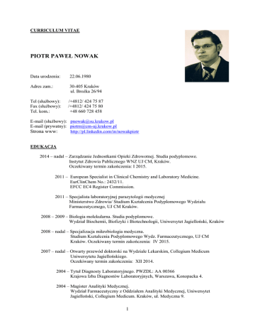 CURRICULUM VITAE PIOTR PAWEŁ NOWAK Data urodzenia: 22.06.1980 Adres zam.: 30-405 Kraków ul. Brożka 26/94 Tel (służbowy): Fax (służbowy): Tel. kom.: /+4812/ 424 75 87 /+4812/ 424 75 80 +48 660 728 458 E-mail (służbowy): [email protected] E-mail (prywatny): [email protected] Strona www: http://pl.linkedin.com/in/nowakpiotr EDUKACJA 2014 – nadal – Zarządzanie Jednostkami Opieki Zdrowotnej. Studia podyplomowe. Instytut Zdrowia Publicznego WNZ UJ CM, Kraków. Oczekiwany termin zakończenia: I 2015. 2011 – European Specialist in Clinical Chemistry and Laboratory Medicine. EurClinChem No.: 2432/11. EFCC EC4 Register Commission. 2011 – Specjalista laboratoryjnej parazytologii medycznej Ministerstwo Zdrowia/ Studium Kształcenia Podyplomowego Wydziału Farmaceutycznego, UJ CM Kraków. 2008 – 2009 – Biologia molekularna. Studia podyplomowe. Wydział Biochemii, Biofizyki i Biotechnologii, Uniwersytet Jagielloński, Kraków 2008 – nadal – Specjalizacja mikrobiologia medyczna. Studium Kształcenia Podyplomowego Wydz. Farmaceutycznego, UJ CM Kraków. Oczekiwany termin zakończenia: IV 2015. 2007 – nadal – Otwarty przewód doktorski na Wydziale Lekarskim, Collegium Medicum Uniwersytetu Jagiellońskiego. Oczekiwany termin zakończenia: XII 2014. 2004 – Tytuł Diagnosty Laboratoryjnego. PWZDL: AA 00366 Krajowa Izba Diagnostów Laboratoryjnych, Warszawa, Konopacka 4. 2004 – Magister Analityki Medycznej. Wydział Farmaceutyczny z Oddziałem Analityki Medycznej, Uniwersytet Jagielloński, Collegium Medicum. Kraków, ul. Medyczna 9. 1 HISTORIA ZATRUDNIENIA VI 2011-nadal – Starszy asystent Zakładu Mikrobiologii. Szpital Uniwersytecki w Krakowie. 31-501 Kraków, ul. Kopernika 19. http://www.su.krakow.pl/zakad-mikrobiologii-krakow Akredytacja CMJ No. 2013/62. VI 2010-VI 2011 – Młodszy asystent Zakładu Mikrobiologii. Szpital Uniwersytecki w Krakowie. 31-501 Kraków, ul. Śniadeckich 6. http://www.su.krakow.pl/zakad-mikrobiologii-krakow XI 2009-VI 2010 – Asystent Laboratorium Parazytologii / Z-ca Kierownika Laboratorium Parazytologii. Oddział Laboratoryjny Mikrobiologii i Parazytologii, Wojewódzka Stacja Sanitarno-Epidemiologiczna w Krakowie. 31-202 Kraków, ul. Prądnicka 76. Laboratorium akredytowane w zakresie normy PN-EN ISO/IEC 17025. Numer certyfikatu: AB 601. Data ważności: 04.05.2017 http://www.pca.gov.pl/ http://www.wsse.krakow.pl/ VII 2009-XI 2009 – Asystent Laboratorium Parazytologii. Oddział Laboratoryjny Mikrobiologii i Parazytologii, Wojewódzka Stacja Sanitarno-Epidemiologiczna w Krakowie. 31-202 Kraków, ul. Prądnicka 76. Laboratorium akredytowane w zakresie normy PN-EN ISO/IEC 17025. Numer certyfikatu: AB 601. Data ważności: 04.05.2017 http://www.pca.gov.pl/ http://www.wsse.krakow.pl/ X 2005-VII 2009 – Młodszy asystent Laboratorium Parazytologii Oddział Laboratoryjny Mikrobiologii i Parazytologii, Wojewódzka Stacja Sanitarno-Epidemiologiczna w Krakowie. 31-202 Kraków, ul. Prądnicka 76. Laboratorium akredytowane w zakresie normy PN-EN ISO/IEC 17025. Numer certyfikatu: AB 601. Data ważności: 04.05.2017 http://www.pca.gov.pl/ http://www.wsse.krakow.pl/ X 2004-X 2005 – Stażysta Oddziału Mikrobiologii i Parazytologii Działu Epidemiologii. Wojewódzka Stacja Sanitarno-Epidemiologiczna w Krakowie. 31-202 Kraków, ul. Prądnicka 76. http://www.wsse.krakow.pl/ DOŚWIADCZENIE NAUKOWE N N404 127838 grant promotorski MNiSW “Ocena metody opartej na amplifikacji DNA w laboratoryjnej diagnostyce toksoplazmozy”. Uniwersytet Jagielloński, Collegium Medicum, Wydział Lekarski, Katedra Mikrobiologii, 2010 – 2012. Wykonawca. Kierownik projektu: Prof. dr hab. med. Piotr B. Heczko. 31-121 Kraków, ul. Czysta 18. 2 Raman spectroscopy of the human RBC membrane lipids. 2012 – 2013. Wykonawca. Kierownik badań: Dr hab. Aleksandra Wesełucha-Birczyńska Uniwersytet Jagielloński, Wydział Chemii, Zakład Fizyki Chemicznej 30-060 Kraków, ul. Ingardena 3 CZŁONKOSTWO W TOWARZYSTWACH NAUKOWYCH 1. ESCMID – European Society of Clinical Microbiology and Infectious Diseases. ESGCP – The ESCMID Study Group for Clinical Parasitology. 2010 – nadal. http://www.escmid.org/ 2. IFCC – International Federation of Clinical Chemistry and Laboratory Medicine. 2006 – nadal. http://www.ifcc.org/ 3. PTP – Polskie Towarzystwo Parazytologiczne. 2004 – nadal. 2007 – 2010. Członek zarządu o/Kraków. 2010 – 2013. Vice przewodniczący o/Kraków. 2014 – 2016. Vice przewodniczący o/Kraków. http://www.ptparasit.org.pl/ 4. PTDL – Polskie Towarzystwo Diagnostyki Laboratoryjnej. 2004 – nadal. http://www.ptdl.pl Sekcja Laboratoryjnej Parazytologii Medycznej. 2014 - nadal 5. EUROMDNET. Rada epidemiologii. 2010 – nadal. http://www.euromdnet.org/board.php 6. PTM – Polskie Towarzystw Mikrobiologów. 2010 – nadal. http://www.microbiology.pl/index.php?lang=en UMIEJĘTNOŚCI SPECJALISTYCZNE Audytowanie komórek wewnętrznych Szpitala Uniwersyteckiego w Krakowie wg. ISO 9001, ISO 14001, OHSAS 18001. Szerokie doświadczenie w stosowaniu metod koproskopowych, immunochemicznych (ELISA, ELFA), barwień oraz metod biologii molekularnej w diagnostyce laboratoryjnej inwazji jelitowych oraz tkankowych. Diagnostyka larw nicieni przy użyciu metody Harada-Mori, Dančescu oraz Baermana. Barwienie Zh-N/Kinyoun w kierunku oocyst kokcydiów (Cryptosporidium spp./Cyclospora). Diagnostyka komensalnych i pasożytniczych pierwotniaków z użyciem barwienia metodą Gömöri-Wheatley’a. Wykrywanie DNA Toxoplasma gondii metodą rtPCR we krwi oraz innych matrycach. Umiejętność izolacji DNA genomowego z krwi pełnej oraz innych matryc biologicznych z użyciem zestawów: QIAamp (Qiagen), BloodMini, Genomic Mini (A&A Biotechnology). Szeroka znajomość norm PN-EN ISO/IEC: 17025, PN-EN ISO: 15189, PN-EN ISO: 9001, PN-EN ISO 19011, CLSI-ISO/TC212 (biologia molekularna) i ich zastosowanie w walidacji i akredytacji procedur badawczych w MLD. Znajomość norm ISO 14001 oraz OHSAS