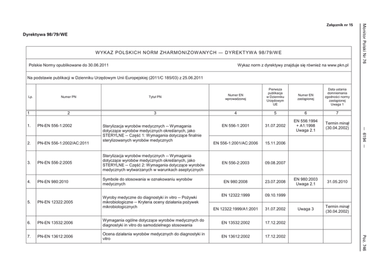 Dyrektywa 98/79/WE W YKAZ POLSKICH NORM ZHARMO NIZOW ANYCH ʊ DYREKTYW A 98/79/W E Polskie Normy opublikowane do 30.06.2011 Wykaz norm z dyrektywy znajduje siĊ równieĪ na www.pkn.pl Monitor Polski Nr 76 Załącznik nr 15 Na podstawie publikacji w Dzienniku UrzĊdowym Unii Europejskiej (2011/C 185/03) z 25.06.2011 Lp. 1 Numer EN zastąpionej Data ustania domniemania zgodnoĞci normy zastąpionej Uwaga 1 7\WXã31 2 3 4 5 6 7 EN 556-1:2001 31.07.2002 EN 556:1994 + A1:1998 Uwaga 2.1 Termin minąã (30.04.2002) EN 556-1:2001/AC:2006 15.11.2006 EN 556-2:2003 09.08.2007 EN 980:2008 23.07.2008 EN 980:2003 Uwaga 2.1 31.05.2010 EN 12322:1999 09.10.1999 EN 12322:1999/A1:2001 31.07.2002 Uwaga 3 Termin minąã (30.04.2002) PN-EN 556-1:2002 2. PN-EN 556-1:2002/AC:2011 3. PN-EN 556-2:2005 Sterylizacja wyrobów medycznych -- Wymagania dotyczące wyrobów medycznych okreĞlanych, jako STERYLNE -- CzĊĞü 2: Wymagania dotyczące wyrobów medycznych wytwarzanych w warunkach aseptycznych 4. PN-EN 980:2010 Symbole do stosowania w oznakowaniu wyrobów medycznych PN-EN 12322:2005 Wyroby medyczne do diagnostyki in vitro -- PoĪywki PLNURELRORJLF]QH.U\WHULDRFHQ\G]LDãDQLDSRĪywek mikrobiologicznych Sterylizacja wyrobów medycznych -- Wymagania dotyczące wyrobów medycznych okreĞlanych, jako STERYLNE -- CzĊĞü 1: Wymagania dotyczące finalnie sterylizowanych wyrobów medycznych PN-EN 13532:2006 Wymagania ogólne dotyczące wyrobów medycznych do diagnostyki in vitro do samodzielnego stosowania EN 13532:2002 17.12.2002 7. PN-EN 13612:2006 2FHQDG]LDãDQLDZ\UREyZPHG\F]Q\FKGRGLDJQRVW\NLLn vitro EN 13612:2002 17.12.2002 Poz. 746 6. — 6194 — Numer PN 1. 5. Pierwsza publikacja w Dzienniku UrzĊdowym UE Numer EN wprowadzonej 2 3 4 5 EN 13612:2002/AC:2002 02.12.2009 31(1 %DGDQLHWUZDãRĞci odczynników do diagnostyki in vitro EN 13640:2002 17.12.2002 9. PN-EN 13641:2006 Eliminacja lub zmniejszenie ryzyka zakaĪenia związanego z odczynnikami do diagnostyki in vitro EN 13641:2002 17.12.2002 10. PN-EN 13975:2006 Procedury kontroli wyrywkowej stosowane w odbiorczych badaniach wyrobów medycznych do diagnostyki in vitro -Aspekty statystyczne EN 13975:2003 21.11.2003 11. PN-EN 14136:2007 Zastosowanie zewnĊtrznych programów kontroli jakoĞci do oceny osiągniĊü procedur badawczych w diagnostyce in vitro EN 14136:2004 15.11.2006 12. PN-EN 14254:2009 Wyroby medyczne do diagnostyki in vitro -- Pojemniki jednorazowego uĪytku do pobierania od ludzi próbek innych niĪ krew EN 14254:2004 28.04.2005 13. PN-EN 14820:2009 Pojemniki jednorazowego uĪytku do pobierania od ludzi próbek krwi Īylnej EN 14820:2004 28.04.2005 PN-EN 61010-2-101:2005 Wymagania bezpieczeĔstwa dotyczące elektrycznych przyrządów pomiarowych, automatyki i urządzeĔ laboratoryjnych -- CzĊĞü:\PDJDQLDV]F]HJyãRZH dotyczące urządzeĔ medycznych przeznaczonych do diagnozy in vitro (IVD) EN 61010-2-101:2002 17.12.2002 15. PN-EN 61326-2-6:2006 WyposaĪenie elektryczne do pomiarów, sterowania i uĪytku w laboratoriach -- Wymagania dotyczące kompatybilnoĞci elektromagnetycznej (EMC) -CzĊĞü:\PDJDQLDV]F]HJyãRZH:\SRVDĪenie medyczne do diagnostyki in vitro (IVD) (oryg.)* EN 61326-2-6:2006 27.11.2008 16. PN-EN 62304:2010 Oprogramowanie wyrobów medycznych -- Procesy cyklu Īycia oprogramowania. EN 62304:2006 27.11.2008 14. 7 — 6195 — 8. 6 Monitor Polski Nr 76 1 Poz. 746 17. 18. 19. 2 3 PN-EN 62366:2008 Urządzenia medyczne -- Zastosowanie inĪynierii uĪytecznoĞci do urządzeĔ medycznych (oryg.) PN-EN ISO 11737-2:2010 Sterylizacja wyrobów medycznych -- Metody mikrobiologiczne -- CzĊĞü 2: Badania sterylnoĞci stosowane podczas okreĞlania, walidacji i przebiegu procesu sterylizacji (oryg.) PN-EN ISO 13485:2005 4 5 EN 62304:2006/AC:2008 18.01.2011 EN 62366:2008 27.11.2008 EN ISO 11737-2:2009 07.07.2010 PN-EN ISO 13485:2005/AC:2009 7 EN ISO 13488: 2000 EN ISO 13485: 2000 Uwaga 2.1 Termin minąã (31.07.2009) 02.04.2004 EN ISO 13485:2003/ AC:2009 07.07.2010 EN ISO 14937:2009 07.07.2010 EN ISO 14937: 2000 Uwaga 2.1 Termin minąã (30.04.2010) EN ISO 14971: 2007 Uwaga 2.1 Termin minąã (21.03.2010) 21. PN-EN ISO 14937:2010 Sterylizacja produktów stosowanych w ochronie zdrowia – Wymagania ogólne dotyczące charakterystyki czynnika sterylizującego oraz opracowywania, walidacji i rutynowej kontroli procesu sterylizacji wyrobów medycznych (oryg.) 22. PN-EN ISO 14971:2010 Wyroby medyczne -- Zastosowanie zarządzania ryzykiem do wyrobów medycznych (oryg.) EN ISO 14971:2009 07.07.2010 23. PN-EN ISO 15193:2009 Wyroby medyczne do diagnostyki in vitro -- Pomiar wielkoĞci w próbkach pochodzenia biologicznego -Wymagania dotyczące zawartoĞci i prezentacji referencyjnych procedur pomiarowych (oryg.) EN ISO 15193:2009 07.07.2010 — 6196 — EN ISO 13485:2003 Wyroby medyczne -- Systemy zarządzania jakoĞcią -Wymagania do celów przepisów prawnych 20. 6 Monitor Polski Nr 76 1 Poz. 746 24. 25. 26. 28. 29. 3 PN-EN ISO 15194:2009 Wyroby medyczne do diagnostyki in vitro -- Pomiar wielkoĞci w próbkach pochodzenia biologicznego -Wymagania dotycząFHFHUW\ILNRZDQ\FKPDWHULDãyZ odniesienia oraz zawartoĞci dokumentacji towarzyszącej (oryg.) PN-EN ISO 15197:2010 Systemy do badaĔ diagnostycznych in vitro -Wymagania dotyczące systemów monitorujących poziom glukozy we krwi do samokontroli u chorych na cukrzycĊ 4 5 EN ISO 15194:2009 07.07.2010 EN ISO 15197:2003 28.04.2005 EN ISO 15197:2003/ AC:2005 02.12.2009 EN ISO 17511:2003 28.04.2005 6 7 PN-EN ISO 17511:2010 Wyroby medyczne do diagnostyki in vitro -- Pomiar wielkoĞci w próbkach biologicznych -- SpójnoĞü pomiarowa wartoĞci przypisanych kalibratorom LPDWHULDãRPNRQWUROQ\P PN-EN ISO 18113-1:2010 Kliniczne badania laboratoryjne oraz medyczne systemy diagnostyczne in vitro -- Informacje dostarczane przez wytwórcĊ (etykietowanie) -- CzĊĞü 1: Terminy, definicje i wymagania ogólne (oryg.) EN ISO 18113-1:2009 07.07.2010 PN-EN ISO 18113-2:2010 Kliniczne badania laboratoryjne oraz medyczne s