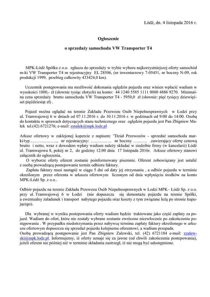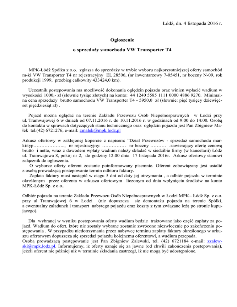 Łódź, dn. 4 listopada 2016 r. Ogłoszenie o sprzedaży samochodu VW Transporter T4 MPK-Łódź Spółka z o.o. zgłasza do sprzedaży w trybie wyboru najkorzystniejszej oferty samochód m-ki VW Transporter T4 nr rejestracyjny EL 28506, (nr inwentarzowy 7-05451, nr boczny N-09, rok produkcji 1999, przebieg całkowity 433424,0 km). Uczestnik postępowania ma możliwość dokonania oględzin pojazdu oraz winien wpłacić wadium w wysokości 1000,- zł (słownie tysiąc złotych) na konto: 44 1240 5585 1111 0000 4886 9270. Minimalna cena sprzedaży brutto samochodu VW Transporter T4 - 5950,0 zł (słownie: pięć tysięcy dziewięćset pięćdziesiąt zł) . Pojazd można oglądać na terenie Zakładu Przewozu Osób Niepełnosprawnych w Łodzi przy ul. Tramwajowej 6 w dniach od 07.11.2016 r. do 10.11.2016 r. w godzinach od 9:00 do 14:00. Osobą do kontaktu w sprawach dotyczących stanu technicznego oraz oględzin pojazdu jest Pan Zbigniew Małek tel.(42) 6721276; e-mail: [email protected] Arkusz ofertowy w zaklejonej kopercie z napisem: ”Dział Przewozów - sprzedaż samochodu marki/typ……………….., nr rejestracyjny: …………… nr boczny ………. .zawierający ofertę cenową brutto i netto, wraz z dowodem wpłaty wadium należy składać w siedzibie firmy (w kancelarii) Łódź ul. Tramwajowa 8, pokój nr 2, do godziny 12:00 dnia 17 listopada 2016r. Arkusz ofertowy stanowi załącznik do ogłoszenia. O wyborze oferty oferent zostanie poinformowany pisemnie. Oferent zobowiązany jest ustalić z osobą prowadzącą postepowanie termin odbioru faktury. Zapłata faktury musi nastąpić w ciągu 5 dni od daty jej otrzymania , a odbiór pojazdu w terminie określonym przez oferenta w arkuszu ofertowym liczonym od dnia wpłynięciu środków na konto MPK-Łódź Sp. z o.o.. Odbiór pojazdu na terenie Zakładu Przewozu Osób Niepełnosprawnych w Łodzi MPK– Łódź Sp. z o.o. przy ul. Tramwajowej 6 w Łodzi (nie dopuszcza się demontażu pojazdu na terenie Spółki, a ewentualny załadunek i transport nabytego pojazdu oraz koszty z tym związane leżą po stronie kupującego). Dla wybranej w wyniku postepowania oferty wadium będzie traktowane jako część zapłaty za pojazd. Wadium do ofert, które nie zostały wybrane zostanie zwrócone niezwłocznie po zakończeniu postępowania . W przypadku niedotrzymania przez nabywcę terminu zapłaty faktury określonego w arkuszu ofertowym dopuszcza się sprzedaż pojazdu kolejnemu oferentowi, a wadium przepada. Osobą prowadzącą postępowanie jest Pan Zbigniew Zalewski, tel. (42) 6721184 e-mail: [email protected]. Informujemy, iż oferty uznaje się za jawne (od chwili zakończenia postepowania), jeżeli oferent nie później niż w terminie składania zastrzegł, iż nie mogą być udostępnione. Arkusz ofertowy Łódź dn. ............................................... .......................................................................................................................................................... imię, nazwisko/nazwa oferenta .......................................................................................................................................................... Adres zamieszkania / adres siedziby podmiotu gospodarczego .............................................................. NIP (oferenta)* .............................................................. KRS/Zaświadczenie o wpisie do ewidencji* 1. Za pojazd będący przedmiotem postępowania : marka i typ: ……………………………, nr. rejestracyjny……………….., nr boczny …………… oferuję kwotę brutto …………. zł co stanowi kwotę netto ………….. zł.. 2. Ponadto oświadczam, co następuje: Osobiście zapoznałem się /nie zapoznałem się ze stanem technicznym pojazdu, który jest przedmiotem mojego zainteresowania i nie będę wnosił zastrzeżeń przy jego odbiorze. W przypadku wybrania mojej oferty, zobowiązuję się do odbioru pojazdu w ciągu ....... dni od daty wpłynięcia środków na konto MPK-Łódź Sp. z o.o. Zobowiązuję się do okazania przy odbiorze pojazdu dowodu zapłaty kwoty widniejącej na fakturze. .................................................. Podpis oferenta * dotyczy podmiotów gospodarczych