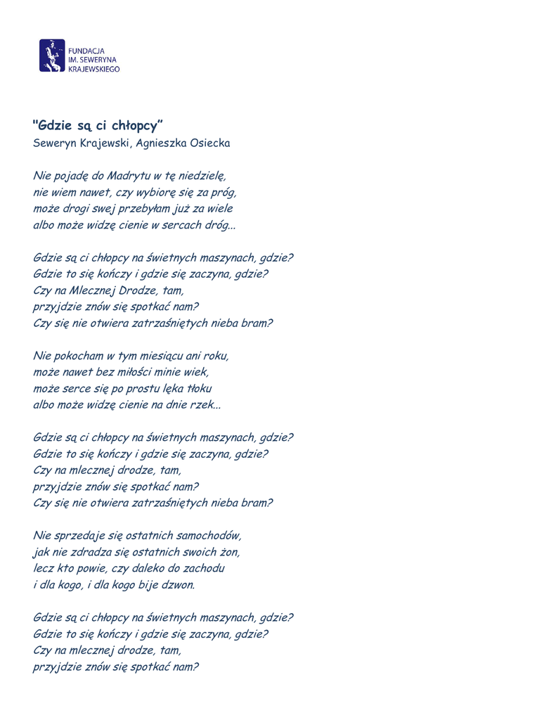 "Gdzie są ci chłopcy” Seweryn Krajewski, Agnieszka Osiecka Nie pojadę do Madrytu w tę niedzielę, nie wiem nawet, czy wybiorę się za próg, może drogi swej przebyłam już za wiele albo może widzę cienie w sercach dróg... Gdzie są ci chłopcy na świetnych maszynach, gdzie? Gdzie to się kończy i gdzie się zaczyna, gdzie? Czy na Mlecznej Drodze, tam, przyjdzie znów się spotkać nam? Czy się nie otwiera zatrzaśniętych nieba bram? Nie pokocham w tym miesiącu ani roku, może nawet bez miłości minie wiek, może serce się po prostu lęka tłoku albo może widzę cienie na dnie rzek... Gdzie są ci chłopcy na świetnych maszynach, gdzie? Gdzie to się kończy i gdzie się zaczyna, gdzie? Czy na mlecznej drodze, tam, przyjdzie znów się spotkać nam? Czy się nie otwiera zatrzaśniętych nieba bram? Nie sprzedaje się ostatnich samochodów, jak nie zdradza się ostatnich swoich żon, lecz kto powie, czy daleko do zachodu i dla kogo, i dla kogo bije dzwon. Gdzie są ci chłopcy na świetnych maszynach, gdzie? Gdzie to się kończy i gdzie się zaczyna, gdzie? Czy na mlecznej drodze, tam, przyjdzie znów się spotkać nam? Czy się nie otwiera zatrzaśniętych nieba bram? Czy na mlecznej drodze, tam, przyjdzie znów się spotkać nam? Czy się nie otwiera zatrzaśniętych nieba bram?
