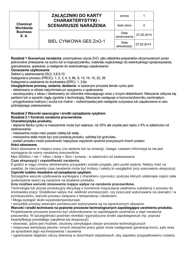 Chemical Worldwide Business S. A. ZAŁĄCZNIKI DO KARTY CHARAKTERYSTYKI SCENARIUSZE NARAŻENIA strona 1 Ilość stron 4 Data 27.05.2014 opracowania BIEL CYNKOWA GES ZnO-1 Data 27.05.2014 aktualizacji: Rozdział 1 Scenariusz narażenia: przemysłowe użycie ZnO, jako składnika preparatów otrzymywanych przez jednorodne zmieszanie na sucho lub w rozpuszczalniku, materiału wyjściowego do ewentualnego sprasowywania, granulowania, spiekania, a następnie do ewentualnego zapakowania. Oznaczenie użytkowania Sektor/-y zastosowania (SU): 3,8,9,10 Kategoria/-e procesu (PROC): 1, 2, 3, 4, 5, 8b, 9, 13, 14, 15, 22, 26 Kategoria/-e uwalniania do środowiska (ERC): 1, 2,6a Uwzględnione procesy, zadania, działania: w opisanym procesie tlenek cynku jest: - składowany w silosie natychmiast po wysypaniu z opakowania - zaczerpywany z silosu i dawkowany do zbiornika mieszającego wraz z innymi składnikami. Mieszanie odbywa się partiami lub w sposób ciągły zgodnie z technologią. Mieszanie następuje w komorze/zbiorniku zamkniętym. - przygotowana matryca ( sucha lub mokra – roztwór/pasta) jest następnie zużywana lub zapakowana w celu późniejszego zastosowania. Rozdział 2 Warunki operacyjne i środki zarządzania ryzykiem Rozdział 2.1 Kontrola narażenia pracowników. Charakterystyka produktu. - stężenie tlenku cynku w mieszaninie może być większe, niż 25% ale zwykle jest rzędu ≤ 5% w zależności od zastosowania - mieszanina może mieć postać ciekłą lub stałą - mieszanina stała może być pod postacią proszku, szklistą lub granulatu. - postać proszku może powodować najwyższe zapylenie spośród powyższych trzech postaci Ilości stosowane. Ilości stosowane w miejscu pracy (na zadanie lub na zmianę); Uwaga: czasami informacja ta nie jest wymagana do oceny narażenia pracowników. Max 5000ton / rok = 14ton / dobę = 5ton / zmianę - w zależności od zastosowania Czas ekspozycji i częstotliwość narażenia. 8 godzin w ciągu zmiany (ekstremalny przypadek) zostało przyjęte, jako punkt wyjścia. Należy mieć na uwadze, że rzeczywisty czas narażenia może być krótszy i należy to uwzględnić przy szacowaniu ekspozycji. Czynniki ludzkie niezależne od zarządzania ryzykiem. Szczególne warunki użytkowania wynikające z charakteru czynności, podczas których odsłonięte części ciała (potencjalnie twarz) są narażone na działanie produktu. Inne możliwe warunki stosowania mające wpływ na narażenie pracowników. Technologia lub proces produkcyjny decydują o momencie rozpoczęcia uwalnianiu substancji z procesu do środowiska pracy. Dodatkowo wpływ ma: wielkość pomieszczeń, czy praca jest wykonywana na zewnątrz / w pomieszczeniu, warunki procesu związane z temperaturą i ciśnieniem. • Mogą wystąpić skoki wysokotemperaturowe; • wszystkie procesy wewnątrz pomieszczeń wykonywane są na ograniczonym obszarze. Warunki i środki techniczne na poziomie procesów technologicznych zapobiegające uwolnieniu produktu. Projektowanie procesów powinno być ukierunkowane na zapobieganie uwolnieniu a stąd narażenia pracownika. W szczególności powinien określać rygorystyczne środki zapobiegawcze (np. poprzez kwantyfikację powstałego zapylenia lub ekspozycji). • stosować, gdzie jest możliwe, obudowy zamykające obszar procesów technologicznych • miejscowa wentylacja pieców i innych obszarów pracy gdzie może następować generacja kurzu, pyłu wraz ze sposobami jego wychwytywania i usuwania • ograniczanie objętości cieczy zbieranej w zbiornikach odpadowych, aby zapobiec przypadkowemu rozlaniu Chemical Worldwide Business S. A. ZAŁĄCZNIKI DO KARTY CHARAKTERYSTYKI SCENARIUSZE NARAŻENIA strona 2 Ilość stron 4 Data 27.05.2014 opracowania BIEL CYNKOWA GES ZnO-1 Data 27.05.2014 aktualizacji: Warunki i środki techniczne ograniczające rozchodzenie się czynnika szkodliwego ze źródła powstania w kierunku pracownika. Zabezpieczenia techniczne: na przykład wentylacja wyciągowa lub ogólna wentylacja z określeniem jej skuteczności – w najgorszym przypadku skuteczność powinna być 84%, wysokoefektywna na poziomie 9095%. Cyklony/filtry do minimalizacji emisji pyłów: cyklony – efektywność 70-90%, filtry pyłowe – efektywność 50-80%, dwustopniowe filtry kasetowe – efektywność 85-95%. • Ograniczenie przestrzeni obudowami zwłaszcza w przypadku procesów sprzyjających powstawaniu pyłów tj. suszenie, kalcynacja, pakowanie. • kontrola zapylenia i cynku w pyle musi być mierzone w powietrzu w miejscu pracy (statyczna lub indywidualna), • Specjalną troską objąć czystość środowiska pracy w całym zakładzie poprzez np. czyszczenie urządzeń procesowych i warsztatów, przechowywanie zapakowanego produktu w wydzielonych strefach. Środki organizacyjne zapobiegające / ograniczające uwolnienie, rozprzestrzenianie i narażenie Na ogół zintegrowane systemy zarządzania jakością np ISO 9000, ISO 13100 ICS lub podobne, często zgodne z IPPC, wdrożone w firmie obejmują ogólne zasady higieny przemysłowej: - informowanie i szkolenie pracowników na temat zapobiegania ekspozycji / wypadkom, - procedury do kontroli narażenia osobistego (środki higieny), - regularne czyszczenie sprzętu i podłogi, udzielanych pracownikom instrukcji, - procedury dotyczące procesu kontroli i konserwacji, - środki ochrony indywidualnej (patrz poniżej). Warunki i środki związane z ochroną osobistą, higieną i oceną zdrowia Używane środki ochrony indywidualnej ( rękawice, ochrony twarzy, ochrony skóry całego ciała) powinny posiadać określoną skuteczność, być wykonane z właściwego materiału (jeśli dotyczy) i mieć określony czas użytkowania (jeśli dotyczy). Noszenie rękawic i odzieży ochronnej jest obowiązkowe (efektywność ≥ 90%). Przy normalnym użytkowaniu, nie jest potrzebna ochrona indywidualna dróg oddechowych (aparat oddechowy) Jeśli zaistnieje ryzyko przekroczenia OEL / DNEL, należy uż
