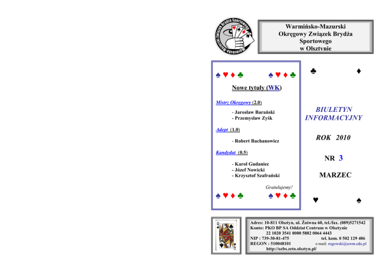 Warmińsko-Mazurski Okręgowy Związek Brydża Sportowego w Olsztynie ♠♥♦♣ ♠♥♦♣ ♣ ♦ Nowe tytuły (WK) Mistrz Okręgowy (2.0) - Jarosław Barański - Przemysław Zyśk BIULETYN INFORMACYJNY Adept (1.0) - Robert Bachanowicz ROK 2010 Kandydat (0.5) NR 3 - Karol Gudaniec - Józef Nowicki - Krzysztof Szafrański MARZEC Gratulujemy! ♠♥♦♣ ♠♥♦♣ ♥ ♠ Adres: 10-811 Olsztyn, ul. Żniwna 60, tel./fax. (089)5271542 Konto: PKO BP SA Oddział Centrum w Olsztynie 22 1020 3541 0000 5802 0064 4443 NIP : 739-30-81-475 tel. kom. 0 502 129 406 REGON : 510048101 e-mail: [email protected] http://ozbs.zeto.olsztyn.pl/ Biuletyn Informacyjny W-M OZBS Nr. 3 1 % Jest czas rozliczeń z fiskusem. Polski Związek Brydża Sportowego jest organizacją pożytku publicznego, a to oznacza, że można wesprzeć działalność PZBS poprzez wpłatę 1% swoich podatków na rzecz PZBS. Uzyskane pieniądze zostaną podzielone – 50% wpłaty będzie wykorzystane przez PZBS, przede wszystkim na rozwój brydża młodzieżowego, a 50% wpłaty wróci do naszego WM OZBS. Przypominamy, że… …do 25 lutego br. należało wnieść pełną składkę opłat członkowskich indywidualnych (za rok 2010) i od drużyn (za sezon 2009/2010). Dziękujemy wszystkim tym, którzy terminowo wywiązali się z tego obowiązku (i jest to zdecydowana większość naszych członków), a pozostałych prosimy o niezwłoczne uregulowanie należności. 2 Marzec 2010 Biuletyn Informacyjny W-M OZBS Nr. 3 Wesołego Alleluja! Wesołego Alleluja! Wesołych i Pogodnych Świąt Wielkanocnych wszystkim zawodnikom, działaczom, sponsorom i sympatykom brydża sportowego życzy Zarząd W-M OZBS Wesołego Alleluja! Wesołego Alleluja! Marzec 2010 3 Biuletyn Informacyjny W-M OZBS Nr. 3 Drużynowy Puchar Województwa 2010 W dalszej części Biuletynu podajemy Regulamin tegorocznego DPW. Zapraszamy do zgłaszania drużyn – oprócz nazwy i składu drużyny prosimy podawać w zgłoszeniu kontakt telefoniczny z kapitanem drużyny. ♣♣ TURNIEJE ♦♦♦♦♦ WYNIKI ♣♣ XIII Międzynarodowy Kongres „Żuławski” im. Mirosława Wołka, Elbląg, 19-21.02.2010r. I tym razem Hotel Gromada w Elblągu gościł rekordową ilość uczestników Kongresu Żuławskiego (był to również rekord w ilości startujących w imprezie organizowanej na Warmii i Mazurach). Kongres był bardzo udaną imprezą pod wieloma względami. Zastały dotrzymane standardy organizacyjne z lat ubiegłych i doszły nowe pomysły, np. recital piosenkarski w oczekiwaniu na ceremonię zakończenia. Należą się więc ogromne słowa podziękowania organizatorom Kongresu, którego przygotowaniem i przebiegiem kierował prezes ESBS Bogusław Gierulski, a w gronie osób, z których wsparcia korzystał przy rozwiązywaniu organizacyjnych problemów, znaleźli się między innymi: Regina Wołek, Henryk Łęcki, Marek Serdyński, Ryszard Stolarowicz. Współorganizatorem Kongresu było Centrum Spotkań Europejskich „Światowid” w Elblągu. Patronem Kongresu był Marszałek Województwa WarmińskoMazurskiego Jacek Protas. Wzorem lat ubiegłych aktywnego wsparcia imprezie udzielili elbląscy parlamentarzyści, władze Elbląga oraz liczni sponsorzy. Serdecznie dziękujemy wszystkim współtwórcom tej bardzo udanej imprezy! Kongresowy Turniej Teamów (41 teamów) o Puchar Posła RP Tadeusza Naguszewskiego 1. T Kaczanowski, K Omernik, R Szczepański, T Osiński WP/KP 2. P Jassem, L Kwiatkowski, A Machno, P Piotrowski WP/LB/MP/PM 3. J Bakuła, S Dytkowski, G Lasocki, E Reczuga 48 pkl 5. M Cichocki, B Gierulski, P Janiszewski, K Pikus 36 J Skrzypczak, L Sztyrak 20. A Fronczak, J Sukow, M Brewiak, A Stasiak /PM/LB 2 4 Marzec 2010 Biuletyn Informacyjny W-M OZBS Nr. 3 I Kongresowy Turniej Par, cav. uśr. (116 par) o Puchar Posła RP Witolda Gintowt-Dziewałtowskiego imp 1. M Barylewski – W Radziak MA 2. B Małysz – B Ostrowski PM 3. M Nowosadzki - P Wiankowski LU 11. A Fronczak - J Sukow 15. M Bartoszewski – T Sinkiewicz 16. J Ciruk – W Bobrek 17. R Łasowski – Tomasz Kuś 27. G Deptuła – M Makatrewicz 31. Z Łukaszuk – D Prawdzik 34. J Janiak – K Pakuła 40. A Bocheński – J Janowski MA/SW 47. G Probola – J Rogowski 49. R Błoński – M Sarnowski 51. M Lichocki – I Iwanow 55. A Cydejko – J Stańczak 57. Z Krzepkowski – B Jabłoński 66,45 62,34 60,22 39,22 36,59 33.58 35,10 25,10 24,23 22,04 15,24 10,34 9,54 8,52 3,78 2,58 pkl pdf-GPW-B1 29 23 21 20 9 8 7 5 4 3 3 2 1 35 33 31 29 28 27 26 25 24 23 22 21 II Kongresowy Turniej Par (188 par) Z cyklu Budimex Grand Prix Polski 2010 o Puchar Posła RP Leonarda Krasulskiego 1. T Kaczanowski – K Omernik WP 2. K Szwenkel – T Woźniak KP 3. P Lutostański – M Krupowicz MA 7. J Ciruk – W Bobrek 25. L Sztyrak - P Janiszewski 41. A Bocheński – J Janowski MA/SW 49. G Lasocki – E Reczuga 57. M Cichocki – K Pikus 58. B Gierulski – J Skrzypczak 62. R Karp – J Kowalówka 63. D Hocheker - Z Rogowski 78. G Probola – J Rogowski 83. J Kamiński – Z Ziemba 89. J Łosiak – S Wrzosek 93. A Fronczak - J Sukow 95. S Bohut – Z Nowak Marzec 2010 % 63.73 63.00 62.90 61.06 55.90 54.32 53.87 53.09 53.06 52.85 52.84 51,52 51.32 50.62 50.39 50.18 pkl pdf GPW-A 171 97 39 33 27 27 24 23 13 9 5 2 86 84 82 80 78 76 74 72 70 68 66 64 62 5 Biuletyn Informacyjny W-M OZBS Nr. 3 III Kongresowy Turniej Par, (121 par) o Puchar Senatora RP Stanisława Gorczycy 1. R Szczepański – T Osiński KP 2. P Klimacki – D Koproń LU 3. S Młynarczuk – W Tomaszek MA 16. A Fronczak - J Sukow 18. M Lichocki – I Iwanow 20. R Błoński – M Sarnowski 28. L Sztyrak - P Janiszewski 29. G Deptuła – M Makatrewicz 30. A Bocheński – J Janowski MA/SW 33. R Karp – J Kowalówka 43. B Jabłoński – Z Nowak 54. J Przyborowski – P Greń 57. A Cydejko – J Stańczak % 63,82 62.92 62.31 57,58 57.21 57.02 54.83 54.52 54.46 53.90 52.67 51.41 51.04 pkl pdf GPW-B1 25 22 18 10 9 9 8 5 3 2 36 34 32 30 29 28 27 26 25 24 Punkt