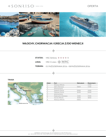 OFERTA WŁOCHY, CHORWACJA I GRECJA Z/DO WENECJI STATEK: MSC Sinfonia LINIA: MSC Cruises TERMIN: 01 PAŹDZIERNIKA 2016 – 08 PAŹDZIERNIKA 2016 TRASA Dzień 1 2 3 4 4 5 6 7 8 Port Wenecja, Włochy Split, Chorwacja dzień na morzu Santorini, Grecja Mykonos, Grecja dzień na morzu Dubrownik, Chorwacja Ancona, Włochy Wenecja, Włochy Wpłynięcie 08:00 09:00 20:00 13:00 10:00 08:00 SONRISO | Lipiński Passage | Al. Jero zo limskie 61 | 00-697 Warszawa tel. +48 22 206 45 00 | fax. +48 22 100 14 61 | e-mail: biuro @so nriso .pl | web: www.so nriso .pl Wypłynięcie 17:00 17:00 15:00 02:00 19:00 18:00 - OFERTA CENA Typ kabiny Cena z osobę Kabina wewnętrzna od 579 EUR Kabina z oknem od 679 EUR Kabina z balkonem od 879 EUR Apartament z balkonem od 1 029 EUR CENA ZAWIERA DOTATKOWE OPŁATY zakwaterowanie w 2 - os. kabinie wybranej kategorii pełne wyżywienie: 3 posiłki, przekąski między posiłakmi, bufet o północy napoje: woda stołowa, kawa, herbata oraz sok do śniadania dostępne 24 h w restauracji bufetowej oraz w restauracji głównej wyłącznie podczas śniadań serwis bagażowy podczas wejścia i zejścia ze statku 24 godzinny serwis kabinowy korzystanie z urządzeń sportowo - rekreacyjnych dostępnych na pokładzie (baseny, jacuzzi, boiska sportowe, kluby dla dzieci i młodzieży itp.) udział we wszystkich imprezach organizowanych na pokładzie (przedstawienia, pokazy, aukcje, animacje i inne) dojazd/przelot do portu rozpoczęcia i zakończenia rejsu transfery (lotnisko - port - lotnisko) ewentualne noclegi przed lub po rejsie wycieczki fakultatywne napoje: bezalkoholowe, alkoholowe, woda mineralna dostępne w restauracjach i barach (istnieje możliwość wykupienia pakietów napojów, o szczegóły zapytaj w biurze) korzystanie z mini baru w kabinie korzystanie z usług typu: SPA, salon piękności, pralnia itp. wydatki osobiste tj. zakupy w butikach, internet, kasyno itp. obowiązkowe opłaty portowe obowiązkowa opłata serwisowa (napiwki dla obsługi statku ok.8,5 EUR/os. dorosła/dzień, dzieci poniżej 3 lat nie płacą) obowiązkowe ubezpieczenie turystyczne koszt wymaganych wiz ewentualna opłata paliwowa (linia w momencie wzrotu cen ropy zastrzega sobie prawo do dodania oplaty paliwowej do każdej rezerwacji) Na życzenie świadczymy dodatkowo usługi: rezerwacje hotelowe na całym świecie rezerwacje biletów lotniczych, trasferów oraz parkingu w porcie rezerwacje wycieczek fakultatywnych i innych atrakcji SONRISO | Lipiński Passage | Al. Jero zo limskie 61 | 00-697 Warszawa tel. +48 22 206 45 00 | fax. +48 22 100 14 61 | e-mail: biuro @so nriso .pl | web: www.so nriso .pl