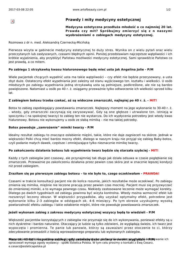 2017-03-08 22:05 www.artofbeauty.com.pl 1/2 Prawdy i mity medycyny estetycznej Medycyna estetyczna przedłuża młodość o co najmniej 20 lat. Prawda czy mit? Spróbujmy zmierzyć się z n naszymi wyobrażeniami o zabiegach medycyny estetycznej. Rozmowa z dr n. med. Aleksandrą Czernecką-Micińską Pierwsza wizyta w gabinecie medycyny estetycznej to duży stres. Wynika on z wielu pytań oraz wielu przeczytanych lub zasłyszanych, czasami błędnych opinii. Poniżej przedstawiam najczęstsze wątpliwości i ich krótkie wyjaśnienia, aby przybliżyć Państwu możliwości medycyny estetycznej. Sami sprawdźcie Państwo co jest prawdą, a co mitem. Po zabiegu 1 strzykawką kwasu hialuronowego będę mieć usta jak Angelina Jolie - P/M Wiele pacjentek chcących wypełnić usta ma takie wątpliwości – czy efekt nie będzie przerysowany, a usta zbyt duże. Ostateczny efekt wypełniania jest zależny od stanu wyjściowego tzn. kształtu i wielkości. U osób młodszych po zabiegu wypełniania jedną strzykawką usta są pełniejsze, podkreślone, ale nie są bardzo powiększone. Natomiast u osób po 40 r. ż. osiągamy przeważnie tylko odtworzenie ich wielkości sprzed kilku lat. Z zabiegiem botoxu trzeba czekać, aż są widoczne zmarszczki, najlepiej po 40 r. ż. - MIT! Botox to zabieg zapobiegający powstawaniu zmarszczek. Najlepszy moment na jego wykonanie to 30-40 r. ż. – wtedy, gdy zmarszczki zaczynają się zarysowywać. Gdy są one głębsze i utrwalone tzn. istnieją w spoczynku ( na spokojnej twarzy) to zabieg ten nie wystarcza. Do ich wypłycenia potrzebny jest wtedy kwas hialuronowy. Botoxu nie wykonujemy u osób ze słabą mimiką – nie ma takiej potrzeby. Botox powoduje „zamrożenie” mimiki twarzy - P/M Idealny rezultat zabiegu to znaczące osłabienie mięśni, takie, które nie daje zagnieceń na skórze. Jednak w większości Polki chcą mieć bardzo mocny efekt, dlatego w naszym kraju nie przyjął się zabieg Baby-botox, czyli podanie małych dawek, częstsze i zmniejszające tylko nieznacznie mimikę twarzy. Po zakończeniu działania botoxu lub wypełnienia twarz będzie się starzała szybciej - MIT! Każdy z tych zabiegów jest czasowy, ale przynajmniej tak długo jak działa odsuwa w czasie pogłębianie się zmarszczek. Przeważnie po zakończeniu działania przez pewien czas skóra jest w znacznie lepszej kondycji niż przed zabiegiem. Zraziłam się po pierwszym zabiegu botoxu – to nie było to, czego oczekiwałam - PRAWDA! Czasami w trakcie konsultacji pacjent nie do końca rozumie, jakich rezultatów może oczekiwać. Po zabiegu zmienia się mimika, mięśnie nie leczone pracują przez pewien czas mocniej. Pacjent musi się przyzwyczaić do zmienionej mimiki, a to wymaga pewnego czasu. Niekiedy zastosowane leczenie może wymagać korekty. Dlatego po dwóch tygodniach od zabiegu powinna być wizyta kontrolna. Wtedy można wzmocnić efekt lub rozszerzyć leczony obszar. W większości przypadków, aby uzyskać optymalny efekt, potrzebne jest wykonanie kilku 2-3 zabiegów w odstępach ok. 4-6 miesięcy. Po tym okresie uzyskujemy wysoką powtarzalność efektu zabiegu i takie osłabienie mięśni, które nie powoduje powstawania zmarszczek. Jeżeli wykonam zabieg z zakresu medycyny estetycznej wszyscy będą to wiedzieli - P/M Większość pacjentów korzystających z zabiegów nie przyznaje się do ich wykonywania, ponieważ efekty są u nich dyskretne i bardzo naturalne. Otaczający je ludzie są tylko zdziwieni, że wyglądają świeżo, ich twarz jest wypoczęta i promienna. Te panie lub panowie, którzy są zauważani przez otoczenie to ci, którzy zdecydowanie przesadzili z ilością wprowadzonego preparatu lub wykonanych zabiegów. Korzystanie z artykułów publikowanych w portalu artofbeauty.com.pl dla celów komercyjnych bądź dokonywanie ich Mam ok. 40 lat i rozpocznę zabiegi, gdy zauważę duże zmiany w swoim wyglądzie - P/M opracowań wymaga zgody wydawcy - spółki Estetica Polska. W tym celu prosimy o kontakt z Ewą Cesarz, [email protected] 2017-03-08 22:05 www.artofbeauty.com.pl 2/2 Pierwsza wizyta w gabinecie medycyny estetycznej powinna się odbyć, gdy stosowane kremy nie spełniają naszych oczekiwań lub mamy problem z ich doborem, czyli najczęściej po 30. roku życia. Może również wynikać z problemów skórnych, takich jak trądzik, przebarwienia, rumień. Warto jednak wiedzieć, że szybciej i bardziej naturalne efekty uzyskamy u osoby 40-letniej, gdy wykonamy zabiegi przeciwdziałające upływowi czasu, niż u osoby 60- letniej, u której będziemy musieli wykonać wiele zabiegów redukujących zaistniałe zmiany. Zmarszczki wynikają z braku stosowania dobrych, czyli drogich kremów przeciwzmarszczkowych - MIT! Nie możemy oczekiwać, że drogi, najlepszy krem przeciwzmarszczkowy da podobne rezultaty jak zabieg botoxu lub wypełniania kwasem hialuronowym. Najważniejszą funkcją dobrego kremu jest ochrona skóry przed przesuszeniem i zapobieganie uszkodzeniom przez promieniowanie słoneczne i inne niekorzystne czynniki . Mam 30 lat i stosuję krem przeciwzmarszczkowy – mimo to skóra wygląda źle - PRAWDA! U tak młodych osób na wygląd skóry ogromny wpływ ma opalanie, palenie papierosów, klimatyzacja, stres, nieprzespane noce, dieta odchudzająca. Żaden krem nie wyrówna tych niedoborów, jeżeli kumulują się w krótkim czasie. W tym wieku skóra powinna być w rewelacyjnej kondycji, gdyż jest to jej kapitał na przyszłość. Dobry krem powinien zawierać antyoksydanty i filtr słoneczny w celu ochrony przed wolnymi rodnikami i niekorzystnymi czynnikami środowiska zewnętrznego. Zabiegi wypełniania zmarszczek byłyby lepsze, gdyby ich efekty były trwałe - MIT! W dziejach medycyny estetycznej wypróbowano już wiele substancji wypełniających, jednak po wypełniaczach trwałych było zdecydowanie więcej powikłań. Również z wiekiem zmienia się kształt, rysy i sprężystość skóry, a więc wyp