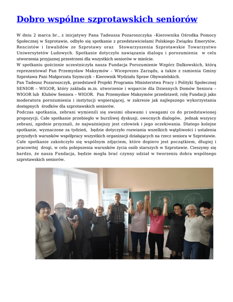 Dobro wspólne szprotawskich seniorów W dniu 2 marca br., z inicjatywy Pana Tadeusza Pozaroszczyka –Kierownika Ośrodka Pomocy Społecznej w Szprotawie, odbyło się spotkanie z przedstawicielami Polskiego Związku Emerytów, Rencistów i Inwalidów ze Szprotawy oraz Stowarzyszenia Szprotawskie Towarzystwo Uniwersytetów Ludowych. Spotkanie dotyczyło nawiązania dialogu i porozumienia w celu utworzenia przyjaznej przestrzeni dla wszystkich seniorów w mieście. W spotkaniu gościnnie uczestniczyła nasza Fundacja Porozumienie Wzgórz Dalkowskich, którą reprezentował Pan Przemysław Maksymów – Wiceprezes Zarządu, a także z ramienia Gminy Szprotawa Pani Małgorzata Szymczyk – Kierownik Wydziału Spraw Obywatelskich. Pan Tadeusz Pozaroszczyk, przedstawił Projekt Programu Ministerstwa Pracy i Polityki Społecznej SENIOR – WIGOR, który zakłada m.in. utworzenie i wsparcie dla Dziennych Domów Seniora – WIGOR lub Klubów Seniora – WIGOR. Pan Przemysław Maksymów przedstawił, rolę Fundacji jako moderatora porozumienia i instytucji wspierającej, w zakresie jak najlepszego wykorzystania dostępnych środków dla szprotawskich seniorów. Podczas spotkania, zebrani wymienili się swoimi obawami i uwagami co do przedstawionej propozycji. Całe spotkanie przebiegło w burzliwej dyskusji, owocnych dialogów, jednak wszyscy zebrani, zgodnie przyznali, że najważniejszy jest człowiek i jego oczekiwania. Dlatego kolejne spotkanie, wyznaczone za tydzień, będzie dotyczyło rozwiania wszelkich wątpliwości i ustalenia przyszłych warunków współpracy wszystkich organizacji działających na rzecz seniora w Szprotawie. Całe spotkanie zakończyło się wspólnym zdjęciem, które dopiero jest początkiem, długiej i pracowitej drogi, w celu polepszenia warunków życia osób starszych w Szprotawie. Cieszymy się bardzo, że nasza Fundacja, będzie mogła brać czynny udział w tworzeniu dobra wspólnego szprotawskich seniorów.