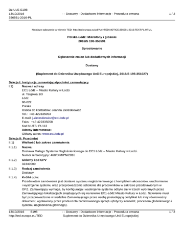 Dz.U./S S198 13/10/2016 356591-2016-PL - - Dostawy - Dodatkowe informacje - Procedura otwarta 1/2 Niniejsze ogłoszenie w witrynie TED: http://ted.europa.eu/udl?uri=TED:NOTICE:356591-2016:TEXT:PL:HTML Polska-Łódź: Mikrofony i głośniki 2016/S 198-356591 Sprostowanie Ogłoszenie zmian lub dodatkowych informacji Dostawy (Suplement do Dziennika Urzędowego Unii Europejskiej, 2016/S 195-351027) Sekcja I: Instytucja zamawiająca/podmiot zamawiający I.1) Nazwa i adresy EC1 Łódź – Miasto Kultury w Łodzi ul. Targowa 1/3 Łódź 90-022 Polska Osoba do kontaktów: Joanna Zieleśkiewicz Tel.: +48 422335053 E-mail: [email protected] Faks: +48 422335058 Kod NUTS: PL113 Adresy internetowe: Główny adres: www.ec1lodz.pl Sekcja II: Przedmiot II.1) Wielkość lub zakres zamówienia II.1.1) Nazwa: Dostawa Małego Systemu Nagłośnieniowego do EC1 Łódź – Miasto Kultury w Łodzi. Numer referencyjny: 460/DIM/PN/2016 II.1.2) Główny kod CPV 32340000 II.1.3) Rodzaj zamówienia Dostawy II.1.4) Krótki opis: Przedmiotem zamówienia jest dostawa systemu nagłośnieniowego z kompletem akcesoriów, uruchomienie i wystrojenie systemu oraz przeprowadzenie szkolenia dla pracowników w zakresie przedstawionym w OPZ. Zamawiający wymaga, by konfiguracja i wystrojenie systemu odbyło się w trzech wybranych przez Zamawiającego lokalizacjach znajdujących się na terenie EC1-Łódź Miasto Kultury w Łodzi. Szkolenie musi być przeprowadzone w siedzibie Zamawiającego przez osobę posiadającą certyfikat lub inny równoważny dokument, wystawiony przez producenta zaoferowanego sprzętu (dotyczy konsolet, procesora głośnikowego i systemu nagłośnienia głównego). 13/10/2016 S198 http://ted.europa.eu/TED - - Dostawy - Dodatkowe informacje - Procedura otwarta Suplement do Dziennika Urzędowego Unii Europejskiej 1/2 Dz.U./S S198 13/10/2016 356591-2016-PL - - Dostawy - Dodatkowe informacje - Procedura otwarta 2/2 Sekcja VI: Informacje uzupełniające VI.5) Data wysłania niniejszego ogłoszenia: 10/10/2016 VI.6) Numer pierwotnego ogłoszenia Numer ogłoszenia w Dz.Urz. UE – OJ/S: 2016/S 195-351027 Sekcja VII: Zmiany VII.1) Informacje do zmiany lub dodania VII.1.2) Tekst, który należy poprawić w pierwotnym ogłoszeniu Numer sekcji: IV.2.2 Miejsce, w którym znajduje się tekst do modyfikacji: IV.2.2) Termin składania ofert lub wniosków o dopuszczenie do udziału Zamiast: Data: 16/11/2016 Czas lokalny: 11:00. Powinno być: Data: 17/11/2016 Czas lokalny: 11:00. Numer sekcji: IV.2.7 Miejsce, w którym znajduje się tekst do modyfikacji: IV.2.7) Warunki otwarcia ofert Zamiast: Data: 16/11/2016 Czas lokalny: 11:10 Miejsce: EC1-Łódź Miasto Kultury w Łodzi. Powinno być: Data: 17/11/2016 Czas lokalny: 11:10 Miejsce: EC1-Łódź Miasto Kultury w Łodzi. VII.2) Inne dodatkowe informacje: 13/10/2016 S198 http://ted.europa.eu/TED - - Dostawy - Dodatkowe informacje - Procedura otwarta Suplement do Dziennika Urzędowego Unii Europejskiej 2/2