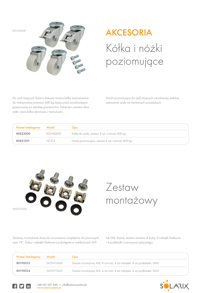 akcesoria KOL-HD600 Kółka i nóżki poziomujące Do szaf stojących Solarix dokupić można kółka dostosowane do maksymalnej nośności 600 kg (statycznie) umożliwiające przesuwanie po płaskiej powierzchni. Pakiet ten zawiera dwa stałe i dwa kółka obrotowe z hamulcami. Nóżki poziomujące do szaf stojących umożliwiają stabilne ustawienie szafy na nierównych posadzkach. Numer katalogowy Model Opis 80823000 KOL-HD600 Kółka do szafy, zestaw 4 szt, nośność 600 kg 80821001 NOZ-4 Nóżki poziomujące, zestaw 4 szt, nośność 400 kg Zestaw montażowy MONT-SM6 Zestawy montażowe służą do mocowania urządzenia do pionowych szyn 19". Śruby i nakrętki klatkowe są dostępne w wielkościach M5 lub M6. Każdy zestaw zawiera 4 śruby, 4 nakrętki klatkowe i 4 podkładki z tworzywa sztucznego. Numer katalogowy Model Opis 80190033 MONT-SM6 Zestaw montażowy M6, 4 szt śrub, 4 szt nakrętek, 4 szt podkładek, SM6 80190034 MONT-SM5 Zestaw montażowy M5, 4 szt śrub, 4 szt nakrętek, 4 szt podkładek, SM5 +48 221 021 560 • [email protected] www.solarixsystem.pl
