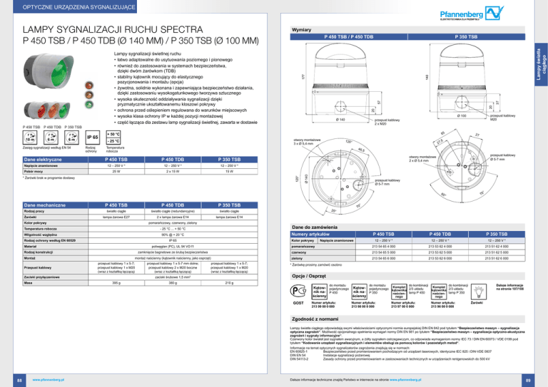 Optyczne urządzenia sygnalizujące Zasięg sygnalizacji według EN 54 Dane elektryczne Napięcie znamionowe Pobór mocy IP 65 Rodzaj ochrony Lampy światła ciągłego 177 P 350 TSB 20 37 57 20 55 + 50 °C otwory montażowe 3 x Ø 5,4 mm - 25 °C Temperatura robocza ,5 120° 27 P 450 TSB P 450 TDB P 350 TSB 12 – 250 V * 12 – 250 V * 12 – 250 V * 25 W 2 x 15 W 15 W przepust kablowy Ø 5-7 mm otwory montażowe 2 x Ø 5,4 mm przepust kablowy Ø 5-7 mm 60 ° Rodzaj pracy Żarówki P 450 TSB P 450 TDB P 350 TSB światło ciągłe światło ciągłe (redundancyjne) światło ciągłe 2 x lampa żarowa E14 lampa żarowa E14 lampa żarowa E27 Kolor pokrywy pomarańczowy, czerwony, zielony Temperatura robocza - 25 °C ... + 50 °C Wilgotność względna 90% @ + 20 °C Rodzaj ochrony według EN 60529 Materiał Rodzaj konstrukcji Przepust kablowy Zaciski przyłączeniowe Masa Numery artykułów P 450 TSB P 450 TDB 12 – 250 V * 12 – 250 V * 12 – 250 V * pomarańczowy 213 54 65 4 000 213 53 62 4 000 213 51 62 4 000 czerwony 213 54 65 5 000 213 53 62 5 000 213 51 62 5 000 zielony 213 54 65 6 000 213 53 62 6 000 213 51 62 6 000 Kolor pokrywy poliwęglan (PC), UL 94 VO f1 przepust kablowy 1 x 5-7 mm dolne; przepust kablowy 2 x M20 boczne (wraz z kształtką łączącą) przepust kablowy 1 x 5-7; przepust kablowy 1 x M20 (wraz z kształtką łączącą) zaciski śrubowe 1,5 mm2 395 g ° 380 g 70 25° IP 65 montaż naścienny (kątownik naścienny, jako osprzęt) przepust kablowy 1 x 5-7; przepust kablowy 1 x M20 (wraz z kształtką łączącą) ° 75 Dane do zamówienia zamknięcie bagnetowe ze śrubą bezpieczeństwa Montaż 27 46,5 * Żarówki brak w programie dostawy Dane mechaniczne przepust kablowy M20 Ø 100 przepust kablowy 2 x M20 Ø 140 r= 6m Ø 140 120° r= 6m P 450 TSB / P 450 TDB Lampy sygnalizacji świetlnej ruchu • łatwo adaptowalne do usytuowania poziomego i pionowego • również do zastosowania w systemach bezpieczeństwa, dzięki dwóm żarówkom (TDB) • stabilny kątownik mocujący do elastycznego pozycjonowania i montażu (opcja) • żywotna, solidnie wykonana i zapewniająca bezpieczeństwo działania, dzięki zastosowaniu wysokogatunkowego tworzywa sztucznego • wysoka skuteczność oddziaływania sygnalizacji dzięki pryzmatycznie ukształtowanemu kloszowi pokrywy • ochrona przed oślepieniem regulowana do warunków miejscowych • wysoka klasa ochrony IP w każdej pozycji montażowej • część łącząca dla zestawu lamp sygnalizacji świetlnej, zawarta w dostawie P 450 TSB P 450 TDB P 350 TSB r= 10 m Wymiary 140 Lampy sygnalizacji ruchu SPECTRA P 450 TSB / P 450 TDB (Ø 140 mm) / P 350 TSB (Ø 100 mm) Napięcie znamionowe P 350 TSB * Żarówkę prosimy zamówić osobno Opcje / Osprzęt 210 g do montażu do montażu do kombinacji Kątow- pojedynczego Kątow- pojedynczego Komplet 2/3 układu kątownika nik na- P 450 nik na- P 350 naścien- lamp P 450 ścienny ścienny nego GOST Numer artykułu: 213 99 00 0 000 Numer artykułu: 213 98 00 0 000 Numer artykułu: 213 97 00 0 000 Dalsze informacje na stronie 107/108 do kombinacji Komplet kątownika 2/3 układu naścien- lamp P 350 nego Numer artykułu: 213 96 00 0 000 Żarówki Zgodność z normami Lampy światła ciągłego odpowiadają swymi właściwościami optycznymi normie europejskiej DIN EN 842 pod tytułem “Bezpieczeństwo maszyn – sygnalizacja optyczna zagrożeń“. Możliwość opcjonalnego spełnienia wymagań normy DIN EN 981 po tytułem “Bezpieczeństwo maszyn – sygnalizacja optyczno-akustyczna zagrożeń i sygnały informacyjne“. Czerwony kolor świateł jest sygnałem awaryjnym, a żółty sygnałem ostrzegawczym, co odpowiada wymaganiom normy IEC 73 / DIN EN 60073 / VDE 0199 pod tytułem “Kodowanie urządzeń sygnalizacyjnych i elementów obsługi za pomocą kolorów i pozostałych metod“. Informacje na temat optycznych sygnalizatorów zagrożenia znajdują się w normach: EN 60825-1 Bezpieczeństwo przed promieniowaniem pochodzącym od urządzeń laserowych, identyczne IEC 825 i DIN-VDE 0837 DIN EN 54Instalacje sygnalizacji pożarowej DIN 54113-2Zasady ochrony przed promieniowaniem w zastosowaniach technicznych w urządzeniach rentgenowskich do 500 kV 88 www.pfannenberg.pl Dalsze informacje techniczne znajdą Państwo w internecie na stronie www.pfannenberg.pl 89