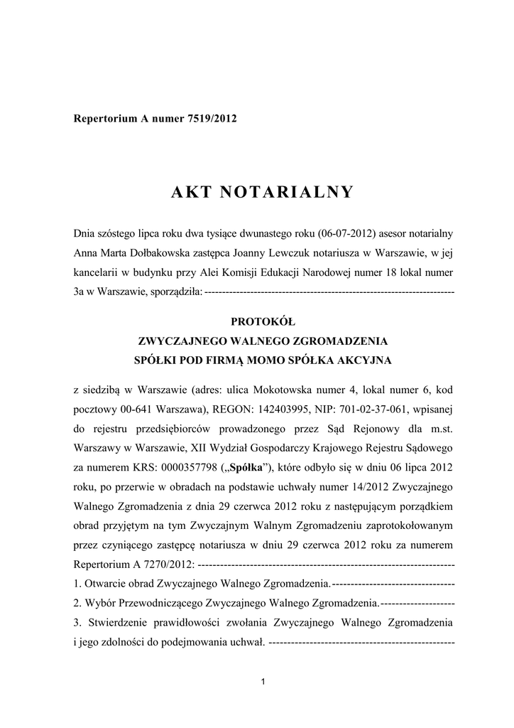 Repertorium A numer 7519/2012 AK T NO TAR IALN Y Dnia szóstego lipca roku dwa tysiące dwunastego roku (06-07-2012) asesor notarialny Anna Marta Dołbakowska zastępca Joanny Lewczuk notariusza w Warszawie, w jej kancelarii w budynku przy Alei Komisji Edukacji Narodowej numer 18 lokal numer 3a w Warszawie, sporządziła: ----------------------------------------------------------------------PROTOKÓŁ ZWYCZAJNEGO WALNEGO ZGROMADZENIA SPÓŁKI POD FIRMĄ MOMO SPÓŁKA AKCYJNA z siedzibą w Warszawie (adres: ulica Mokotowska numer 4, lokal numer 6, kod pocztowy 00-641 Warszawa), REGON: 142403995, NIP: 701-02-37-061, wpisanej do rejestru przedsiębiorców prowadzonego przez Sąd Rejonowy dla m.st. Warszawy w Warszawie, XII Wydział Gospodarczy Krajowego Rejestru Sądowego za numerem KRS: 0000357798 („Spółka”), które odbyło się w dniu 06 lipca 2012 roku, po przerwie w obradach na podstawie uchwały numer 14/2012 Zwyczajnego Walnego Zgromadzenia z dnia 29 czerwca 2012 roku z następującym porządkiem obrad przyjętym na tym Zwyczajnym Walnym Zgromadzeniu zaprotokołowanym przez czyniącego zastępcę notariusza w dniu 29 czerwca 2012 roku za numerem Repertorium A 7270/2012: --------------------------------------------------------------------1. Otwarcie obrad Zwyczajnego Walnego Zgromadzenia. --------------------------------2. Wybór Przewodniczącego Zwyczajnego Walnego Zgromadzenia. -------------------3. Stwierdzenie prawidłowości zwołania Zwyczajnego Walnego Zgromadzenia i jego zdolności do podejmowania uchwał. -------------------------------------------------- 1 4. Przyjęcie porządku obrad.-------------------------------------------------------------------5. Przedstawienie przez Zarząd: ---------------------------------------------------------------a) sprawozdania Zarządu z działalności Spółki w roku obrotowym 2011, --------------b) sprawozdania finansowego Spółki za rok obrotowy 2011,-----------------------------c) rekomendacji Zarządu co do pokrycia straty Spółki poniesionej w roku obrotowym 2011, --------------------------------------------------------------------------------6. Przedstawienie przez Radę Nadzorczą sprawozdania z wyników oceny sprawozdania finansowego Spółki i sprawozdania z działalności Spółki w roku obrotowym 2011 oraz przedstawienie przez Radę Nadzorczą wniosków w sprawach: --------------------------------------------------------------------------------------a) przyjęcia sprawozdania Zarządu z działalności Spółki za rok obrotowy 2011, -----b) zatwierdzenia sprawozdania finansowego Spółki za rok obrotowy 2011, -----------c) pokrycia straty poniesionej przez Spółkę w roku obrotowym 2011, ------------------d) udzielenia członkowi Zarządu Spółki absolutorium z wykonywania obowiązków w roku obrotowym 2011.-----------------------------------------------------------------------7. Podjęcie uchwał w sprawach: --------------------------------------------------------------a) rozpatrzenia i zatwierdzenia sprawozdania Zarządu z działalności Spółki za rok obrotowy 2011, ----------------------------------------------------------------------------------b) rozpatrzenia i zatwierdzenia sprawozdania finansowego Spółki za rok obrotowy w 2011, -------------------------------------------------------------------------------------------c) pokrycia straty Spółki za rok obrotowy 2011, -------------------------------------------d) udzielenia członkowi Zarządu absolutorium z wykonywania przez niego obowiązków w roku obrotowym 2011, ------------------------------------------------------e) udzielenia członkom Rady Nadzorczej absolutorium z wykonywania przez nich obowiązków w roku obrotowym 2011, ------------------------------------------------------f) podwyższenia kapitału zakładowego Spółki w drodze emisji akcji serii D z wyłączeniem prawa poboru, -----------------------------------------------------------------g) zmiany Statutu Spółki, ----------------------------------------------------------------------h) zmiany w składzie Rady Nadzorczej. -----------------------------------------------------8. Zamknięcie obrad Zwyczajnego Walnego Zgromadzenia. ------------------------------ 2 Zgromadzenie po przerwie otworzył Pan Olgierd Krzysztof Świostek Przewodniczący Zgromadzenia, oświadczając, iż Zwyczajne Walne Zgromadzenie spółki pod firmą MOMO Spółka Akcyjna z siedzibą w Warszawie, po przerwie zarządzonej na podstawie uchwały numer 14/2012 z dnia 29 czerwca 2012 roku wznawia swoje obrady. ------------------------------------------------------------------------Przewodniczący oświadczył, iż na Zgromadzeniu po przerwie reprezentowane jest 21152654 (dwadzieścia jeden milionów sto pięćdziesiąt dwa tysiące sześćset pięćdziesiąt cztery) akcji uprawniających do 21152654 (dwudziestu jeden milionów stu pięćdziesięciu dwóch tysięcy sześciuset pięćdziesięciu czterech) głosów to jest 88,14 % (osiemdziesiąt osiem i czternaście setnych procenta) kapitału zakładowego. Do pkt 7 pkt f) porządku obrad: -----------------------------------------------------------Przewodniczący Zgromadzenia zaproponował powzięcie uchwały w następującym brzmieniu: ----------------------------------------------------------------------------------------Uchwała numer 15/2012 Zwyczajnego Walnego Zgromadzenia spółki pod firmą MOMO Spółka Akcyjna z siedzibą w Warszawie z dnia 06 lipca 2012 roku w sprawie podwyższenia kapitału zakładowego Spółki w drodze emisji akcji serii D z wyłączeniem prawa poboru Zwyczajne Walne Zgromadzenie uchwala, co następuje: ---------------------------------§1 Zwyczajne Walne Zgromadzenie niniejszym wyraża zgodę na podwyższenie przez Zarząd Spółki na podstawie art. 444 Kodeksu spółek handlowych i § 5 pkt 9 Statutu Spółki kapitału zakładowego Spółki z kwoty 4.800.000,00 zł (cztery miliony osiemset tysięcy złotych) do kwoty 5.200.000,00 zł (pięć mili