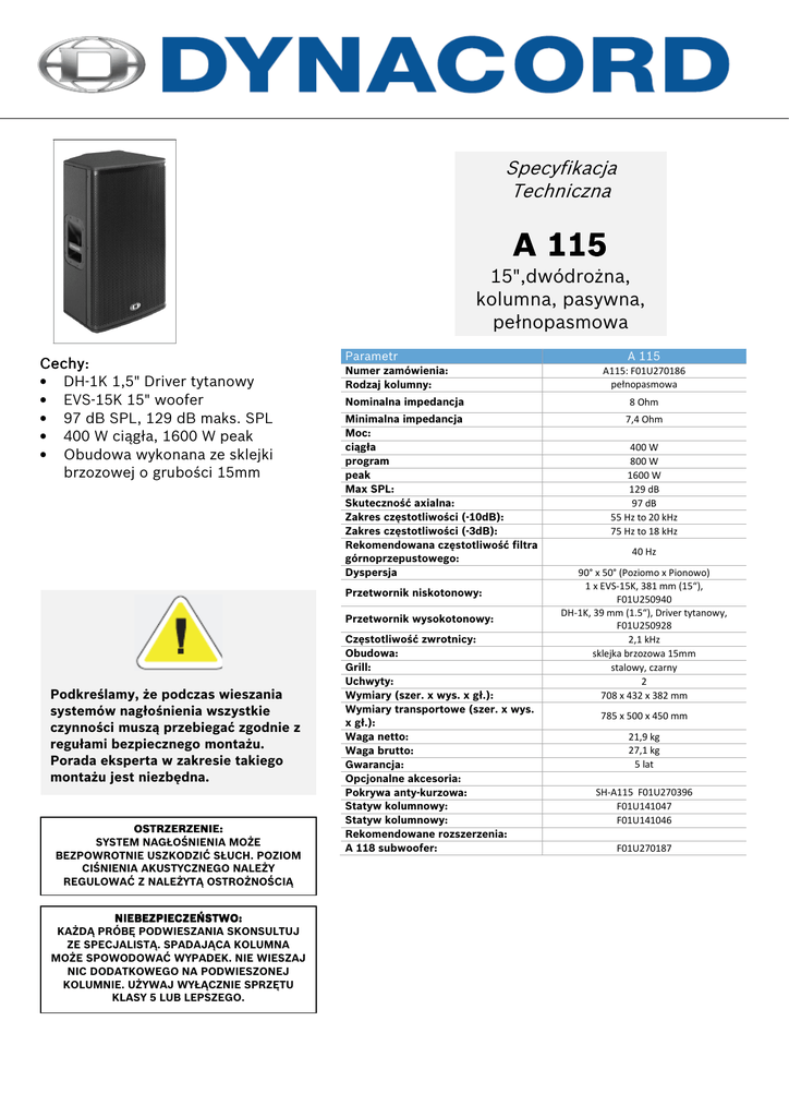 Specyfikacja Techniczna A 115 115 15",dwódrożna, kolumna, pasywna, pełnopasmowa Cechy: • DH-1K 1,5" Driver tytanowy • EVS-15K 15" woofer • 97 dB SPL, 129 dB maks. SPL • 400 W ciągła, 1600 W peak • Obudowa wykonana ze sklejki brzozowej o grubości 15mm Parametr Numer zamówienia: Rodzaj kolumny: Nominalna impedancja Minimalna impedancja Moc: ciągła program peak Max SPL: Skuteczność axialna: Zakres częstotliwości (-10dB): Zakres częstotliwości (-3dB): Rekomendowana częstotliwość filtra górnoprzepustowego: Dyspersja Przetwornik niskotonowy: Przetwornik wysokotonowy: Podkreślamy, że podczas wieszania systemów nagłośnienia wszystkie ,czynności muszą przebiegać zgodnie z regułami bezpiecznego montażu. Porada eksperta w zakresie takiego montażu jest niezbędna. OSTRZERZENIE: SYSTEM NAGŁOŚNIENIA MOŻE BEZPOWROTNIE USZKODZIĆ SŁUCH. POZIOM CIŚNIENIA AKUSTYCZNEGO NALEŻY REGULOWAĆ Z NALEŻYTĄ OSTROŻNOŚCIĄ NIEBEZPIECZEŃSTWO: NIEBEZPIECZEŃSTWO: KAŻDĄ PRÓBĘ PODWIESZANIA SKONSULTUJ ZE SPECJALISTĄ. SPADAJĄCA KOLUMNA MOŻE SPOWODOWAĆ WYPADEK. NIE WIESZAJ NIC DODATKOWEGO NA PODWIESZONEJ KOLUMNIE. UŻYWAJ WYŁĄCZNIE SPRZĘTU KLASY 5 LUB LEPSZEGO. Częstotliwość zwrotnicy: Obudowa: Grill: Uchwyty: Wymiary (szer. x wys. x gł.): Wymiary transportowe (szer. x wys. x gł.): Waga netto: Waga brutto: Gwarancja: Opcjonalne akcesoria: Pokrywa anty-kurzowa: Statyw kolumnowy: Statyw kolumnowy: Rekomendowane rozszerzenia: A 118 subwoofer: A 115 A115: F01U270186 pełnopasmowa 8 Ohm 7,4 Ohm 400 W 800 W 1600 W 129 dB 97 dB 55 Hz to 20 kHz 75 Hz to 18 kHz 40 Hz 90° x 50° (Poziomo x Pionowo) 1 x EVS-15K, 381 mm (15“), F01U250940 DH-1K, 39 mm (1.5“), Driver tytanowy, F01U250928 2,1 kHz sklejka brzozowa 15mm stalowy, czarny 2 708 x 432 x 382 mm 785 x 500 x 450 mm 21,9 kg 27,1 kg 5 lat SH-A115 F01U270396 F01U141047 F01U141046 F01U270187 Opis: Opis : Czyste i potężne brzmienie kolumn Dynacord został doceniony na największych scenach całego świata. Seria A-Line to zestaw pasywnych i aktywnych kolumn w solidnych drewnianych obudowach. A-Line sprawdzi się wszędzie tam gdzie jakość dźwięku jest kluczowym aspektem. Ilustracja 1: Wymiary Ilustracja 2: Schemat blokowy Ilustracja 3: Schemat blokowy Ilustracja 4: Impedancja Ilustracja 5: Przykładowy system: 4x A 115 11 5 podłączone do dwukanałowego wzmacniacza DND SL 1200 Ilustracja 6: Przykładowy system: 2x A 115 11 5 podłączone do dwukanałowego wzmacniacza DND SL 1200, CMS 10001000- 3 jest wykorzystany jako źródło sygnału. Ilustracja 7: Przykładowy system: syst em: 2x A 115 11 5 oraz 2x A 118 (subwoofery) podłączone do Dynacord PowerMate 10001000 -3 12000 Portland Avenue, South, Burnsville, MN 55337, USA Phone: +1 952/844-4051, Fax: +1 952/884-0043 www.dynacord.com ©Bosch Communications System 04/2012 Part Number F01U215169 Vs 01 Dystrybucja na terenie Polski Tommex Żebrowscy Spółka Jawna 02-776 Warszawa, ul. Arkadowa 29 www.tommex.pl Tel:22 853 58 02 Fax: 22 852 30 50