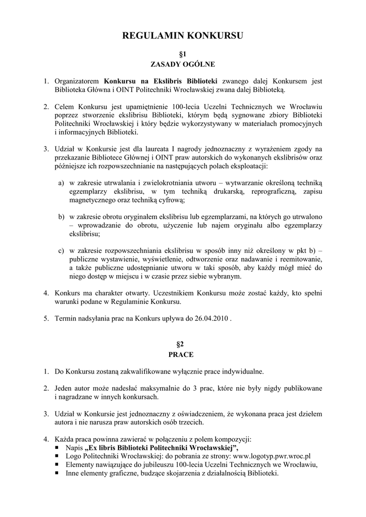 REGULAMIN KONKURSU §1 ZASADY OGÓLNE 1. Organizatorem Konkursu na Ekslibris Biblioteki zwanego dalej Konkursem jest Biblioteka Główna i OINT Politechniki Wrocławskiej zwana dalej Biblioteką. 2. Celem Konkursu jest upamiętnienie 100-lecia Uczelni Technicznych we Wrocławiu poprzez stworzenie ekslibrisu Biblioteki, którym będą sygnowane zbiory Biblioteki Politechniki Wrocławskiej i który będzie wykorzystywany w materiałach promocyjnych i informacyjnych Biblioteki. 3. Udział w Konkursie jest dla laureata I nagrody jednoznaczny z wyraŜeniem zgody na przekazanie Bibliotece Głównej i OINT praw autorskich do wykonanych ekslibrisów oraz późniejsze ich rozpowszechnianie na następujących polach eksploatacji: a) w zakresie utrwalania i zwielokrotniania utworu – wytwarzanie określoną techniką egzemplarzy ekslibrisu, w tym techniką drukarską, reprograficzną, zapisu magnetycznego oraz techniką cyfrową; b) w zakresie obrotu oryginałem ekslibrisu lub egzemplarzami, na których go utrwalono – wprowadzanie do obrotu, uŜyczenie lub najem oryginału albo egzemplarzy ekslibrisu; c) w zakresie rozpowszechniania ekslibrisu w sposób inny niŜ określony w pkt b) – publiczne wystawienie, wyświetlenie, odtworzenie oraz nadawanie i reemitowanie, a takŜe publiczne udostępnianie utworu w taki sposób, aby kaŜdy mógł mieć do niego dostęp w miejscu i w czasie przez siebie wybranym. 4. Konkurs ma charakter otwarty. Uczestnikiem Konkursu moŜe zostać kaŜdy, kto spełni warunki podane w Regulaminie Konkursu. 5. Termin nadsyłania prac na Konkurs upływa do 26.04.2010 . §2 PRACE 1. Do Konkursu zostaną zakwalifikowane wyłącznie prace indywidualne. 2. Jeden autor moŜe nadesłać maksymalnie do 3 prac, które nie były nigdy publikowane i nagradzane w innych konkursach. 3. Udział w Konkursie jest jednoznaczny z oświadczeniem, Ŝe wykonana praca jest dziełem autora i nie narusza praw autorskich osób trzecich. 4. KaŜda praca powinna zawierać w połączeniu z polem kompozycji: Napis „Ex libris Biblioteki Politechniki Wrocławskiej”, Logo Politechniki Wrocławskiej: do pobrania ze strony: www.logotyp.pwr.wroc.pl Elementy nawiązujące do jubileuszu 100-lecia Uczelni Technicznych we Wrocławiu, Inne elementy graficzne, budzące skojarzenia z działalnością Biblioteki. 5. Nadesłane prace zostaną wyeksponowane na wystawie organizowanej przez Bibliotekę z okazji obchodów 100-lecia Uczelni Technicznych we Wrocławiu w maju 2010. 6. Technika wykonania. Do Konkursu moŜna zgłaszać prace wykonane dowolną techniką graficzną, kolorowe lub czarno-białe, o wymiarach 9,5 cm x 7,5 cm. Do oceny nie będą dopuszczone prace wykonane techniką komputerową, w których zastosowano gotowe kliparty. KaŜdy ekslibris zgłaszany na Konkurs naleŜy dostarczyć w dwóch formach: a) W wersji papierowej opatrzonej na odwrocie godłem autora. Ta forma będzie podlegała końcowej ocenie. b) W wersji elektronicznej na CD-ROM-ie. Wersja elektroniczna powinna spełnić następujące warunki: — zapis projektu w formie grafiki rastrowej (bit-mapowej) w postaci pliku jpg lub tif (300 dpi), — zapis projektu w formie grafiki wektorowej w postaci pliku wmf, cdr lub eps; napisy zamienione na krzywe. 7. Prace naleŜy dostarczyć w kopercie zewnętrznej z dopiskiem „KONKURS NA EKSLIBRIS”, w której powinny znajdować się dwie zaklejone koperty z następującą zawartością: KOPERTA Z NAPISEM „EKSLIBRIS”: - Ekslibris(y) w wersji papierowej, opatrzone na odwrocie godłem autora - Ekslibris(y) w wersji na CD-ROM-ie - Objaśnienie uŜytych w pracy elementów i symboli. KOPERTA Z NAPISEM „AUTOR”: - Dane autora: imię, nazwisko, adres, numer telefonu, e-mail oraz godło - Oświadczenie o treści przedstawionej w pkt 8. 8. Oświadczenie w związku z udziałem w Konkursie. OŚWIADCZENIE WyraŜam zgodę na gromadzenie i przetwarzanie moich danych osobowych przez Bibliotekę Główną i OINT Politechniki Wrocławskiej dla celów postępowania konkursowego pod nazwą „Konkurs na Ekslibris”. Oświadczam, Ŝe jestem świadomy/-a przysługującego mi prawa wglądu do moich danych osobowych, Ŝądania ich zmiany lub poprawienia. Przekazuję nieodpłatnie na własność Biblioteki Głównej i OINT Politechniki Wrocławskiej nadesłane na konkurs egzemplarze ekslibrisów, szczegółowo opisane w spisie prac oraz wyraŜam zgodę na późniejsze ich rozpowszechnianie na następujących polach eksploatacji: a) w zakresie utrwalania i zwielokrotniania utworu – wytwarzanie określoną techniką egzemplarzy ekslibrisu, w tym techniką drukarską, reprograficzną, zapisu magnetycznego oraz techniką cyfrową; b) w zakresie obrotu oryginałem ekslibrisu lub egzemplarzami, na których go utrwalono – wprowadzanie do obrotu, uŜyczenie lub najem oryginału albo egzemplarzy ekslibrisu c) w zakresie rozpowszechniania utworu w sposób inny niŜ określony w pkt b) – publiczne wystawienie, wyświetlenie, odtworzenie oraz nadawanie i reemitowanie, a takŜe publiczne udostępnianie utworu w taki sposób, aby kaŜdy mógł mieć do niego dostęp w miejscu i w czasie przez siebie wybranym. Oświadczam, Ŝe przedstawione do konkursu prace są moimi dziełami autorskimi, nie naruszają praw osób trzecich i nie były nigdy publikowane ani nagradzane. ………………………………….. …………………………………. Data 9. Podpis Prace powinny być przesłane lub dostarczone bezpośrednio do Biblioteki w terminie do 26.04.2010 (w przypadku przesyłki decyduje data stempla pocztowego) na adres: BIBLIOTEKA GŁÓWNA I OINT POLITECHNIKI WROCŁAWSKIEJ WybrzeŜe Wyspiańskiego 27 50-370 Wrocław Organizator nie bierze odpowiedzialności za zaginięcie lub uszkodzenie prac nadsyłanych pocztą. §3 WYNIKI KONKURSU 1. Oceny nadesłanych prac i wyłonienia zwycięzców Konkursu dokona jury, którego skład zostanie podany do publicznej wiadomości. Rozstrzygnięcie Konkursu nastąpi podczas uro
