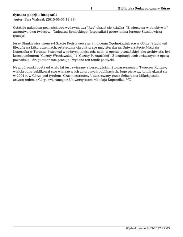 1 Biblioteka Pedagogiczna w Górze Synteza poezji i fotografii Autor: Ewa Walczak (2015-05-05 12:33) Ostatnio nakładem poznańskiego wydawnictwa "Rys" ukazał się książka "Z wierszem w obiektywie" autorstwa dwu twórców - Tadeusza Bonieckiego (fotografia) i górowianina Jerzego Stankiewicza (poezja). Jerzy Stankiewicz ukończył Szkołę Podstawową nr 2 i Liceum Ogólnokształcące w Górze. Studiował filozofię na kilku uczelniach, ostatecznie obronił pracę magisterską na Uniwersytecie Mikołaja Kopernika w Toruniu. Pracował w różnych miejscach, m.in. w operze poznańskiej jako archiwista, był korespondentem "Gazety Wrocławskiej" i "Gazety Poznańskiej". Z inspiracji osób związanych z operą poznańską - drugi autor tam pracuje - wydano ten tomik poetycki. Nasz górowski poeta od wielu lat jest związany z Leszczyńskim Stowarzyszeniem Twórców Kultury, wielokrotnie publikował swe wiersze w ich zbiorowych publikacjach. Jego pierwszy tomik ukazał się w 2001 r. w Górze pod tytułem "Czas niestracony", ilustrowany przez Sebastiana Mikołajczaka, artystę rodem z Góry, związanego z Uniwersytetem Mikołaja Kopernika. MŻ Wydrukowano 8-03-2017 22:03