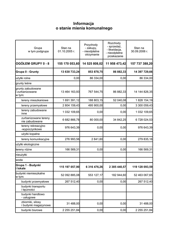 Informacja o stanie mienia komunalnego Grupa w tym podgrupa OGÓŁEM GRUPY 0 - 8 Grupa 0 - Grunty Stan na 01.10.2005 r. Przychody - zakupy, - nieodpłatne otrzymanie Rozchody - sprzedaż, - likwidacja, - nieodpłatne przekazanie 155 170 053,60 14 525 808,02 11 958 473,42 Stan na 30.09.2006 r. 157 737 388,20 13 630 733,24 853 878,75 86 882,33 14 397 729,66 0,00 86 334,00 0,00 86 334,00 13 464 163,93 767 544,75 86 882,33 14 144 826,35 tereny mieszkaniowe 1 691 391,12 188 803,15 52 040,08 1 828 154,19 tereny przemysłowe 2 804 159,43 495 900,00 0,00 3 300 059,43 tereny zabudowane inne 1 032 109,65 0,00 0,00 1 032 109,65 zurbanizowane tereny nie zabudowane 6 682 866,78 80 000,00 34 842,25 6 728 024,53 976 643,39 0,00 0,00 976 643,39 276 993,56 2 841,60 0,00 279 835,16 166 569,31 0,00 0,00 166 569,31 115 197 057,90 6 316 476,26 2 385 440,57 119 128 093,59 52 092 885,08 553 127,17 182 944,60 52 463 067,65 267 512,40 0,00 0,00 267 512,40 31 488,00 0,00 0,00 31 488,00 2 255 251,84 0,00 0,00 2 255 251,84 użytki rolne grunty leśne grunty zabudowane i zurbanizowane w tym: tereny rekreacyjno -wypoczynkowe użytki kopalne tereny komunikacyjne użytki ekologiczne tereny różne nieużytki woda Grupa 1 - Budynki i lokale budynki niemieszkalne w tym: budynki przemysłowe budynki transportu i łączności budynki handlowo - usługowe zbiorniki, silosy i budynki magazynowe budynki biurowe Grupa w tym podgrupa budynki szpitali i zakładów opieki medycznej Stan na 01.10.2005 r. Przychody - zakupy, - nieodpłatne otrzymanie Rozchody - sprzedaż, - likwidacja, - nieodpłatne przekazanie Stan na 30.09.2006 r. 17 011,72 0,00 17 011,72 0,00 40 533 253,86 490 715,45 165 932,88 40 858 036,43 53 154,00 400,00 0,00 53 554,00 8 935 213,26 62 011,72 0,00 8 997 224,98 63 104 172,82 5 763 349,09 2 202 495,97 66 665 025,94 19 427 291,47 6 387 232,79 9 241 273,03 16 573 251,23 kompleksowe budowle na terenach przemysłowych 1 242 494,31 0,00 7 740,30 1 234 754,01 rurociągi, linie telekomunikacyjne i elektroenergetyczne 6 692 819,95 1 882 551,25 4 219 675,15 4 355 696,05 infrastruktura transportu 4 978 074,65 2 196 152,52 15 372,00 7 158 855,17 obiekty inżynierii lądowej i wodnej pozostałe 6 513 902,56 2 308 529,02 4 998 485,58 3 823 946,00 Grupa 3 - Kotły i maszyny energetyczne 634 182,18 9 903,37 0,00 644 085,55 kotły grzejne i parowe 629 622,18 9 903,37 0,00 639 525,55 4 560,00 0,00 0,00 4 560,00 1 190 781,32 33 903,72 131 002,85 1 093 682,19 budynki oświaty, nauki i kultury oraz budynki sportowe budynki produkcyjne, usługowe i gospodar. dla rolnictwa inne budynki niemieszkalne budynki mieszkalne lokale Grupa 2 - Obiekty inżynierii lądowej i wodnej maszyny napędowe pierwotne nie zespolone maszyny elektryczne wirujące nie zespolone turbozespoły i zespoły (agregaty) elektroenergetyczne wytwórcze i przetwórcze oraz reaktory jądrowe Grupa 4 - Maszyny, urządzenia i aparaty ogólnego zastosowania obrabiarki do metali maszyny do obróbki plastycznej metali i tworzyw sztucznych Grupa w tym podgrupa Stan na 01.10.2005 r. Przychody - zakupy, - nieodpłatne otrzymanie Rozchody - sprzedaż, - likwidacja, - nieodpłatne przekazanie Stan na 30.09.2006 r. maszyny, urządzenia i aparaty w przemysłach rolnych i spożywczych ogólnego zastosowania maszyny i urządzenia do przetłaczania i sprężania cieczy i gazów piece przemysłowe aparaty do wymiany ciepła 96 030,36 0,00 0,00 96 030,36 maszyny, urządzenia i aparaty do operacji i procesów materiałowych 125 218,06 22 171,08 0,00 147 389,14 pozostałe maszyny, urządzenia i aparaty specjalizowane i specjalne ogólnego zastosowania, w tym: 969 532,90 11 732,64 131 002,85 850 262,69 zespoły komputerowe 969 532,90 11 732,64 131 002,85 850 262,69 204 061,75 35 077,07 0,00 239 138,82 0,00 18 000,00 0,00 18 000,00 pozostałe maszyny, urządzenia i aparaty ogólnego zastosowania Grupa 5 - Specjalistyczne maszyny, urządzenia i aparaty maszyny do produkcji wyrobów z metali i tworzyw sztucznych maszyny do obróbki i przerobu drewna, produkcji wyrobów z drewna oraz maszyny papiernicze i poligraficzne maszyny dla przemysłu surowców mineralnych maszyny i urządzenia do produkcji wyrobów włókienniczych i odzieżowych oraz do obróbki i produkcji wyrobów ze skóry maszyny, urządzenia i aparaty przemysłów rolnych maszyny, urządzenia i aparaty przemysłów spożywczych Grupa w tym podgrupa Stan na 01.10.2005 r. Przychody - zakupy, - nieodpłatne otrzymanie Rozchody - sprzedaż, - likwidacja, - nieodpłatne przekazanie Stan na 30.09.2006 r. maszyny urządzenia i aparaty przemysłów chemicznych maszyny, urządzenia i aparaty wiertnicze, górnicze, gazownicze, odlewnicze, geodezyjne i kartograficzne maszyny do robót ziemnych, budowlanych i drogowych 96 223,65 10 577,40 0,00 106 801,05 107 838,10 6 499,67 0,00 114 337,77 1 216 040,16 100 777,51 0,00 1 316 817,67 urządzenia i aparaty energii elektrycznej 52 464,40 0,00 0,00 52 464,40 urządzenia tele i radiotechniczne oraz aparaty do telefonii 15 960,03 91 688,51 0,00 107 648,54 8 135,78 0,00 0,00 8 135,78 55 265,50 0,00 0,00 55 265,50 927 054,32 9 089,00 0,00 936 143,32 urządzenia nieprzemysłowe 99 160,00 0,00 0,00 99 160,00 pozostałe urządzenia techniczne 58 000,13 0,00 0,00 58 000,13 2 899 210,64 755 752,75 46 163,00 3 608 800,39 samochody osobowe 86 663,00 69 925,00 36 663,00 119 925,00 samochody ciężarowe 926 367,05 0,00 9 500,00 916 867,05 samochody specjalne 1 416 564,64 362 649,75 0,00 1 779 214,39 12 381,95 323 178,00 0,00 335 559,95 ciągniki 120 093,00 0,00 0,00 120 093,00 naczepy i przyczepy 330 186,00 0,00 0,00 330 186,00 6 955,00 0,00 0,00 6 955,00 maszyny, urządzenia i narzędzia rolnicze i gospodarki leśnej Grupa 6 - Urządzenia techniczne zbiorniki naziemne urządzenia elektroenergetyczne prądotwórcze i zasilające dźwigi i przenośniki urządzenia przemysłowe Grupa 7 - Środki transportu tabor szynowy naziemny motocykle, przyczepy autobusy i autokary pozostały tabor Grupa w tym podgrupa