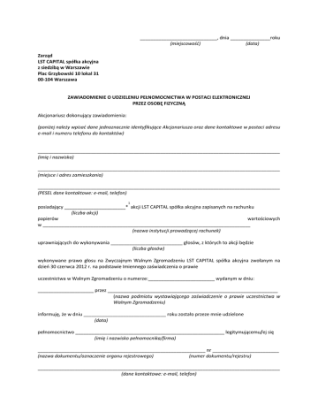 _____________________________, dnia _______________roku (miejscowość) (data) Zarząd LST CAPITAL spółka akcyjna z siedzibą w Warszawie Plac Grzybowski 10 lokal 31 00-104 Warszawa ZAWIADOMIENIE O UDZIELENIU PEŁNOMOCNICTWA W POSTACI ELEKTRONICZNEJ PRZEZ OSOBĘ FIZYCZNĄ Akcjonariusz dokonujący zawiadomienia: (poniżej należy wpisać dane jednoznacznie identyfikujące Akcjonariusza oraz dane kontaktowe w postaci adresu e-mail i numeru telefonu do kontaktów) ___________________________________________________________________________________________ (imię i nazwisko) ___________________________________________________________________________________________ (miejsce i adres zamieszkania) ___________________________________________________________________________________________ (PESEL dane kontaktowe: e-mail, telefon) 1 posiadający _______________________* akcji LST CAPITAL spółka akcyjna zapisanych na rachunku (liczba akcji) papierów wartościowych w ______________________________________________________________________________ (nazwa instytucji prowadzącej rachunek) uprawniających do wykonywania ___________________________ głosów, z których to akcji będzie (liczba głosów) wykonywane prawo głosu na Zwyczajnym Walnym Zgromadzeniu LST CAPITAL spółka akcyjna zwołanym na dzień 30 czerwca 2012 r. na podstawie Imiennego zaświadczenia o prawie uczestnictwa w Walnym Zgromadzeniu o numerze:_________________________ wydanym w dniu: _____________________ przez ________________________________________________________________ (nazwa podmiotu wystawiającego zaświadczenie o prawie uczestnictwa w Walnym Zgromadzeniu) informuję, że w dniu _______________________________ roku zostało przeze mnie udzielone (data) pełnomocnictwo ________________________________________________________ legitymującemu/ej się (imię i nazwisko pełnomocnika/firma) _______________________________________________________________ nr _________________________ (nazwa dokumentu/oznaczenie organu rejestrowego) (numer dokumentu/rejestru) ___________________________________________________________________________________________ (dane kontaktowe: e-mail, telefon) zwanego dalej „Pełnomocnikiem” do reprezentowania mnie jako Akcjonariusza i właściciela wymienionych powyżej akcji na Zwyczajnym Walnym Zgromadzeniu LST CAPITAL spółka akcyjna zwołanym na dzień 30 czerwca 2012 r. poprzez uczestniczenie w moim imieniu w tymże Zwyczajnym Walnym Zgromadzeniu i wykonywaniu w moim imieniu prawa głosu ze wszystkich wymienionych powyżej akcji: zgodnie z instrukcjami umieszczonymi w załączonym „Formularzu pozwalającym na wykonywanie prawa głosu przez pełnomocnika na Zwyczajnym Walnym Zgromadzeniu”; według uznania Pełnomocnika * 2 Ponadto oświadczam, iż: niniejsze zawiadomienie jest równoznaczne z udzieleniem pełnomocnictwa osobie wymienionej wyżej do niniejszego zawiadomienia dołączam udzielone pełnomocnictwo w postaci pliku PDF* 3 _______________________________________ (czytelny podpis Akcjonariusza) Załączniki: 1. Kopia dowodu osobistego, paszportu lub innego urzędowego dokumentu tożsamości Akcjonariusza (skan i konwersja do formatu PDF), 2. Kopia dowodu osobistego, paszportu lub innego urzędowego dokumentu tożsamości/odpisu z właściwego rejestru Pełnomocnika (skan i konwersja do formatu PDF). ___________________________________________________________________________________________ ____________________ 1 * Jeżeli Akcjonariusz posiada akcje zapisane na więcej niż jednym rachunku papierów wartościowych i ustanawia oddzielnych Pełnomocników do wykonywania praw z akcji zapisanych na każdym z rachunków, należy wpisać ilość akcji z danego rachunku papierów wartościowych. 2 * Należy zaznaczyć właściwe pole 3 * Należy zaznaczyć właściwe pole