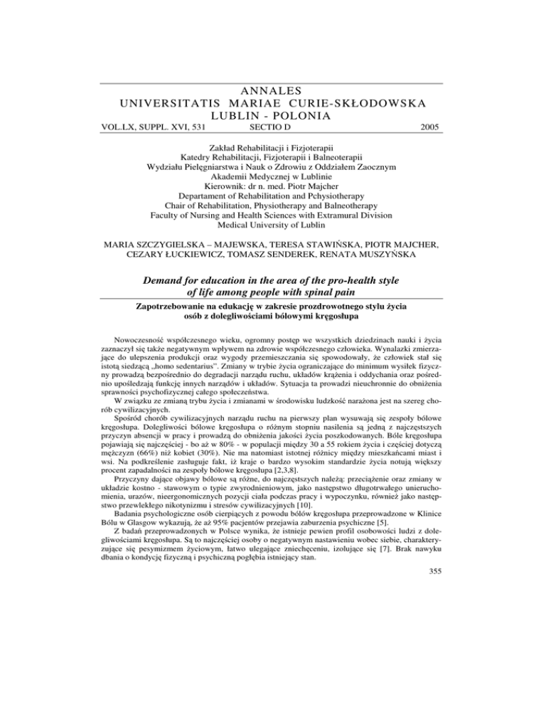 ANNALES UNIVERSITATIS MARIAE CURIE-SKŁODOWSKA LUBLIN - POLONIA VOL.LX, SUPPL. XVI, 531 SECTIO D 2005 Zakład Rehabilitacji i Fizjoterapii Katedry Rehabilitacji, Fizjoterapii i Balneoterapii Wydziału Pielęgniarstwa i Nauk o Zdrowiu z Oddziałem Zaocznym Akademii Medycznej w Lublinie Kierownik: dr n. med. Piotr Majcher Departament of Rehabilitation and Pchysiotherapy Chair of Rehabilitation, Physiotherapy and Balneotherapy Faculty of Nursing and Health Sciences with Extramural Division Medical University of Lublin MARIA SZCZYGIELSKA – MAJEWSKA, TERESA STAWIŃSKA, PIOTR MAJCHER, CEZARY ŁUCKIEWICZ, TOMASZ SENDEREK, RENATA MUSZYŃSKA Demand for education in the area of the pro-health style of life among people with spinal pain Zapotrzebowanie na edukację w zakresie prozdrowotnego stylu życia osób z dolegliwościami bólowymi kręgosłupa Nowoczesność współczesnego wieku, ogromny postęp we wszystkich dziedzinach nauki i życia zaznaczył się także negatywnym wpływem na zdrowie współczesnego człowieka. Wynalazki zmierzające do ulepszenia produkcji oraz wygody przemieszczania się spowodowały, że człowiek stał się istotą siedzącą „homo sedentarius”. Zmiany w trybie życia ograniczające do minimum wysiłek fizyczny prowadzą bezpośrednio do degradacji narządu ruchu, układów krążenia i oddychania oraz pośrednio upośledzają funkcję innych narządów i układów. Sytuacja ta prowadzi nieuchronnie do obniżenia sprawności psychofizycznej całego społeczeństwa. W związku ze zmianą trybu życia i zmianami w środowisku ludzkość narażona jest na szereg chorób cywilizacyjnych. Spośród chorób cywilizacyjnych narządu ruchu na pierwszy plan wysuwają się zespoły bólowe kręgosłupa. Dolegliwości bólowe kręgosłupa o różnym stopniu nasilenia są jedną z najczęstszych przyczyn absencji w pracy i prowadzą do obniżenia jakości życia poszkodowanych. Bóle kręgosłupa pojawiają się najczęściej - bo aż w 80% - w populacji między 30 a 55 rokiem życia i częściej dotyczą mężczyzn (66%) niż kobiet (30%). Nie ma natomiast istotnej różnicy między mieszkańcami miast i wsi. Na podkreślenie zasługuje fakt, iż kraje o bardzo wysokim standardzie życia notują większy procent zapadalności na zespoły bólowe kręgosłupa [2,3,8]. Przyczyny dające objawy bólowe są różne, do najczęstszych należą: przeciążenie oraz zmiany w układzie kostno - stawowym o typie zwyrodnieniowym, jako następstwo długotrwałego unieruchomienia, urazów, nieergonomicznych pozycji ciała podczas pracy i wypoczynku, również jako następstwo przewlekłego nikotynizmu i stresów cywilizacyjnych [10]. Badania psychologiczne osób cierpiących z powodu bólów kręgosłupa przeprowadzone w Klinice Bólu w Glasgow wykazują, że aż 95% pacjentów przejawia zaburzenia psychiczne [5]. Z badań przeprowadzonych w Polsce wynika, że istnieje pewien profil osobowości ludzi z dolegliwościami kręgosłupa. Są to najczęściej osoby o negatywnym nastawieniu wobec siebie, charakteryzujące się pesymizmem życiowym, łatwo ulegające zniechęceniu, izolujące się [7]. Brak nawyku dbania o kondycję fizyczną i psychiczną pogłębia istniejący stan. 355 W wielu krajach, zwłaszcza wysoko rozwiniętych wprowadzono szeroko zakrojone działania w zakresie profilaktyki dolegliwości bólowych kręgosłupa. Opracowano specjalne programy szkoleniowe pod nazwą „szkoła pleców”, których zadaniem jest popularyzowanie środków i metod wykorzystywanych w profilaktyce i leczeniu dolegliwości bólowych kręgosłupa. Pierwsza w świecie „szkoła pleców” powstała w Szwecji w 1950 roku. Kilka lat później na terenie Skandynawii funkcjonowało już ponad 300 tego typu ośrodków. Program tych ośrodków obejmował głównie elementy fizjoterapii i naukę wykonywania czynności codziennych z uwzględnieniem zasad ergonomii. W 1974 roku powstał Kanadyjski System Edukacyjny dla pacjentów z bólami kręgosłupa, w którym główny nacisk położono na zmianę postaw osób chorych wobec własnego zdrowia i zmianę stylu życia. Wkrótce podobne szkoły zostały utworzone w Stanach Zjednoczonych, Wielkiej Brytanii, Niemczech, Szwajcarii, Austrii i wielu innych krajach. Pomimo pewnych różnic w realizacji szkolenia w poszczególnych krajach, założenia organizacyjne i programowe „szkół pleców” są zbliżone [1,4,6,9]. Można je sprowadzić do następujących celów głównych: − wyrobienie pozytywnego nastawienia i przekonania do różnych metod kreowania własnego zdrowia a tym samym wzmacniania kondycji kręgosłupa, − wszechstronne poszerzanie wiedzy o psychofizycznych uwarunkowaniach zdrowia i choroby, − zmiana stylu życia i kształtowanie zachowań ruchowych korzystnie wpływających na kręgosłup, − wyrobienie nawyku systematycznego wykonywania ćwiczeń i dbałości o własną postawę ciała w celu zmniejszenia zapadalności na bóle kręgosłupa, − ukształtowanie aktywnego stosunku do otaczającej rzeczywistości i eliminacja zagrożeń środowiskowych powodujących wzrost zapadalności na zespoły bólowe kręgosłupa. Zatem wiedza i nawyki dotyczące zdrowego stylu życia są ważnym czynnikiem w profilaktyce dolegliwości bólowych kręgosłupa. Celem badań była ocena wiedzy osób z dolegliwościami bólowymi kręgosłupa na temat przyczyn i istoty dolegliwości bólowych oraz skuteczności leczenia i usprawniania. MATERIAŁ I METODA Badaniem objęto 150 osób z dolegliwościami bólowymi kręgosłupa podczas leczenia uzdrowiskowego w CRR w Iwoniczu Zdroju. Do uzyskania materiału badawczego wykorzystano kwestionariusz wywiadu i analizę dokumentacji. WYNIKI BADAŃ I ICH OMÓWIENIE W grupie badanych było 67 (44,7%) mężczyzn i 83 (55,3%) kobiety. Większość - 136 osób (90,7%) – stanowili mieszkańcy wsi. Średnia wieku respondentów wynosiła 45 lat. Najwięcej respondentów posiadało wykształcenie zawodowe – 67 o