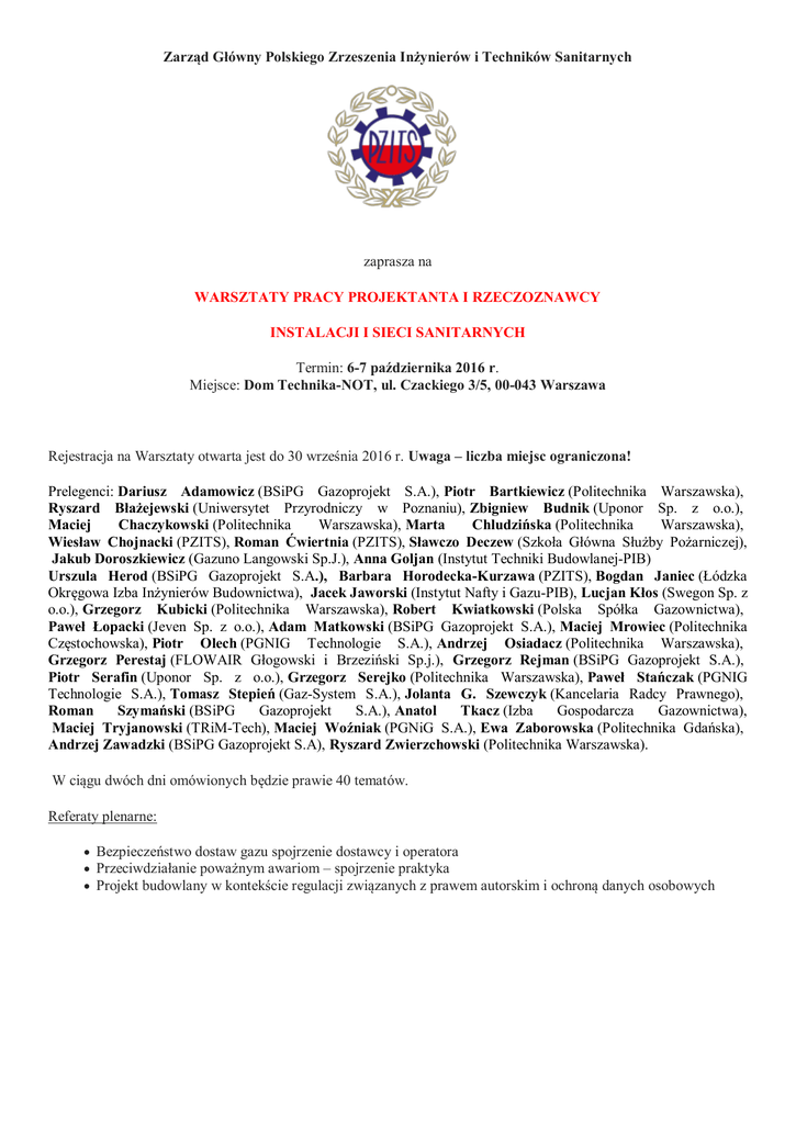 Zarząd Główny Polskiego Zrzeszenia Inżynierów i Techników Sanitarnych zaprasza na WARSZTATY PRACY PROJEKTANTA I RZECZOZNAWCY INSTALACJI I SIECI SANITARNYCH Termin: 6-7 października 2016 r. Miejsce: Dom Technika-NOT, ul. Czackiego 3/5, 00-043 Warszawa Rejestracja na Warsztaty otwarta jest do 30 września 2016 r. Uwaga – liczba miejsc ograniczona! Prelegenci: Dariusz Adamowicz (BSiPG Gazoprojekt S.A.), Piotr Bartkiewicz (Politechnika Warszawska), Ryszard Błażejewski (Uniwersytet Przyrodniczy w Poznaniu), Zbigniew Budnik (Uponor Sp. z o.o.), Maciej Chaczykowski (Politechnika Warszawska), Marta Chludzińska (Politechnika Warszawska), Wiesław Chojnacki (PZITS), Roman Ćwiertnia (PZITS), Sławczo Deczew (Szkoła Główna Służby Pożarniczej), Jakub Doroszkiewicz (Gazuno Langowski Sp.J.), Anna Goljan (Instytut Techniki Budowlanej-PIB) Urszula Herod (BSiPG Gazoprojekt S.A.), Barbara Horodecka-Kurzawa (PZITS), Bogdan Janiec (Łódzka Okręgowa Izba Inżynierów Budownictwa), Jacek Jaworski (Instytut Nafty i Gazu-PIB), Lucjan Kłos (Swegon Sp. z o.o.), Grzegorz Kubicki (Politechnika Warszawska), Robert Kwiatkowski (Polska Spółka Gazownictwa), Paweł Łopacki (Jeven Sp. z o.o.), Adam Matkowski (BSiPG Gazoprojekt S.A.), Maciej Mrowiec (Politechnika Częstochowska), Piotr Olech (PGNIG Technologie S.A.), Andrzej Osiadacz (Politechnika Warszawska), Grzegorz Perestaj (FLOWAIR Głogowski i Brzeziński Sp.j.), Grzegorz Rejman (BSiPG Gazoprojekt S.A.), Piotr Serafin (Uponor Sp. z o.o.), Grzegorz Serejko (Politechnika Warszawska), Paweł Stańczak (PGNIG Technologie S.A.), Tomasz Stepień (Gaz-System S.A.), Jolanta G. Szewczyk (Kancelaria Radcy Prawnego), Roman Szymański (BSiPG Gazoprojekt S.A.), Anatol Tkacz (Izba Gospodarcza Gazownictwa), Maciej Tryjanowski (TRiM-Tech), Maciej Woźniak (PGNiG S.A.), Ewa Zaborowska (Politechnika Gdańska), Andrzej Zawadzki (BSiPG Gazoprojekt S.A), Ryszard Zwierzchowski (Politechnika Warszawska). W ciągu dwóch dni omówionych będzie prawie 40 tematów. Referaty plenarne: Bezpieczeństwo dostaw gazu spojrzenie dostawcy i operatora Przeciwdziałanie poważnym awariom – spojrzenie praktyka Projekt budowlany w kontekście regulacji związanych z prawem autorskim i ochroną danych osobowych Prelekcje odbywające się symultanicznie w czterech salach: I. Wodociągi i kanalizacja Projekt budowlany i projekt wykonawczy – zawartość projektów w świetle obowiązujących przepisów Odpowiedzialność projektantów sieci, instalacji i urządzeń wodociągowo – kanalizacyjnych w świetle obowiązujących aktów prawnych w szczególności ustawy prawo geodezyjne i kartograficzne Projektowanie, wykonawstwo i eksploatacja sieci i obiektów kanalizacyjnych Przegląd dostępnych programów komputerowych stosowanych do projektowania sieci i instalacji wodociągowych i kanalizacyjnych Wspomaganie komputerowe w procesie projektowania instalacji i sieci wodociągowych i kanalizacyjnych – przegląd metod, zalety i wady, weryfikacja obliczeń hydraulicznych Przegląd obowiązującego ustawodawstwa (unijnego i krajowego) oraz norm z zakresu projektowania sieci, instalacji i urządzeń wodociągowo-kanalizacyjnych Weryfikacja projektów sieci, instalacji i urządzeń wodociągowych i kanalizacyjnych w aspekcie zastosowanych rozwiązań Zastosowanie ujęcia systemowego w procesie projektowania sieci wodociągowych i kanalizacyjnych Projektowanie instalacji wodociągowych i kanalizacyjnych z użyciem technologii BIM Zastosowanie nowoczesnych materiałów i technologii w projektowaniu sieci, instalacji i urządzeń wodociągowych i kanalizacyjnych z uwzględnieniem trendów światowych Zarządzanie wodami powierzchniowymi II. Gazownictwo Przepisy, normy, standardy techniczne w gazownictwie Omówienie zakresu i zawartości projektu sieci i projektu instalacji gazowej Nowe technologie w gazownictwie (LNG, CNG, H2 i ogniwa paliwowe) Warunki wejścia w teren dla budowy sieci wysokiego i średniego ciśnienia (omawiane kwestie: projekt, pozwolenie na budowę, wejście w teren wykonawcy, pozwolenie na użytkowanie) Symulacja sieci gazowych Problemy w trakcie budowy gazociągu wysokiego ciśnienia – doświadczenia firmy budowlanej (wady i błędy w projektach) Atestacja certyfikacja i znak bezpieczeństwa dla odbiorników gazu i armatury gazowej Wspomaganie komputerowe w procesie projektowania instalacji i sieci gazowych z użyciem technologii BIM III. Ciepłownictwo Ogrzewnictwo Wentylacja i Klimatyzacja Nowe inicjatywy europejskie w zakresie oceny wydzielania związków niebezpiecznych z wyrobów budowlanych a jakość powietrza wewnętrznego Praktyczne zastosowanie przepisów przeciwpożarowych przy projektowaniu instalacji wentylacji bytowej i pożarowej Projektowanie systemów HVAC z użyciem technologii BIM Zakres i zawartość projektu budowlanego i wykonawczego instalacji HVAC Zasobniki ciepła w systemach ciepłowniczych Ogrzewanie i wentylacja obiektów przemysłowych z zastosowaniem niskotemperaturowych źródeł ciepła Energooszczędność w aspekcie rosnących wymagań dotyczących separacji tłuszczu w wentylacji kuchni Mocowania instalacji rurowych z uwzględnieniem konieczności kompensacji termicznej Charakterystyka energetyczna budynków. Praktyka obliczeń i przyjmowanych założeń w celu osiągnięcia wartości współczynników EP określonych w Warunkach Technicznych W poszukiwaniu energooszczędności w instalacjach wody lodowej Stropy Aktywne – energooszczędne rozwiązanie ogrzewania i chłodzenia budynków biurowych Innowacyjne rozwiązania instalacji wodociągowych oraz grzewczo-chłodzących Uponor Opłaty i rejestracja: Uczestnicy będący członkami PZITS: 350 zł + VAT Uczestnicy niebędący członkami PZITS: 400 zł + VAT Studenci i doktoranci: 50 zł + VAT Szczegółowe informacje (wraz z formularzem rejestracyjnym) dostępne są na stronie www.pzits.pl/warsztaty2016 oraz u Komitetu Organizacyjnego Warsztatów: PZITS ZG ul. Czackiego 3/5, p