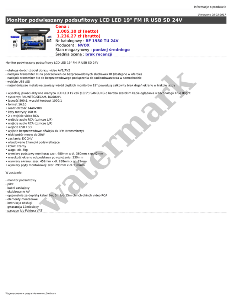 Informacje o produkcie Utworzono 08-03-2017 Monitor podwieszany podsufitowy LCD LED 19" FM IR USB SD 24V Cena : 1.005,10 zł (netto) 1.236,27 zł (brutto) Nr katalogowy : RF 1980 TU 24V Producent : NVOX Stan magazynowy : poniżej średniego Średnia ocena : brak recenzji Monitor podwieszany podsufitowy LCD LED 19" FM IR USB SD 24V er m ar k - obsługa dwóch źródeł obrazu video AV1/AV2 - nadajnik transmiter IR na podczerwień do bezprzewodowych słuchawek IR (dostępne w ofercie) - nadajnik transmiter FM do bezprzewodowego podłączenia do radioodtwarzacza w samochodzie - wejście USB /SD - najsolidniejsze metalowe zawiasy wśród ciężkich monitorów 19" powodują całkowity brak drgań ekranu w trakcie jazdy W zestawie: at • wysokiej jakości aktywna matryca LCD LED 19 cali (18,5") SAMSUNG o bardzo szerokim kącie oglądania w technologii True Bright • systemy: PAL/NTSC/SECAM, BG/DK/I/L • jasność 500:1, wysoki kontrast 1000:1 • format 16:10 • rozdzielczość 1440x900 • kąty matrycy 160 st. • 2 x wejście video RCA • wejście audio RCA (czincze L/R) • wyjście audio RCA (czincze L/R) • wejście USB / SD • wyjście bezprzewodowe dźwięku IR i FM (transmitery) • niski pobór mocy: do 20W • zasilanie: DC 24V • wbudowane 2 lampki podświetlające • kolor: czarny • waga: ok. 5kg • wymiary podstawy monitora: szer. 480mm x dł. 360mm x gr.42mm • wysokość ekranu od podstawy po rozłożeniu: 330mm • wymiary ekranu: szer. 452mm x dł. 288mm x gr. 29mm • wymiary płyty montażowej: szer. 293mm x dł. 190mm w - monitor podsufitowy - pilot - kabel zasilający - okablowanie AV - opcjonalnie za dopłatą kabel 3m, 5m lub 15m chinch-chinch video RCA - elementy montażowe - instrukcja obsługi - gwarancja 12miesięcy - paragon lub Faktura VAT Wygenerowano w programie www.oscGold.com