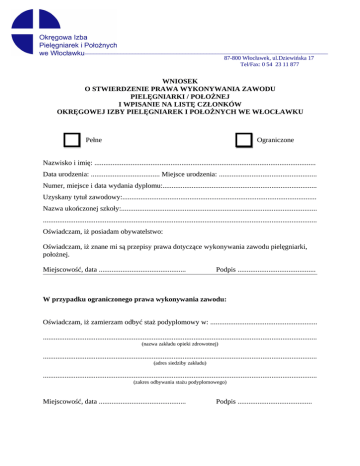 __________________________________________________________________________________ 87-800 Włocławek, ul.Dziewińska 17 Tel/Fax: 0 54 23 11 877 WNIOSEK O STWIERDZENIE PRAWA WYKONYWANIA ZAWODU PIELĘGNIARKI / POŁOŻNEJ I WPISANIE NA LISTĘ CZŁONKÓW OKRĘGOWEJ IZBY PIELĘGNIAREK I POŁOŻNYCH WE WŁOCŁAWKU Pełne Ograniczone Nazwisko i imię: .......................................................................................................................... Data urodzenia: ...................................... Miejsce urodzenia: ...................................................... Numer, miejsce i data wydania dyplomu:..................................................................................... Uzyskany tytuł zawodowy:........................................................................................................... Nazwa ukończonej szkoły:............................................................................................................ ....................................................................................................................................................... Oświadczam, iż posiadam obywatelstwo: Oświadczam, iż znane mi są przepisy prawa dotyczące wykonywania zawodu pielęgniarki, położnej. Miejscowość, data ................................................ Podpis ........................................... W przypadku ograniczonego prawa wykonywania zawodu: Oświadczam, iż zamierzam odbyć staż podyplomowy w: ........................................................... ....................................................................................................................................................... (nazwa zakładu opieki zdrowotnej) ....................................................................................................................................................... (adres siedziby zakładu) ....................................................................................................................................................... (zakres odbywania stażu podyplomowego) Miejscowość, data ................................................ Podpis ......................................... __________________________________________________________________________________ 87-800 Włocławek, ul.Dziewińska 17 Tel/Fax: 0 54 23 11 877 Załączniki 1. Arkusz zgłoszeniowy 2. Kopia dyplomu – oryginał do wglądu. 3. Kopia zaświadczenia o ukończeniu stażu podyplomowego – oryginał do wglądu (dotyczy absolwentów medycznych szkół zawodowych). 4. Zaświadczenie o stanie zdrowia pozwalającym wykonywać zawód, wydane przez lekarza. 5. Dwa jednakowe zdjęcia o wymiarach 24x28 mm 6. Kopia dowodu tożsamości – oryginał do wglądu. Pouczenie Zgodnie z art. 11 ust 2 pkt. 4 ustawy z dnia 1 lipca 2011 roku o samorządzie pielęgniarek i położnych (Dz. U. Nr 174 poz. 1038) regularne opłacanie składki członkowskiej jest obowiązkowe. Zgodnie z art. 92 ustawy z dnia 1 lipca 2011 roku o samorządzie pielęgniarek i położnych (Dz. U. Nr 174 poz. 1038) nie opłacone w terminie składki członkowskie podlegają ściągnięciu w trybie przepisów o postępowaniu egzekucyjnym w administracji. Zgodnie z art. 46 ustawy z dnia 1 lipca 2011 roku o samorządzie pielęgniarek i położnych (Dz. U. Nr 174 poz. 1039) pielęgniarka, położna wpisana do rejestru, jest obowiązana do niezwłocznego zawiadomienia właściwej okręgowej rady pielęgniarek i położnych o wszelkich zmianach danych, nie później jednak niż w terminie 14 dni od dnia ich powstania. Informacja o administratorze danych 1. Podstawa prawna przetwarzania danych osobowych – art. 31 ustawy z dnia 1 lipca 2011 roku o samorządzie pielęgniarek i położnych (Dz. U. Nr 174 poz. 1038). 2. Administratorem danych osobowych jest Przewodnicząca Okręgowej Rady Pielęgniarek i Położnych we Włocławku. 3. Adres siedziby administratora danych : 87-800 Włocławek, ul. Dziewińska 17 POTWIERDZENIE Potwierdzam odbiór zaświadczenia o prawie wykonywania zawodu pielęgniarki, położnej o serii ………………….. numerze …………………………………….................................. ……………………………….. Miejscowość i data ………………………………… Podpis