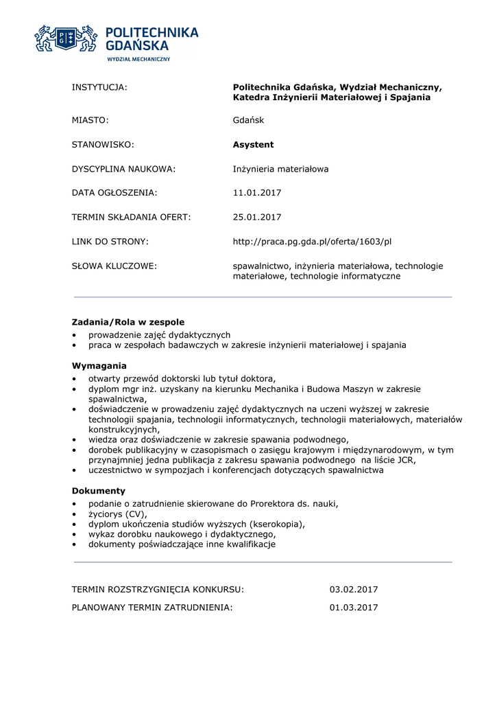 INSTYTUCJA: Politechnika Gdańska, Wydział Mechaniczny, Katedra Inżynierii Materiałowej i Spajania MIASTO: Gdańsk STANOWISKO: Asystent DYSCYPLINA NAUKOWA: Inżynieria materiałowa DATA OGŁOSZENIA: 11.01.2017 TERMIN SKŁADANIA OFERT: 25.01.2017 LINK DO STRONY: http://praca.pg.gda.pl/oferta/1603/pl SŁOWA KLUCZOWE: spawalnictwo, inżynieria materiałowa, technologie materiałowe, technologie informatyczne Zadania/Rola w zespole • • prowadzenie zajęć dydaktycznych praca w zespołach badawczych w zakresie inżynierii materiałowej i spajania Wymagania • • • • • • otwarty przewód doktorski lub tytuł doktora, dyplom mgr inż. uzyskany na kierunku Mechanika i Budowa Maszyn w zakresie spawalnictwa, doświadczenie w prowadzeniu zajęć dydaktycznych na uczeni wyższej w zakresie technologii spajania, technologii informatycznych, technologii materiałowych, materiałów konstrukcyjnych, wiedza oraz doświadczenie w zakresie spawania podwodnego, dorobek publikacyjny w czasopismach o zasięgu krajowym i międzynarodowym, w tym przynajmniej jedna publikacja z zakresu spawania podwodnego na liście JCR, uczestnictwo w sympozjach i konferencjach dotyczących spawalnictwa Dokumenty • • • • • podanie o zatrudnienie skierowane do Prorektora ds. nauki, życiorys (CV), dyplom ukończenia studiów wyższych (kserokopia), wykaz dorobku naukowego i dydaktycznego, dokumenty poświadczające inne kwalifikacje TERMIN ROZSTRZYGNIĘCIA KONKURSU: 03.02.2017 PLANOWANY TERMIN ZATRUDNIENIA: 01.03.2017 Politechnika Gdańska, Wydział Mechaniczny, ul. G. Narutowicza 11/12, 80-233 Gdańsk lub złożyć w sekretariacie Dziekana pok. 307 Prosimy o umieszczenie klauzuli: "Wyrażam zgodę na przetwarzanie danych osobowych zawartych w mojej ofercie dla potrzeb niezbędnych przy procesie rekrutacji (zgodnie z Ustawą z dnia 29 sierpnia 1997 r. o Ochronie Danych Osobowych j.t. Dz. U. z 2016 r. poz. 922). Jednocześnie zgodnie z art. 24 ust. 1 ustawy o ochronie danych osobowych z dnia 29 sierpnia 1997 r. (j.t. Dz. U. z 2016 r. poz. 922) przyjmuję do wiadomości, że administratorem zebranych danych osobowych jest Politechnika Gdańska z siedzibą w Gdańsku na ul. Narutowicza 11/12. Podanie danych jest dobrowolne, ale niezbędne do realizacji procesu rekrutacji. Mam prawo dostępu do treści podanych danych i ich poprawiania". Konkurs może zostać zamknięty bez wyłonienia kandydata. Skontaktujemy się z wybranymi osobami. Nadesłanych pocztą ofert nie odsyłamy. Zlecający zastrzegają sobie prawo do odpowiedzi jedynie na wybrane oferty.