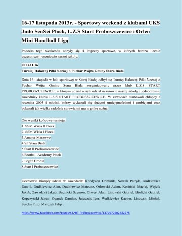 16-17 listopada 2013r. - Sportowy weekend z klubami UKS Judo SenSei Płock, L.Z.S Start Proboszczewice i Orlen Mini Handball Ligą Podczas tego weekendu odbyły się 4 imprezy sportowe, w których bardzo licznie uczestniczyli uczniowie naszej szkoły. 2013.11.16 Turniej Halowej Piłki Nożnej o Puchar Wójta Gminy Stara Biała Dnia 16 listopada w hali sportowej w Starej Białej odbył się Turniej Halowej Piłki Nożnej o Puchar Wójta Gminy Stara Biała zorganizowany przez klub L.Z.S START PROBOSZCZEWICE, w którym udział wzięli udział uczniowie naszej szkoły i jednocześnie zawodnicy klubu L.Z.S START PROBOSZCZEWICE. W zawodach startowali chłopcy z rocznika 2003 i młodsi, którzy wykazali się dużymi umiejętnościami i ambicjami oraz pokazali jak wielką radością sprawia mi gra w piłkę nożną. Oto wyniki końcowe turnieju: 1. SSM Wisła ll Płock 2. SSM Wisła l Płock 3.Amator Maszewo 4.SP Stara Biała 5.Start ll Proboszczewice 6.Football Academy Płock 7.Pegaz Drobin 8.Start l Proboszczewice Uczniowie biorący udział w zawodach: Kordyzon Dominik, Nowak Patryk, Dudkiewicz Dawid, Dudkiewicz Alan, Dudkiewicz Mateusz, Orłowski Adam, Kosiński Maciej, Wójcik Jakub, Zawadzki Jakub, Budnicki Szymon, Olwert Alan, Linowski Gabriel, Bielicki Gabriel, Kopczyński Jakub, Oganek Damian, Jaszczak Igor, Walkiewicz Kacper, Lisowski Michał, Seroka Filip, Matczak Filip https://www.facebook.com/pages/START-Proboszczewice/1377972602432275 2013.11.16 VII Ogólnopolski Turniej Judo Sensei Płock 16 listopada w hali sportowej w Borowiczkach odbył się VII Ogólnopolski Turniej Judo Sensei Płock, w którym udział wzięło 9 uczniów naszej szkoły i jednocześnie zawodników klubu UKS Judo Sensei Płock: Wiktor Ners, Rozalia Linowska, Damian Rakowski, Sebastian Rybicki, Jakub Gostomski, Maciej Kikolski, Szymon Wierciński, Dawid Rakowski, Aleksandra Tułodziecka. Zawody prezentowały bardzo wysoki poziom zawodników, których wystartowało około 300, dlatego nasi uczniowie nie mieli łatwego zadania. Uczniowie wystartowali w swoich kategoriach wiekowych i wagowych i stoczyli po kilka walk. Na podium stanęli: Wiktor Ners - dwukrotnie I i II miejsce, Jakub Gostomski - III miejsce, Aleksandra Tułodziecka - II miejsce oraz Sebastian Rybicki - V miejsce. Gratulacje! 2013.11.17 III Turniej Unifight W niedzielę 17 listopada na sali judo w Orlen Arenie w Płocku odbył się III Turniej Unifight, organizowany przez klub Sensei, w którym udział wzięli zawodnicy tego klubu, w tym 7 uczniów naszej szkoły: Maja Kikolska, Wiktor Ners, Damian Rakowski, Maciej Kikolski, Szymon Wierciński, Damian Rakowski, Jakub Gostomski. Unifight jest formą dwuboju sportowego składającego się z utylitarnego toru przeszkód (na potrzeby zawodów tor został zmodyfikowany i dostosowany do umiejętności zawodników: czołganie w tunelu, pokonanie ścianki, równoważnia, rzut woreczkiem do celu), który należy pokonać przed walką w możliwie najkrótszym czasie oraz z walki sportowej (podczas zawodów obowiązywały przepisy walki judo w stójce). Zawody otworzył i obserwował zmagania uczestników prezes Polskiego Stowarzyszenia Unifghtu doc. dr Jan Krzysztof Harasymowicz. Uczestnicy zapoznali się nową dyscypliną sportu oraz sprawdzili swoją sprawność fizyczną, za udział otrzymali pamiątkowe medale, dyplomy i koszulki. 2013.11.17 Orlen Handball Mini Liga 17 listopada odbyły się kolejne rozgrywki w ramach VI edycji Orlen Handball Mini Liga, w których udział bierze nasza drużyna z klas IV i V pod czujnym okiem trenera Marka Jagodzińskiego. Młodzi adepci piłki ręcznej rozwijają swoje umiejętności i stawiają pierwsze kroki we współzawodnictwie sportowym. Nasi młodzi szczypiorniści: Gorczyca Michał, Brudzyńska Weronika, Trębińska Patrycja, Linowski Gabriel, Zawadzki Jakub, Wójcik Jakub, Kordyzon Dominik, Skrzypek Piotr, Kosiński Maciej, Dudkiewicz Dawid, Orłowski Adam, Kajkowski Mikołaj, Rychlik Magdalena