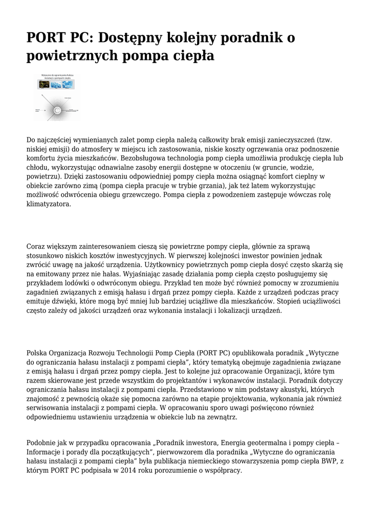 PORT PC: Dostępny kolejny poradnik o powietrznych pompa ciepła Do najczęściej wymienianych zalet pomp ciepła należą całkowity brak emisji zanieczyszczeń (tzw. niskiej emisji) do atmosfery w miejscu ich zastosowania, niskie koszty ogrzewania oraz podnoszenie komfortu życia mieszkańców. Bezobsługowa technologia pomp ciepła umożliwia produkcję ciepła lub chłodu, wykorzystując odnawialne zasoby energii dostępne w otoczeniu (w gruncie, wodzie, powietrzu). Dzięki zastosowaniu odpowiedniej pompy ciepła można osiągnąć komfort cieplny w obiekcie zarówno zimą (pompa ciepła pracuje w trybie grzania), jak też latem wykorzystując możliwość odwrócenia obiegu grzewczego. Pompa ciepła z powodzeniem zastępuje wówczas rolę klimatyzatora. Coraz większym zainteresowaniem cieszą się powietrzne pompy ciepła, głównie za sprawą stosunkowo niskich kosztów inwestycyjnych. W pierwszej kolejności inwestor powinien jednak zwrócić uwagę na jakość urządzenia. Użytkownicy powietrznych pomp ciepła dosyć często skarżą się na emitowany przez nie hałas. Wyjaśniając zasadę działania pomp ciepła często posługujemy się przykładem lodówki o odwróconym obiegu. Przykład ten może być również pomocny w zrozumieniu zagadnień związanych z emisją hałasu i drgań przez pompy ciepła. Każde z urządzeń podczas pracy emituje dźwięki, które mogą być mniej lub bardziej uciążliwe dla mieszkańców. Stopień uciążliwości często zależy od jakości urządzeń oraz wykonania instalacji i lokalizacji urządzeń. Polska Organizacja Rozwoju Technologii Pomp Ciepła (PORT PC) opublikowała poradnik „Wytyczne do ograniczania hałasu instalacji z pompami ciepła”, który tematyką obejmuje zagadnienia związane z emisją hałasu i drgań przez pompy ciepła. Jest to kolejne już opracowanie Organizacji, które tym razem skierowane jest przede wszystkim do projektantów i wykonawców instalacji. Poradnik dotyczy ograniczania hałasu instalacji z pompami ciepła. Przedstawiono w nim podstawy akustyki, których znajomość z pewnością okaże się pomocna zarówno na etapie projektowania, wykonania jak również serwisowania instalacji z pompami ciepła. W opracowaniu sporo uwagi poświęcono również odpowiedniemu ustawieniu urządzenia w obiekcie lub na zewnątrz. Podobnie jak w przypadku opracowania „Poradnik inwestora, Energia geotermalna i pompy ciepła – Informacje i porady dla początkujących”, pierwowzorem dla poradnika „Wytyczne do ograniczania hałasu instalacji z pompami ciepła” była publikacja niemieckiego stowarzyszenia pomp ciepła BWP, z którym PORT PC podpisała w 2014 roku porozumienie o współpracy. Poradnik dostępny jest do pobrania w wersji online na stronie internetowej PORT PC www.portpc.pl w zakładce publikacje. Te i inne zagadnienia związane z tematyką pomp ciepła zostaną omówione podczas IV Kongresu PORT PC, który odbędzie się 23 września 2015 r. w trakcie Targów Renexpo w Warszawie. Wszystkich zainteresowanych zachęcamy do zapoznania się z programem tegorocznego spotkania oraz do rejestracji, która możliwa jest za pośrednictwem strony internetowej www.renexpo-warsaw.com w zakładce konferencje. KONTAKT Polska Organizacja Rozwoju Technologii Pomp Ciepła PORT PC Tel: +48 664 979 972 Adres: Przybyszewskiego 29/5 30-128 Kraków