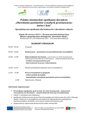 Projekt „Działać ekologicznie – przedsięwzięcia w celu intensyfikacji transgranicznej współpracy przy rozbudowie przetwórstwa regionalnego i sprzedaży produktów ekologicznych” Polsko-niemieckie spotkanie doradcze „Określanie pasożytów u małych przeżuwaczy: owiec i kóz” Specjalistyczne spotkanie dla hodowców i doradców rolnych Piątek 28 czerwca 2013 r., Wrzeszczyn koło Jeleniej Góry Miejsce: gospodarstwo ekologiczne „Kowalowe Skały”, Wrzeszczyn 25 a, 58-508 Jelenia Góra www.kowaloweskaly.pl RAMOWY PROGRAM 09.00 - 09.30 Przyjazd 09.30 - 10.00 Rozpoczęcie – powitanie oraz przedstawienie uczestników. 10.00 - 12.00 Wprowadzenie do tematu - prof. dr hab. inż. Piotr Nowakowski – Uniwersytet Przyrodniczy we Wrocławiu – Instytut Hodowli Zwierząt - Problem inwazji pasożytniczych. - Wprowadzenie do pracy z mikroskopem. 12.00 –12.45 Obiad (samodzielna płatność przez uczestników) 12.45 – 15.00 Praca warsztatowa w grupach: - Pobór próbek do badań. - Samodzielne określanie pasożytów przez uczestników. 15.00 Zakończenie. Wyjazd. Informacje organizacyjne: • Prowadzący spotkanie: prof. dr hab. inż. Piotr Nowakowski – Uniwersytet Przyrodniczy we Wrocławiu – Instytut Hodowli Zwierząt oraz Rafał Raźny • • • Udział w spotkaniu jest bezpłatny. Spotkanie, dofinansowane przez Unię Europejską, jest skierowane do osób z Dolnego Śląska i Saksonii, w szczególności do hodowców (gospodarstwa ekologiczne i konwencjonalne), doradców oraz innych zainteresowanych osób. Organizatorzy zapewniają tłumaczenie polsko-niemieckie. Dieses Projekt wurde gefördert aus dem EFREFond der Europäischen Union Projekt „Działać ekologicznie – przedsięwzięcia w celu intensyfikacji transgranicznej współpracy przy rozbudowie przetwórstwa regionalnego i sprzedaży produktów ekologicznych” • • • • Zgłoszenia można nadsyłać do 27 czerwca 2013 r. do godz. 12.00 przy wykorzystaniu załączonego formularza na adres [email protected] Organizatorzy, ze względu na warsztatowy charakter spotkania, dysponują ograniczoną liczbą miejsc. O zakwalifikowaniu do udziału decyduje kolejność zgłoszeń. Organizatorzy zapewniają sprzęt do pracy warsztatowej (w tym mikroskopy do pracy w małych grupach). Uczestnicy mogą przywieźć ze sobą materiał do badań z własnego gospodarstwa (świeży kał własnych zwierząt; najlepiej od zwierząt z problemami zdrowotnymi). Dieses Projekt wurde gefördert aus dem EFREFond der Europäischen Union