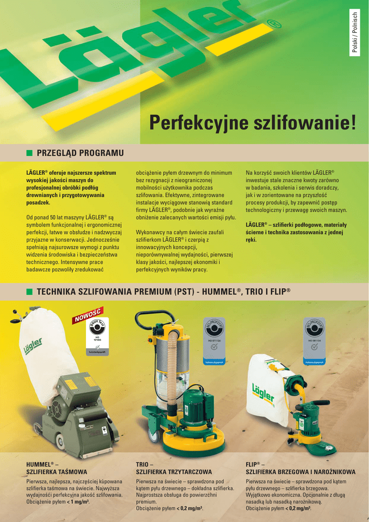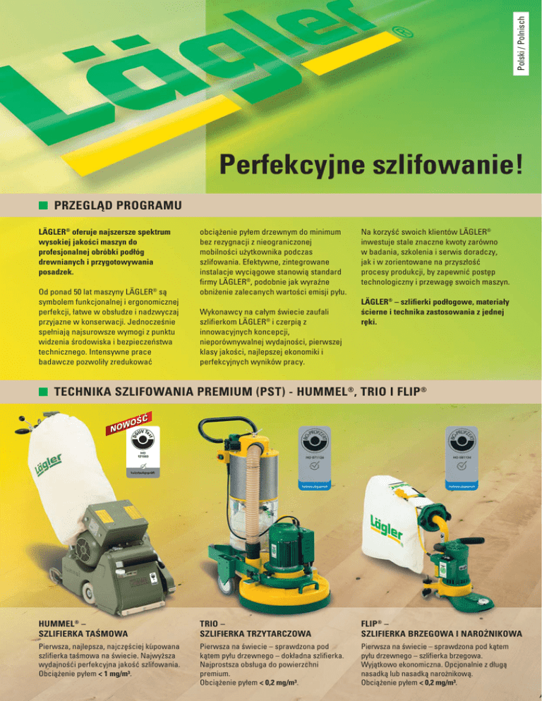 Polski / Polnisch Perfekcyjne szlifowanie! PRZEGLĄD PROGRAMU LÄGLER® oferuje najszersze spektrum wysokiej jakości maszyn do profesjonalnej obróbki podłóg drewnianych i przygotowywania posadzek. Od ponad 50 lat maszyny LÄGLER® są symbolem funkcjonalnej i ergonomicznej perfekcji, łatwe w obsłudze i nadzwyczaj przyjazne w konserwacji. Jednocześnie spełniają najsurowsze wymogi z punktu widzenia środowiska i bezpieczeństwa technicznego. Intensywne prace badawcze pozwoliły zredukować obciążenie pyłem drzewnym do minimum bez rezygnacji z nieograniczonej mobilności użytkownika podczas szlifowania. Efektywne, zintegrowane instalacje wyciągowe stanowią standard firmy LÄGLER®, podobnie jak wyraźne obniżenie zalecanych wartości emisji pyłu. Wykonawcy na całym świecie zaufali szlifierkom LÄGLER® i czerpią z innowacyjnych koncepcji, nieporównywalnej wydajności, pierwszej klasy jakości, najlepszej ekonomiki i perfekcyjnych wyników pracy. Na korzyść swoich klientów LÄGLER® inwestuje stale znaczne kwoty zarówno w badania, szkolenia i serwis doradczy, jak i w zorientowane na przyszłość procesy produkcji, by zapewnić postęp technologiczny i przewagę swoich maszyn. LÄGLER® – szlifierki podłogowe, materiały ścierne i technika zastosowania z jednej ręki. TECHNIKA SZLIFOWANIA PREMIUM (PST) - HUMMEL®, TRIO I FLIP® WO NO ŚĆ HUMMEL® – SZLIFIERKA TAŚMOWA TRIO – SZLIFIERKA TRZYTARCZOWA FLIP® – SZLIFIERKA BRZEGOWA I NAROŻNIKOWA Pierwsza, najlepsza, najczęściej kupowana szlifierka taśmowa na świecie. Najwyższa wydajnośći perfekcyjna jakość szlifowania. Obciążenie pyłem < 1 mg/m³. Pierwsza na świecie – sprawdzona pod kątem pyłu drzewnego – dokładna szlifierka. Najprostsza obsługa do powierzchni premium. Obciążenie pyłem < 0,2 mg/m³. Pierwsza na świecie – sprawdzona pod kątem pyłu drzewnego – szlifierka brzegowa. Wyjątkowo ekonomiczna. Opcjonalnie z długą nasadką lub nasadką narożnikową. Obciążenie pyłem < 0,2 mg/m³. SZLIFIERKI POWIERZCHNIOWE Pakiet mocy – jakość przy najwyższej wydajności na metr kwadratowy. Łatwa obsługa – idealna do wynajmu. Sprawdzony standard w szlifowaniu. SUPERHUMMEL – SZLIFIERKA TAŚMOWA ELF – SZLIFIERKA WAŁKOWA PROFIT – SZLIFIERKA WAŁKOWA Zaprojektowana do racjonalnej obróbki dużych powierzchni podłóg w szkołach, salach gimnastycznych i handlowych. SUPERHUMMEL wyróżnia się agresywnym sposobem pracy, doskonałą jakością i efektywnym odsysaniem pyłu. W Europie pracuje wyłącznie z prądem trójfazowym. Obciążenie pyłem < 2 mg/m³. Wytrzymała, wielokrotnie sprawdzona technika standardowego szlifowania. Główny obszar zastosowania w wynajmie. Wyposażona w nowoczesny odśrodkowy wałek szlifujący LÄGLER®. W eksporcie możliwość zakupu również ze zwykłym wałkiem szlifującym o różnych szerokościach. Poręczna szlifierka do wynajęcia majsterkowiczom. Wyposażona w nowoczesny odśrodkowy wałek szlifujący LÄGLER®. Wytrzymała, niezawodna i nadzwyczaj przyjazna dla użytkownika. Obciążenie pyłem < 2 mg/m³. OBRÓBKA POSADZKI, SZLIFOWANIE DOKŁADNE I POLEROWANIE SZLIFIERKI BRZEGOWE I SCHODOWE Optymalny wynik przy niewielkim obciążeniu Moc bez kompromisów – z przyłączem do odsysania. Uniwersalna elastyczność dla profesjonalistów i do wynajęcia. 1 2 SINGLE – SZLIFIERKA JEDNOTARCZOWA UNICO – SZLIFIERKA BRZEGOWA ELAN – SZLIFIERKA BRZEGOWA I SCHODOWA SINGLE to jedyna prawdziwa szlifierka jednotarczowa. Seryjnie wyposażona w tarczę uniwersalną do najróżniejszych zastosowań. Bezkompromisowo zaprojektowana do najtrudniejszej obróbki podłoża, np. za pomocą opcjonalnej tarczy frezarskiej ze stali szlachetnej i obrotowych tarcz tnących z ceramiki (1) oraz dodatkowego obciążnika (2). Idealna do obróbki brzegów. Skonstruowana ergonomicznie, doskonała do najróżniejszych pozycji roboczych. Wychylna lampa gwarantuje lepszą widoczność. Dostępna z nasadkami o różnych długościach. Obciążenie pyłem < 2 mg/m³. Szerokie spektrum zastosowania, sprawdzona technika i niewielka masa własna sprawiają, że ELAN może być wszechstronnie stosowana. Opcjonalnie dostępna z różnymi nasadkami. ELAN nie jest dostępna we Francji. Obciążenie pyłem < 2 mg/m³. INNOWACYJNE MATERIAŁY CIERNE Powierzchnie premium, ekonomika i bezpieczeństwo pracy to najważniejsze kwestie w przypadku szlifowania podłóg drewnianych. Od dziesięcioleci LÄGLER® dyktuje trendy w technice szlifowania podłóg. Wieloletnie próby i doświadczenia rzemieślników na całym świecie stanowią podstawę całościowej koncepcji, w której maszyny, materiały ścierne i technika zastosowania są do siebie dopasowane. Koncepcja LÄGLER® nazywa się PST (Technika Szlifowania Premium). W kombinacji z doradztwem i szkoleniami stanowi to optymalne rozwiązanie dla zadowolonych klientów. MASZYNY + MATERIAŁY ŚCIERNE + KONCEPCJA LÄGLER®: LEPSZE POWIERZCHNIE W KRÓTKIM CZASIE! Przykłady z praktyki z porównaniem: szlifowanie dębowego parkietu mozaikowego 30 m² Uziarnienie 36 40 60 60 100 80 ✸✸ Zakres Powierzchnia Brzeg Powierzchnia Brzeg Powierzchnia Brzeg Standard Materiał ścierny Korund Korund Korund Korund Korund Korund Maszyna HUMMEL® FLIP® HUMMEL® FLIP® HUMMEL® FLIP® Uziarnienie 36 40 60 60 100 80 100 ✸✸✸✸ Zakres Powierzchnia Brzeg Powierzchnia Brzeg Powierzchnia Brzeg Powierzchnia Prestige Materiał ścierny Korund Korund Korund Korund Korund Korund Siatka Maszyna HUMMEL® FLIP® HUMMEL® FLIP® HUMMEL® FLIP® SINGLE Uziarnienie 40 40 60 60 ✸✸✸✸✸✸ Zakres Powierzchnia Brzeg Powierzchnia Premium Materiał ścierny Cyrkon Cyrkon Cyrkon Maszyna HUMMEL® FLIP® HUMMEL® Kiten Kiten Kiten 60 / 80 60 * Powierzchnia Brzeg Powierzchnia Cyrkon Cyrkon Cyrkon TRIO FLIP® TRIO Zalety czasowe Zalety czasowe * W zależności od podanej jakości powierzchni, szczególnych gatunków drewna lub wzorów ułożenia koni