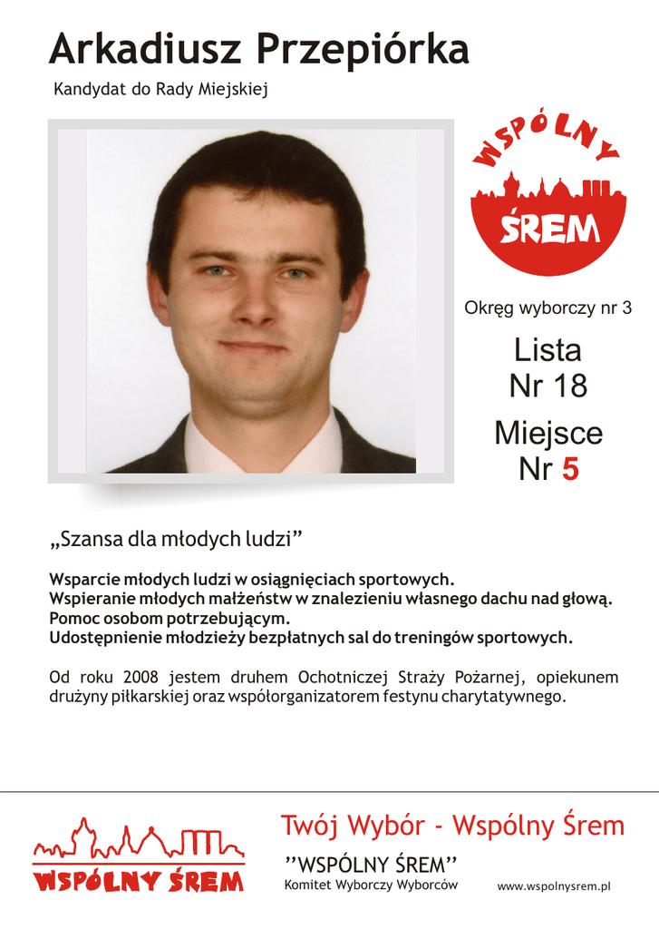 Arkadiusz Przepiórka Kandydat do Rady Miejskiej Okrêg wyborczy nr 3 Lista Nr 18 Miejsce Nr 5 „Szansa dla m³odych ludzi” Wsparcie m³odych ludzi w osi¹gniêciach sportowych. Wspieranie m³odych ma³¿eñstw w znalezieniu w³asnego dachu nad g³ow¹. Pomoc osobom potrzebuj¹cym. Udostêpnienie m³odzie¿y bezp³atnych sal do treningów sportowych. Od roku 2008 jestem druhem Ochotniczej Stra¿y Po¿arnej, opiekunem dru¿yny pi³karskiej oraz wspó³organizatorem festynu charytatywnego. Twój Wybór - Wspólny Œrem ’’WSPÓLNY ŒREM’’ Komitet Wyborczy Wyborców www.wspolnysrem.pl