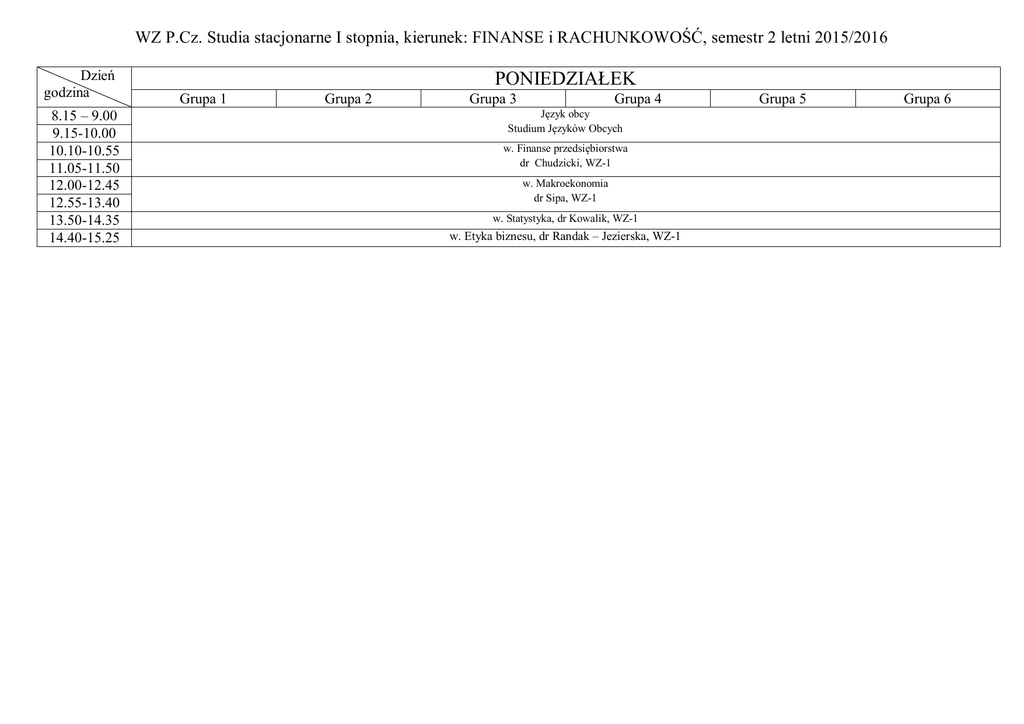 WZ P.Cz. Studia stacjonarne I stopnia, kierunek: FINANSE i RACHUNKOWOŚĆ, semestr 2 letni 2015/2016 Dzień godzina 8.15 – 9.00 9.15-10.00 10.10-10.55 11.05-11.50 12.00-12.45 12.55-13.40 13.50-14.35 14.40-15.25 PONIEDZIAŁEK Grupa 1 Grupa 2 Grupa 3 Grupa 4 Język obcy Studium Języków Obcych w. Finanse przedsiębiorstwa dr Chudzicki, WZ-1 w. Makroekonomia dr Sipa, WZ-1 w. Statystyka, dr Kowalik, WZ-1 w. Etyka biznesu, dr Randak – Jezierska, WZ-1 Grupa 5 Grupa 6 Dzień godzina 7.30-8.15 WTOREK Grupa 1 8.15 – 9.00 9.15-10.00 10.10-10.55 ćw. Statystyka prof. Szajt, 405z Ćw. Matematyka finansowa Mgr Noga, WZ-7 ćw. Finanse przedsiębiorstwa prof. Otola, 413z 17.10-17.55 18.00-18.45 18.50-19.35 Ćw. Matematyka finansowa Mgr Noga, WZ-7 ćw. Statystyka dr Zawada, 406z ćw. Ochrona własności intelektualnej mgr Szymczyk, 313z ćw. Statystyka prof. Szajt, 405z Ćw. Matematyka finansowa Dr Wiśniewska - Sałek, WZ-7 ćw. Statystyka ćw. Statystyka ćw. Finanse przedsiębiorstwa dr Zawada, 406z prof. Otola, 413z ćw. Ochrona własności intelektualnej mgr Szymczyk, 502z Ćw. Matematyka finansowa Mgr Noga, WZ-7 ćw. Ochrona własności intelektualnej mgr Szymczyk, 502z Grupa 6 Ć. Rachunkowość Mgr Piersiala A18 Ćw. Matematyka finansowa Dr Wiśniewska – Sałek WZ-7 Ć. Rachunkowość Dr Tylec S-21 W. Ochrona własności intelektualnej Prof. Barańska, WZ-1 W. Matematyka finansowa Dr Wiśniewska – Sałek, WZ-1 Ć. Rachunkowość Dr Tylec 404z ćw. Makroekonomia dr Lemańska – Majdzik 510z 16.20-17.05 Grupa 5 dr Zawada, 406z 13.50-14.35 15.30-16.15 Grupa 4 dr Ostraszewska, 514z 12.55-13.40 14.40-15.25 Grupa 3 ćw. Finanse przedsiębiorstwa 11.05-11.50 12.00-12.45 Grupa 2 Ćw. Matematyka finansowa Mgr Noga, WZ-7 ćw. Ochrona własności intelektualnej mgr Szymczyk, WZ-7 ćw. Finanse przedsiębiorstwa dr Chudzicki 511z ćw. Ochrona własności intelektualnej mgr Szymczyk, WZ-7 Ć. Rachunkowość Mgr Piersiala WZ-4 ćw. Ochrona własności intelektualnej mgr Szymczyk, WZ-7 ćw. Finanse przedsiębiorstwa dr Włodarska – Zoła 514z Dzień godzina CZWARTEK Grupa 1 Grupa 2 Grupa 3 Grupa 4 Grupa 5 Grupa 6 W. Ochrona własności intelektualnej Prof. Barańska, WZ-1 w dniu 17.03, 07.04, 14.04, 21.04, 28.04.2016 10.10-10.55 11.05-11.50 WZ P.Cz. Studia stacjonarne I stopnia, kierunek: FINANSE i RACHUNKOWOŚĆ, semestr 2 letni 2015/2016 Dzień godzina PIĄTEK Grupa 1 7.30-8.15 8.15 – 9.00 Ć. Rachunkowość Dr Kowalska, 511z 9.15-10.00 ćw. Technologia informacyjna , dr Ziora, 405z Grupa 2 ćw. Technologia informacyjna , dr Ziora, 405z Ć. Rachunkowość Dr Kowalska, 511z 10.10-10.55 11.05-11.50 14.40-15.25 15.30-16.15 ćw. Technologia informacyjna dr Grabińska, 304z Ć. Rachunkowość Dr Łęgowik – Małolepsza 502z Grupa 4 ćw. Makroekonomia dr Sipa 514z ćw. Technologia informacyjna dr Grabińska, 304z Grupa 5 Grupa 6 ćw. Makroekonomia ćw. Technologia informacyjna dr Dziembek, 205z dr Lemańska – Majdzik 502z ćw. Finanse przedsiębiorstwa ćw. Technologia informacyjna dr Dziembek, 205z prof. Otola, 514z W. Rachunkowość Dr Kowalska, WZ-1 w. Technologia informacyjna dr Dziembek, WZ-1 12.00-12.45 12.55-13.40 13.50-14.35 Grupa 3 ćw. Makroekonomia ćw. Makroekonomia dr Sipa 402z dr Lemańska – Majdzik 302z ćw. Makroekonomia dr Lemańska – Majdzik 302z ćw. Statystyka – dwie godziny co dwa tygodnie dr Strzelecka, 305z