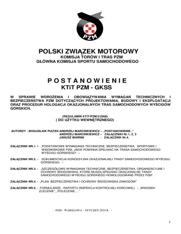 POLSKI ZWIĄZEK MOTOROWY KOMISJA TORÓW I TRAS PZM GŁÓWNA KOMISJA SPORTU SAMOCHODOWEGO POSTANOWIENIE KTiT PZM - GKSS W SPRAWIE WDROŻENIA I OBOWIĄZYWANIA WYMAGAŃ TECHNICZNYCH I BEZPIECZEŃSTWA PZM DOTYCZĄCYCH PROJEKTOWANIA, BUDOWY I EKSPLOATACJI ORAZ PROCEDUR HOLOGACJI OKAZJONALNYCH TRAS SAMOCHODOWYCH WYŚCIGÓW GÓRSKICH. (REGULAMIN KTiT/PZM/2/2008) ( DO UŻYTKU WEWNĘTRZNEGO) AUTORZY : BOGUSŁAW PIĄTEK/ANDRZEJ MARCINKIEWICZ – „POSTANOWIENIE..” ANDRZEJ MARCINKIEWICZ – ZAŁĄCZNIKI Nr.1, 2, 3 JANUSZ MARNIK - ZAŁĄCZNIK Nr.4. ZAŁĄCZNIK NR.1. - „PODSTAWOWE WYMAGANIA TECHNICZNE, BEZPIECZEŃSTWA, SPORTOWE I WIDOWISKOWE PZM, JAKIE POWINNA SPELNIAĆ NA TRASA SAMOCHODOWEGO WYŚCIGU GÓRSKIEGO”. – ZAŁĄCZNIK NR.2. - DOKUMENTACJA KONCESYJNA OKAZJONALNEJ TRASY SAMOCHODOWEGO WYŚCIGU GÓRSKIEGO. – ZAŁĄCZNIK NR.3. - „SZCZEGÓŁOWE WYMAGANIA TECHNICZNE, BEZPIECZEŃSTWA, ORGANIZACYJNE I OCHRONY ŚRODOWISKA, KTÓRE MUSZĄ SPEŁNIAĆ OKAZJONALNE TRASY SAMOCHODOWEGO WYŚCIGU GÓRSKIEGO HOMOLOGOWANE PRZEZ PZM”. ZAŁĄCZNIK NR.4. - „PLAN BEZPIECZEŃSTWA I OCHRONY ŚRODOWISKA ZAWODÓW” ZAŁĄCZNIK NR.5. - FORMULARZE : RAPORTU INSPEKCJI KONTROLNEJ KOŃCOWEJ. – „WNIOSEKZLECENIE”, „POLECENIE….” - PZM - WARSZAWA – STYCZEŃ 2010 R. – 1 KOMISJI TORÓW I TRAS PZM GŁÓWNA KOMISJA SPOTU SAMOCHODOWEGO WARSZAWA, STYCZEŃ 2010 POSTANOWIENIE KOMISJI TOROW I TRAS PZM I GŁÓWNEJ KOMISJI SPORTU SAMOCHODOWEGO W SPRAWIE WDROŻENIA I OBOWIĄZYWANIA WYMAGAŃ TECHNICZNYCH I BEZPIECZEŃSTWA PZM DOTYCZĄCYCH PROJEKTOWANIA, BUDOWY I EKSPLOATACJI ORAZ PROCEDURY HOMOLOGACJI OKAZJONALNYCH TRAS SAMOCHODOWYCH WYŚCIGÓW GÓRSKICH. ART.1.- „POSTANOWIENIE W SPRAWIE WDROŻENIA I OBOWIĄZYWANIA WYMAGAŃ TECHNICZNYCH I BEZPIECZEŃSTWA PZM, DOTYCZYCH PROJEKTOWANIA, BUDOWY I EKSPLOATACJI ORAZ PROCEDURY HOMOLOGACJI OKAZJONALNYCH TRAS SAMOCHODOWYCH WYŚCIGÓW GÓRSKICH”, zwane dalej „POSTANOWIENIEM KTiT - GKSS”, stanowi o obowiązku zastosowania się do wymagań technicznych i bezpieczeństwa PZM oraz procedur, zawartych w ZAŁĄCZNIKACH NR.1 – 5 i w tekście „POSTANOWIENIA KTiT - GKSS”, organizatorów zawodów, projektujących, budujących i eksploatujących trasę i infrastrukturę technologiczną wyścigu oraz ich egzekwowania, w toku realizacji procedury homologacji i inspekcji kontrolnych oraz w czasie zawodów, przez Inspektorów Torów Motorowych PZM i władze zawodów. – ART.2.- „POSTANOWIENIE KTiT - GKSS” nakłada na Inspektorów Motorowych PZM obowiązek uwzględnienia w toku działań homologacyjnych wymagań technicznych lub organizacyjnych, stanowionych przez administrację terenową lub właściciela trasy wyścigu. „POSTANOWIENIE KTiT - GKSS” nie ogranicza możliwości negocjowania z organizatorem zawodów, w toku realizacji procedury homologacji, lub projektującymi trasę i infrastrukturę technologiczną, szczegółów technicznych dotyczących infrastruktury trasy wyścigu. Jednak w każdym przypadku stanowisko Komisji Torów i Tras PZM (Inspektora Torów Motorowych), ma charakter wiążący. ART.3.- Wymagania techniczne i bezpieczeństwa PZM, o których mowa w tekście „POSTANOWIENIA KTiT - PZM” dotyczą okazjonalnych tras samochodowych wyścigów górskich, na których rozgrywane będą zawody objęte oficjalnym Kalendarzem Sportów Samochodowych PZM lub Kalendarzami Okręgów PZM. ART.4.- „POSTANOWIENIE KTiT - PZM” nie dotyczy okazjonalnych tras samochodowych wyścigów górskich, na których rozgrywane będą zawody międzynarodowe objęte kalendarzem FIA. – ART.5.- Licencja Międzynarodowa FIA : Warunkiem koniecznym obowiązywania licencji międzynarodowej FIA trasy samochodowego wyścigu górskiego jest dysponowanie przez organizatora zawodów Licencją Krajową PZM. 2 W skład wniosku organizatora zawodów o dokonanie homologacji trasy samochodowego wyścigu górskiego przez FIA w celu uzyskania Licencji Międzynarodowej przedkładanego PZM wchodzą : (1) uzasadnienie wniosku, (2) dokumentacja koncesyjna (zob. ZAŁĄCZNIK Nr.2. do POSTANOWEINIA KTiT - GKSS), w języku polskim i angielskim na płycie CD, (3) RAPORT ostatniej Inspekcji Kontrolnej PZM trasy wyścigu, (4) Licencja Krajowa PZM, (5) opinia Komisji Torów i Tras PZM dotycząca wniosku. ART.6. - Warunkiem koniecznym umieszczenia samochodowego wyścigu górskiego w oficjalnym Kalendarzu Sportów Samochodowych PZM lub w Kalendarzach Okręgów PZM , jest homologowanie trasy wyścigu przez Komisję Torów i Tras PZM i wydanie Licencji Krajowej PZM, stanowiącej potwierdzenie, iż okazjonalna trasa wyścigu i przynależna infrastruktura technologiczna spełniają „Szczegółowe Wymagania Techniczne i Bezpieczeństwa PZM Dotyczące Okazjonalnych Tras Samochodowych Wyścigów Górskich” (zob, ZAŁĄCZNIK NR.3. do „POSTANOWIENIA KTiT GKSS”). Obowiązek homologowania przez PZM okazjonalnych tras samochodowych wyścigów górskich jest realizacją wymagania zawartego w $7. U.2. Rozporządzeniu Rady Ministrów z dnia 26 września 2000r. „w sprawie uprawiania sportów motorowych”. oraz przepisów sportowych PZM, tj. Regulaminu Ramowego Górskich Samochodowych Mistrzostw Polski PZM. ART.7.- Procedura homologacji okazjonalnej trasy samochodowego wyścigu górskiego jest uruchamiana przez Komisję Torów i Tras PZM, na podstawie „WNIOSKU – ZLECENIA” organizatora, przekazanego wraz z dwoma egzemplarzami dokumentacji koncesyjnej, nie później niż 90 dni przed planowanym terminem zawodów. W przypadku jeżeli trasa wyścigu była uprzednio homologowana, a egzemplarz dokumentacji koncesyjnej jest w posiadaniu PZM, wówczas nie obowiązuje przekazanie przez zleceniodawcę dokumentacji koncesyjnej, a „WNIOSEK – ZLECENIE”, może zostać złożony 60 dni przed terminem zawodów. Wzór formularza „WNIOSKU – ZLECENIA” zob. ZAŁĄCZNIK NR.5. ZAŁĄCZNIK NR.2. zawiera wykaz dokumentów wchodzących w skład dokumentacji koncesyjnej trasy wyścigu, która wraz z „WNIO