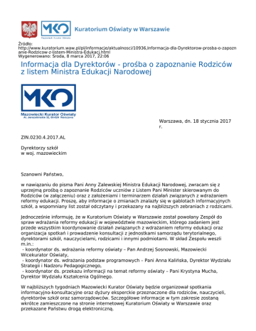 Źródło: http://www.kuratorium.waw.pl/pl/informacje/aktualnosci/10936,Informacja-dla-Dyrektorow-prosba-o-zapozn anie-Rodzicow-z-listem-Ministra-Edukacj.html Wygenerowano: Środa, 8 marca 2017, 22:06 Informacja dla Dyrektorów - prośba o zapoznanie Rodziców z listem Ministra Edukacji Narodowej Warszawa, dn. 18 stycznia 2017 r. ZIN.0230.4.2017.AL Dyrektorzy szkół w woj. mazowieckim Szanowni Państwo, w nawiązaniu do pisma Pani Anny Zalewskiej Ministra Edukacji Narodowej, zwracam się z uprzejmą prośbą o zapoznanie Rodziców uczniów z Listem Pani Minister skierowanym do Rodziców (w załączeniu) oraz z założeniami i terminarzem działań związanych z wdrażaniem reformy edukacji. Proszę, aby informacje o zmianach znalazły się w gablotach informacyjnych szkół, a wspomniany list został odczytany i przekazany na najbliższych zebraniach z rodzicami. Jednocześnie informuję, że w Kuratorium Oświaty w Warszawie został powołany Zespół do spraw wdrażania reformy edukacji w województwie mazowieckim, którego zadaniem jest przede wszystkim koordynowanie działań związanych z wdrażaniem reformy edukacji oraz organizacja spotkań i prowadzenie konsultacji z jednostkami samorządu terytorialnego, dyrektorami szkół, nauczycielami, rodzicami i innymi podmiotami. W skład Zespołu weszli m.in.: - koordynator ds. wdrażania reformy oświaty – Pan Andrzej Sosnowski, Mazowiecki Wicekurator Oświaty, - koordynator ds. wdrażania podstaw programowych – Pani Anna Kalińska, Dyrektor Wydziału Strategii i Nadzoru Pedagogicznego, - koordynator ds. przekazu informacji na temat reformy oświaty – Pani Krystyna Mucha, Dyrektor Wydziału Kształcenia Ogólnego. W najbliższych tygodniach Mazowiecki Kurator Oświaty będzie organizował spotkania informacyjno-konsultacyjne oraz dyżury eksperckie przeznaczone dla rodziców, nauczycieli, dyrektorów szkół oraz samorządowców. Szczegółowe informacje w tym zakresie zostaną wkrótce zamieszczone na stronie internetowej Kuratorium Oświaty w Warszawie oraz przekazane Państwu drogą elektroniczną. Ponadto informuję, że Kuratorium Oświaty w Warszawie uruchomiło specjalny adres e-mail: [email protected] oraz infolinię: 22 551 24 22, na które wszyscy zainteresowani mogą kierować pytania związane z reformą edukacji. Przypominam również, że na stronie Ministerstwa Edukacji Narodowej działa serwis informacyjny „Dobra Szkoła” pod adresem www.reformaedukacji.men.gov.pl. Można w nim znaleźć najważniejsze informacje na temat reformy edukacji z punktu widzenia rodzica, ucznia, nauczyciela, dyrektora oraz organu prowadzącego szkołę. Serwis zawiera m.in. informacje o aktualnych wydarzeniach dotyczących reformy, harmonogram zmian oraz odpowiedzi na najczęściej zadawane pytania. Wyrażam nadzieję, że dzięki wspólnie podejmowanym działaniom, będziemy skutecznie realizować kolejne etapy wprowadzania reformy edukacji, dzięki której w polskich szkołach zostaną stworzone właściwe warunki do pełnego rozwoju dzieci i młodzieży. Z wyrazami szacunku, Mazowiecki Kurator Oświaty /-/ Aurelia Michałowska Załączniki do strony List Ministra Edukacji Narodowej do Rodziców 744.52 KB Data publikacji 18.01.2017 Data modyfikacji 31.01.2017 Osoba wytwarzająca/odpowiadająca za informację: Aldona Lodzińska Osoba udostępniająca informację: Dominika Stodolak
