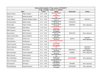 Komunikat obsady IV ligi, sezon 2016/2017 Mecz IV liga -13 kolejka - Termin: 8 - 9 .10.2016 r. Termin Sędzia Szczech Łukasz 8.10. - 15:00 SC Urban Piotr 9.10. - 15:30 SC Rychlewski Karol 9.10. - 16:00 Ws C-O Sypniewski Jakub 8.10. - 15:30 Ws W-wa Mandes Krzysztof 8.10. - 12:00 Ws W-wa Rupniewski Paweł 8.10. 12:30 Ws W-wa Wolski Kamil 8.10. - 11:00 Ws Siedlce Gwiazda Paweł 8.10 - 12:00 Ws C-O Falencki Marcin 8.10. - 11:00 Ws C-O Chojnacki Piotr 8.10. - 11:00 Ws W-wa Malinowski Przemysław 8.10. - 13:00 SC Mazovia M.Maz. Pogoń Grodzisk Tęcza Łyse Mławianka Mława Czarni Węgrów Podlasie Sokołów Podlaski KS Ożarowianka Błękitni Raciąż Dolcan Ząbki Pogoń II Siedlce Unia Warszawa Delta Słupno MKS Przasnysz Wisła II Płock Bug Wyszków MKS Ciechanów Ostrovia Ostrów Maz. Bzura Chodaków KS Łomianki Hutnik W-wa Orzeł Wierzbica KS Błonianka Oskar Przysucha Grom Warszawa 8.10. - 14:30 Sparta Jazgarzew Szydłowianka 8.10. - 11:00 LKS Promna Proch Pionki 9.10. - 13:00 Mszczonowianka Victoria Sulejówek 8.10. - 15:00 Mazur Karczew Wilga Garwolin 8.10. - 15:00 Broń 1926 Radom MKS Piaseczno 8.10. - 17:00 Znicz II Pruszków Start Otwock 8.10. - 10:00 KS Konstancin KS Raszyn 8.10. - 15:30 Pilica Biaobrzegi Energia Kozienice 8.10. - 15:00 Obserwator Zmiany KLESZCZ DELEGAT KOWNACKI MĄDRZAK Mecz nagrywany SIEDLECKI Mecz nagrywany GUDYN DELEGAT Mecz nagrywany Kaim Rafał WS Siedlce RzucidłoPiotr SC Feltynowski Adrian Ws Płock Rowicki Łukasz Ws W-wa Baranowski Kamil SC Wójcik Karol Ws Siedlce Maciejewski Daniel Ws Radom Jenda Mateusz Ws W-wa Pietrzyk Maciej Ws Radom DELEGAT BRUDNICKI DELEGAT Mecz nagrywany WRÓBEL Mecz nagrywany CZAJKOWSKI Mecz nagrywany GROMEK Mecz nagrywany CIEĆWIERZ Mecz nagrywany Mecz Pogoń Grodzisk Maz. Hutnik Warszawa Bzura Chodaków KS Łomianki MKS Ciechnów Ostrovia Ostrów Maz. Wisła II Płock Bug Wyszków Delta Słupno MKS Przasnysz Pogoń II Siedlce Unia Warszawa Błękitni Raciąż Dolcan Ząbki Podlasie Sokołów Podl. Ożarowianka Mławianka Mława Czarni Węgrów Mazovia Mińsk Maz. Tęcza Łyse KS Błonianka Energia Kozienice KS Raszyn Pilica Białobrzegi Start Otwock KS Konstancin MKS Piaseczno Znicz II Pruszków Wilga Garwolin Broń 1926 Radom Victoria Sulejówek Mazur Karczew Proch Pionki Mszczonowianka Szydłowianka LKS Promna Grom Warszawa Sparta Jazgarzew Orzeł Wierzbica Oskar Przysucha IV liga - 14 kolejka - Termin: 15 - 16. 10. 2016 r. Termin Sędzia Szczech Łukasz 15.10. - 15:30 SC Rybus Piotr 15.10. - 15:00 WS W-wa Karpiński Tomasz 15.10. - 15.00 Ws Płock Chmielewski Kamil 15.10. - 14:00 SC Gudyn Łukasz 15.10. - 14:00 SC Wrochna Michał 16.10. - 18:00 Ws Radom Gwiazda Paweł 15.10. - 15:00 Ws C-O Lewandowski Marek 16.10. - 15:00 Ws W-wa Grzeszczak Patryk 15.10. - 15:30 WS W-wa Lewandowski Piotr 15.10. - 15:00 Ws W-wa Marcinkowski Piotr 15.10. - 11:00 Ws W-wa Sawicki Dawid 15.10. - 11:00 Ws Radom Posuniak Maciej 15.10. - 13:00 Ws Radom Chyba Piotr 15.10. - 15:30 Ws Płock Mandes Krzysztof 16.10. - 15:00 Ws W-wa Majewski Kamil 16.10. - 11.00 Ws C-O Trawiński Łukasz 16.10. - 15:00 Ws W-wa Trawiński Mateusz 15.10. - 14:00 Ws W-wa Mital Artur 15.10. - 11:00 Ws C-O Księżopolski Paweł 15.10. - 13:00 Ws Siedlce Obserwator Zmiany DELEGAT KACPERSKI KOWNACKI DELEGAT nagrywany Mecz Mecz nagrywany MĄDRZAK RYSZAWA MIANOWSKI ŚMIETANKA Mecz nagrywany KLESZCZ Mecz nagrywany CIECIERSKI DELEGAT Mecz nagrywany CHOLEWA DELEGAT Mecz nagrywany WRÓBEL Mecz nagrywany