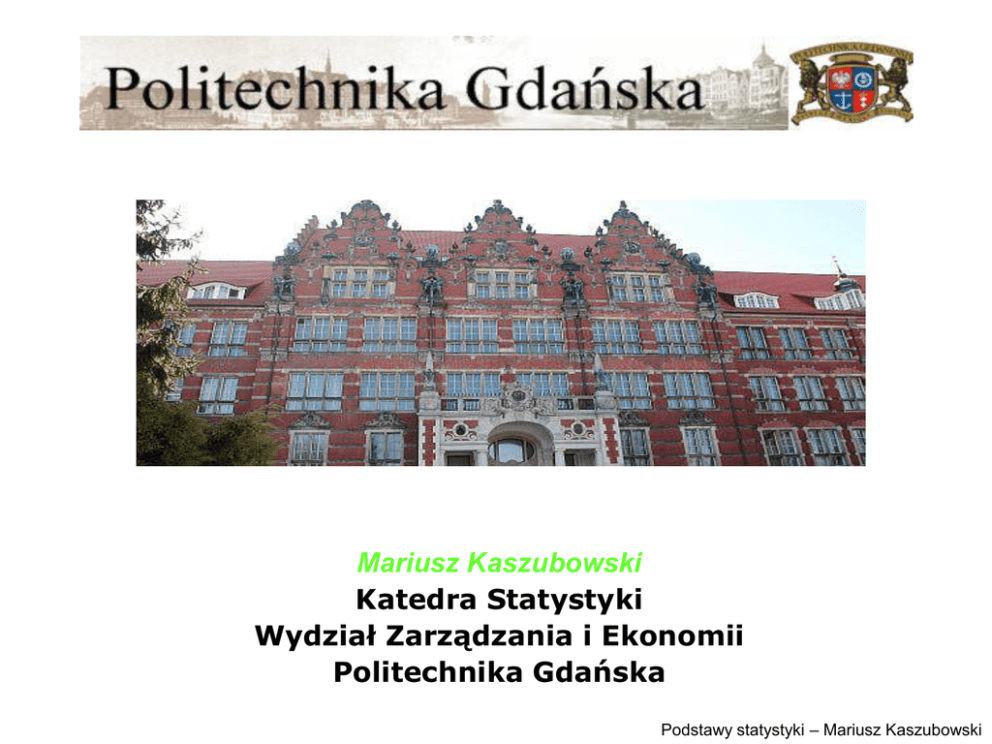 Mariusz Kaszubowski Katedra Statystyki Wydział Zarządzania i Ekonomii Politechnika Gdańska Podstawy statystyki – Mariusz Kaszubowski Indeksy tendencji rozwojowej Ćwiczenia nr 5 Podstawy statystyki Podstawy statystyki – Mariusz Kaszubowski Podstawowe pojęcia • • • • indeksy jako wskaźniki dynamiki indeksy jednopodstawowe indeksy łańcuchowe tempo przyrostu Podstawy statystyki – Mariusz Kaszubowski Podstawy statystyki – Mariusz Kaszubowski Podstawy statystyki – Mariusz Kaszubowski Zadanie 1 Poniższa tabela przedstawia liczbę zgonów w latach 1999-2006 jakie miały miejsce na terenie Polski (dane GUS). Przedstaw dynamikę zgonów za pomocą indeksów jednopodstawowych i łańcuchowych. Oblicz średnie tempo wzrostu i zmian. Podstawy statystyki – Mariusz Kaszubowski Rozwiązanie Podstawy statystyki – Mariusz Kaszubowski Zadanie 2 Używając indeksów Laspeyresa, Paaschego i Fishera określ dynamikę spożycia grupy poniższych artykułów w 2008 roku w porównaniu do roku 2007. Podstawy statystyki – Mariusz Kaszubowski Rozwiązanie Łączna wartość koszyka artykułów spożywczych w 2008 roku wzrosła o16% w stosunku do wartości z 2007 roku. Podstawy statystyki – Mariusz Kaszubowski Przy założeniu stałych cen z 2007 roku ilość spożywanych artykułów zwiększyła się o 17,1%. Przy założeniu stałych cen z 2008 roku ilość spożywanych artykułów zwiększyła się 15,9%. Nastąpił wzrost ilości spożywanych artykułów średnio 16,5% Podstawy statystyki – Mariusz Kaszubowski Przy założeniu stałych ilości z 2007 roku wartość spożywanych artykułów nie zmieniła się. Przy założeniu stałych ilości z 2008 roku wartość spożywanych artykułów zmniejszyła się 0,9%. Nastąpił nieznaczny spadek cen spożywanych artykułów średnio 0,4% Zadanie 3 Poniższa tabela przedstawia liczbę rozwodów w latach 1999-2006 jakie miały miejsce na terenie Polski (dane GUS). Przedstaw dynamikę rozwodów za pomocą indeksów jednopodstawowych i łańcuchowych. Podstawy statystyki – Mariusz Kaszubowski Zadanie 4 Oblicz dynamikę wartości sprzedanych polis przez wymienione towarzystwa ubezpieczeniowe w roku 1997 w stosunku do 1995. Jaki wpływ na uzyskaną wartość sprzedanych polis wywarły zmiany w strukturze wysokości składek ubezpieczeniowych a jaki zmiany w strukturze liczby sprzedanych polis? Podstawy statystyki – Mariusz Kaszubowski