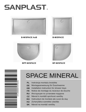 B-M/SPACE AxB BPP-M/SPACE B-M/SPACE BP-M/SPACE ( 01) 2000000143794( 94) SPACE MINERAL PL DE GB FR RU CZ RO HU SK Instrukcja montażu brodzika Montageanweisung für Duschwanne Installation instruction for shower trays Notice de montage du receveur de douche Инструкция по установке поддона Návod k montáži sprchové vaničky Instrucţiuni de montare ale cuvei de duş Zuhanytálca szerelési utasítás Návod na montáž vaničky SPACE MINERAL STANDARD OPTION PL DE GB FR RU CZ RO HU SK 2 Prosimy zamawiać osobno Bitte separat bestellen Please order separately Prière de commander séparément Нужно Заказывать Отдельно! Prosíme objednávat zvlášt' Va rog, sa comandati separat Kérjük, külön rendelje meg Prosíme objednávat´ oddelene A A 90 A A B A-A OPTION A-A AxB 800x800 900x900 1000x1000 B-M/SPACE 80x80x1,5 B-M/SPACE 90x90x1,5 B-M/SPACE 100x100x1,5 STS-088 STS-089 STS-090 B 90 A-A A 15 A A 30 120 200 200 R5 50 OPTION C AxB С BP-M/SPACE 80x80x1,5 800x800 250 STS-077 BP-M/SPACE 90x90x1,5 900x900 350 STS-072 BP-M/SPACE 100x100x1,5 1000x1000 450 STS-076 200 A C 55 15 A-A AxB 1100x900 С R OPTION R 350 550 STS-087 BPP-M/SPACE 100x100x1,5 1000x1000 500 500 STS-087 BPP-M/SPACE 90x110x1,5 30 120 A B A 90 AxB B-M/SPACE 70x80x1,5 B-M/SPACE 70x90x1,5 B-M/SPACE 70x100x1,5 B-M/SPACE 70x110x1,5 B-M/SPACE 70x120x1,5 B-M/SPACE 70x130x1,5 B-M/SPACE 70x140x1,5 B-M/SPACE 70x150x1,5 B-M/SPACE 70x160x1,5 B-M/SPACE 70x170x1,5 B-M/SPACE 75x90x1,5 B-M/SPACE 75x100x1,5 B-M/SPACE 75x110x1,5 B-M/SPACE 75x120x1,5 B-M/SPACE 75x130x1,5 B-M/SPACE 80x90x1,5 B-M/SPACE 80x100x1,5 B-M/SPACE 80x110x1,5 B-M/SPACE 80x120x1,5 B-M/SPACE 80x130x1,5 B-M/SPACE 80x140x1,5 B-M/SPACE 80x150x1,5 B-M/SPACE 80x160x1,5 B-M/SPACE 80x170x1,5 B-M/SPACE 80x180x1,5 B-M/SPACE 90x100x1,5 B-M/SPACE 90x110x1,5 B-M/SPACE 90x120x1,5 B-M/SPACE 90x130x1,5 B-M/SPACE 90x140x1,5 B-M/SPACE 90x150x1,5 B-M/SPACE 90x160x1,5 B-M/SPACE 90x170x1,5 B-M/SPACE 90x180x1,5 B-M/SPACE 100x110x1,5 B-M/SPACE 100x120x1,5 B-M/SPACE 100x130x1,5 B-M/SPACE 100x140x1,5 B-M/SPACE 100x150x1,5 B-M/SPACE 100x160x1,5 B-M/SPACE 100x170x1,5 B-M/SPACE 100x180x1,5 800x700 900x700 1000x700 1100x700 1200x700 1300x700 1400x700 1500x700 1600x700 1700x700 900x750 1000x750 1100x750 1200x750 1300x750 900x800 1000x800 1100x800 1200x800 1300x800 1400x800 1500x800 1600x800 1700x800 1800x800 1000x900 1100x900 1200x900 1300x900 1400x900 1500x900 1600x900 1700x900 1800x900 1100x1000 1200x1000 1300x1000 1400x1000 1500x1000 1600x1000 1700x1000 1800x1000 OPTION 30 120 B 90 30 120 A 200 200 A STS-086 STS-086 STS-086 STS-084 STS-084 STS-084 STS-084 STS-085 STS-085 STS-085 STS-086 STS-086 STS-084 STS-084 STS-084 STS-088 STS-088 STS-082 STS-082 STS-082 STS-082 STS-081 STS-081 STS-081 STS-081 STS-089 STS-078 STS-078 STS-078 STS-078 STS-073 STS-073 STS-073 STS-073 STS-079 STS-079 STS-079 STS-079 STS-080 STS-080 STS-080 STS-080 3 SPACE MINERAL A B 0,2 - 0,4 mm C 0,2 - 0,4 mm 4 A STS 2 -1 – STS PL DE GB FR RU CZ RO HU SK -6 STS -7 Prosimy zamawiać osobno Bitte separat bestellen Please order separately Prière de commander séparément Нужно Заказывать Отдельно! Prosíme objednávat zvlášt' Va rog, sa comandati separat Kérjük, külön rendelje meg Prosíme objednávat´ oddelene max 10 OK NO NO 1 ON APRO CAISS DU N FOR RZE AGE UCTIO SCHÜ FÜR MONT INSTR DE CE ION SUNG NOTI LLAT NWEI Prosimy zamawiać osobno Bitte separat bestellen Please order separately Prière de commander séparément Нужно Заказывать Отдельно! Prosíme objednávat zvlášt' Va rog, sa comandati separat Kérjük, külön rendelje meg Prosíme objednávat´ oddelene MONT Silik on 3 1 19 II 4 h I 3 2 h PL DE GB FR RU CZ RO HU SK NS INSTAAGEA Sili kon FR GB DE 5 SPACE MINERAL ~ 10 B 3 2 h= 2 1 / 1 Sili kon Sili kon on Silik 3 5 6 ~ 10 C 3 2 0,2 - 0,4 mm h= 2 1 / 1 S il ik Sili kon Sili kon on 3 5 4 7 DE MONTAGE: Zur Beibehaltung der optimalen Parameter, wird es von dem Produzenten empfohlen, die Montage von einem Fachmann durchführen zu lassen. Die aktuelle Übersicht der empfohlenen Servicepunkte finden Sie auf der Internetseite: www.sanplast.pl. Das Produkt sollte so montiert werden, damit es auch einfach demontiert werden kann, d.h. auf solche Art und Weise, damit man es im Fall einer Beschädigung demontieren könnte, ohne gleichzeitig den Fliesenbelag zu beschädigen. Die Duschwanne/Badewanne sollte man zum Fliesenbelag zuschieben und abdichten. PFLEGEHINWEISE: bitte flüssige Reinigungsmittel verwenden (Achtung! Bitte Reinigungsmittel, die Schleifmittel beinhalten vermeiden, weil sie Kratzer verursachen können). Die Produkte dürfen nicht unter Einfluss von Säuren, Ammoniak, Reiz- und Ätzmittel, Chlorverbindungen oder Färbmittel gesetzt werden. KLEINE REPARATUREN: Kratzspuren auf Oberflächen mit feuchtem feinem Sandpapier (beginnen mit Nr 800 bis Nr 1500 am Ende) vorsichtig mit Spezialpoliercreme polieren. Auf der Produktrückseite sind Entluftungsspuren zugelassen. Achtung! Während des Bades besonders mit Anwendung von Seife, Schampoo, Badeöl usw. wird die Duschwannen - und Badewannenoberfläche sehr glitschig! Achtung: Der Hersteller behält sich das Recht vor, technische Änderungen und Farbenänderungen in den Produkten einzuführen. GB Installation: Producer recommends installation by the qualified installer to keep optimal parameters of product. Current list of recommended service points can be found at www.sanplast.pl. Product should be installed in a way which enables an easy dismantling in case of failure, so that the tiles were not damaged. The Shower tray/bathtub should be sealed and slided to the glaze. CARE AND MAINTENANCE: Clean ordinary cleaning fluid (Note! cleaners containing abrasive are not recommended and may cause surface scratches), products should not be subjected to action: acids, ammonia and corrosive and irritants, or chlorine compounds (such as measures to cleaning the toilets) and the hi