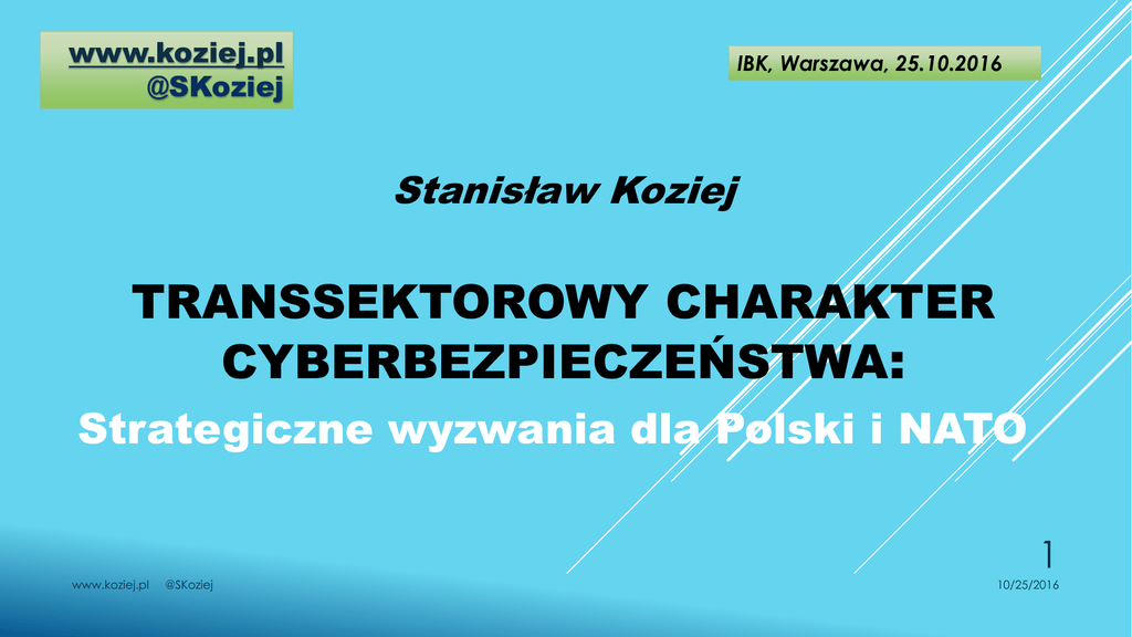 www.koziej.pl @SKoziej IBK, Warszawa, 25.10.2016 Stanisław Koziej TRANSSEKTOROWY CHARAKTER CYBERBEZPIECZEŃSTWA: Strategiczne wyzwania dla Polski i NATO 1 www.koziej.pl @SKoziej 10/25/2016 PLAN 1. Istota i charakter cyberbezpieczeństwa 2. Polska: strategiczne wyzwania w dziedzinie cyberbezpieczeństwa 3. Cyberbezpieczeństwo w ramach NATO 2 www.koziej.pl @SKoziej 10/25/2016 CYBERBEZPIECZEŃSTWO JAKO RODZAJ BEZPIECZEŃSTWA Bezpieczeństwo Bezpieczeństwo jako kategoria polityczna Bezpieczeństwo informacyjne Cyberbezpieczeństwo 3 www.koziej.pl @SKoziej 10/25/2016 Bezpieczeństwo informacyjne państwa - transsektorowy obszar bezpieczeństwa, którego treść odnosi się do środowiska informacyjnego (w tym cyberprzestrzeni) państwa; proces, którego celem jest zapewnienie bezpiecznego funkcjonowania państwa w przestrzeni informacyjnej poprzez panowanie we własnej, wewnętrznej, krajowej infosferze oraz efektywną ochronę interesów narodowych w zewnętrznej (obcej) infosferze. Osiąga się to poprzez realizację takich zadań jak: zapewnienie adekwatnej ochrony posiadanych zasobów informacyjnych oraz ochrony przed wrogimi działaniami dezinformacyjnymi i propagandowymi (w wymiarze defensywnym) przy jednoczesnym zachowaniu zdolności do prowadzenia wobec ewentualnych przeciwników (państw lub innych podmiotów) działań ofensywnych w tym obszarze. 4 www.koziej.pl @SKoziej 10/25/2016 Cyberbezpieczeństwo państwa (bezpieczeństwo państwa w cyberprzestrzeni) - transsektorowy obszar bezpieczeństwa, obejmujący proces zapewniania bezpiecznego funkcjonowania w cyberprzestrzeni państwa jako całości, jego elementów (struktur, osób fizycznych i osób prawnych, w tym przedsiębiorców i innych podmiotów nieposiadających osobowości prawnej) oraz będących w ich dyspozycji systemów teleinformatycznych i zasobów informacyjnych. 5 www.koziej.pl @SKoziej 10/25/2016 Rozróżnienie pojęć: „BEZPIECZEŃSTWO PAŃSTWA W CYBERPRZESTRZENI” oraz „BEZPIECZEŃSTWO CYBERPRZESTRZENI PAŃSTWA” (raczej ochrona cyberprzestrzeni) 6 www.koziej.pl @SKoziej 10/25/2016 CYBERBEZPIECZEŃSTWO A CYBEROBRONA I CYBEROCHRONA Cyberbezpieczeństwo Cyberobrona Cyberochrona (cyberbezpieczeństwo militarne, w siłach zbrojnych, w walce zbrojnej) (cyberbezpieczeństwo pozamilitarne) www.koziej.pl @SKoziej 7 10/25/2016 DZIEDZINY BEZPIECZEŃSTWA NARODOWEGO Obronna Ochronna Społeczna Gospodarcza … środowiska naturalnego infrastruktury krytycznej transportowy energetyczny finansowy … migracyjny demograficzny socjalny edukacyjny kulturowy ratownictwa prawa i porządku publicznego kontrwywiadowczy wywiadowczy militarny SEKTORY BEZPIECZEŃSTWA NARODOWEGO dyplomatyczny Kierowanie bezpieczeństwem narodowym TRANSSEKTOROWOŚĆ I WIELOPOZIOMOWOŚĆ CYBERBEZPIECZEŃSTWA Struktury rządowe Struktury samorządowe Podmioty prywatne (pozapaństwowe, pozarządowe) Obywatele www.koziej.pl @SKoziej 8 10/25/2016 Cyberbezpieczeństwo w procesie planowania strategicznego (w cyklu strategicznym) SAMOIDENTYFIKACJA STRATEGICZNA ŚRODOWISKO BEZPIECZEŃSTWA STRATEGIA OPERACYJNA STRATEGIA PREPARACYJNA www.koziej.pl @SKoziej Diagnoza państwa jako podmiotu bezpieczeństwa narodowego (podstawy bezpieczeństwa narodowego) i identyfikacja interesów narodowych i celów strategicznych w dziedzinie bezpieczeństwa Ocena i prognoza środowiska bezpieczeństwa – scenariusze rozwoju zewnętrznych i wewnętrznych uwarunkowań bezpieczeństwa Koncepcja działań strategicznych – sposoby osiągania celów strategicznych w przewidywanych uwarunkowaniach bezpieczeństwa Koncepcja przygotowań systemu bezpieczeństwa narodowego – sposoby utrzymywania i przekształcenia systemu bezpieczeństwa narodowego adekwatnie do przyszłych potrzeb operacyjnych 9 10/25/2016 DOKTRYNA CYBERBEZPIECZEŃSTWA RP  Strategiczny cel operacyjny: zapewnienie bezpiecznego funkcjonowania Rzeczypospolitej Polskiej w cyberprzestrzeni    Ustawa o cyber- w stanach nadzwyczajnych PSDO, plany operacyjne, ćwiczenia Strategiczny cel preparacyjny: zbudowanie zintegrowanego systemu cyberbezpieczeństwa RP   Rządowa Strategia Cyberbezpieczeństwa Rzeczypospolitej Polskiej na lata 2016-2020 Rozwój zdolności cyberobrony w siłach zbrojnych 10 www.koziej.pl @SKoziej 10/25/2016 Uderzenie i manewr INFORMATYZACJA/CYBERNETYZACJA: TRZECIA FALA MODERNIZACJI TECHNICZNEJ SIŁ ZBROJNYCH  System walki zbrojnej Uderzenie (ogień)  Manewr (ruch) Informacja (cyber-) informacja  Pierwsza fala (pierwsza dekada XXIw.) – Program Rozwoju SZ z 2001 r.:  F-16, Rosomak, Spike Druga fala (druga dekada) – Program Rozwoju SZ z 2012 r.:  Systemy przeciwrakietowe, śmigłowce Trzecia fala (trzecia dekada) – przyszły wieloletni program rozwoju SZ    Cyberobrona Bezzałogowce (NPSB) Broń inteligentna z technologiami satelitarnymi 11 www.koziej.pl @SKoziej 10/25/2016 SUWERENNOŚĆ W CYBERPRZESTRZENI  Wysoce zinformatyzowane systemy walki i wsparcia (WZSWiW), np.:  systemy przeciwrakietowe, przeciwlotnicze, broń inteligentna (precyzyjna), bezzałogowce, samoloty, śmigłowce, okręty podwodne (rakiety i torpedy) … Pewność wykorzystania takiego sprzętu zależy od pełnego dysponowania ich podsystemami informatycznymi („panowanie cyber/informatyczne”)  Dlatego przy zakupach obcych wysoce zinformatyzowanych systemów broni „priorytetem priorytetów” musi być uzyskanie dostępu do tzw. „kodów źródłowych”  12 www.koziej.pl @SKoziej 10/25/2016 CYBERBEZPIECZEŃSTWO W RAMACH NATO  Cyberobrona jest częścią obrony kolektywnej na podstawie art.5. tak, jak obrona lądzie morzu i w powietrzu (szczyt w Warszawie)  NATO uznaje, że prawo międzynarodowe stosuje się również odpowiednio do cyberprzestrzeni (Podręcznik „talliński” z 2013r.).  NATO odpowiada za ochronę własnych sieci informatycznych oraz koordynację wysiłków narodowych, a także rozwój edukacji i ćwiczeń w zakresie cyberobrony.  Państwa sojusznicze zobowiązały się do ochrony swoich sieci, wymiany 