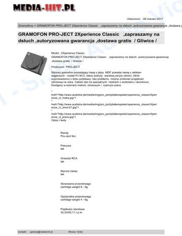 o i d d i V Utworzono : 08 marzec 2017 Gramofony > GRAMOFON PRO-JECT 2Xperience Classic ,zapraszamy na dsłuch ,autoryzowana gwarancja ,dostawa g GRAMOFON PRO-JECT 2Xperience Classic ,zapraszamy na dsłuch ,autoryzowana gwarancja ,dostawa gratis / Gliwice / p le Model : 2Xperience Classic u A GRAMOFON PRO-JECT 2Xperience Classic ,zapraszamy na dsłuch ,autoryzowana gwarancja ,dostawa gratis / Gliwice / k S Producent : PRO-JECT l p Stylowy gramofon posiadający bazę z płyty MDF posiada ramię z włókien węglowych - model PJ 9CC, talerz pokryty warstwą winylu (4mm). Silnik wyprowadzono z boku podstawy, bez problemu można zmieniać przędkość obrotową na rolce. Całość stoi na specjalnych nóżkach z sorbotanu i aluminium. Dostępny w kolorach mahoń, olivkowym i czarnym piano. " href="http://www.audiotra.de/media/img/pro_ject/plattenspieler/xperience_classic/Xperi ence_cl_maha.jpg"> " href="http://www.audiotra.de/media/img/pro_ject/plattenspieler/xperience_classic/Xperi ence_cl_olive-01.jpg"> " href="http://www.audiotra.de/media/img/pro_ject/plattenspieler/xperience_classic/Xperi ence_cl_piano.jpg"> Opisy i testy Ramię Pro-Ject 9cc Pokrywa tak Gniazda RCA tak Record clamp tak Stosowana przeciwwaga cartridge weight 6 - 9g Opcjonalna przeciwwaga cartridge weight 4 - 6g Prędkości obrotowe 33,33/45,11 r.p.m. kontakt : - [email protected] Strona 1/{nb} o i d d i V Utworzono : 08 marzec 2017 Gramofony > GRAMOFON PRO-JECT 2Xperience Classic ,zapraszamy na dsłuch ,autoryzowana gwarancja ,dostawa g GRAMOFON PRO-JECT 2Xperience Classic ,zapraszamy na dsłuch ,autoryzowana gwarancja ,dostawa gratis / Gliwice / p le Odchylenie obrotów ±0,5 % l p k S u A Kołysanie obrotów ±0,08 % Stosunek S/N -70dB Nacisk 10 - 30mN Długość ramienia 9 " (230mm) Masa ramienia 9g Overhang 18mm Waga telerza /średnica 2kg/300mm Rozmiary (otwarta pokrywa) 390 x 460 x 460mm Rozmiary (zamknięta pkrywa) 133 x 460 x 350mm Waga z pokrywą 7,6kg Zasilanie 220 - 240V, 50Hz kontakt : - [email protected] Strona 2/{nb} o i d d i V Utworzono : 08 marzec 2017 Gramofony > GRAMOFON PRO-JECT 2Xperience Classic ,zapraszamy na dsłuch ,autoryzowana gwarancja ,dostawa g GRAMOFON PRO-JECT 2Xperience Classic ,zapraszamy na dsłuch ,autoryzowana gwarancja ,dostawa gratis / Gliwice / p le Pobór mocy 2W k S u A Cena : 5.350,00 zł Brutto ( 4.349,59 zł Netto) l p Dostępność: Produkt dostępny w naszym sklepie od 16 październik 2012 kontakt : - [email protected] Strona 3/{nb}