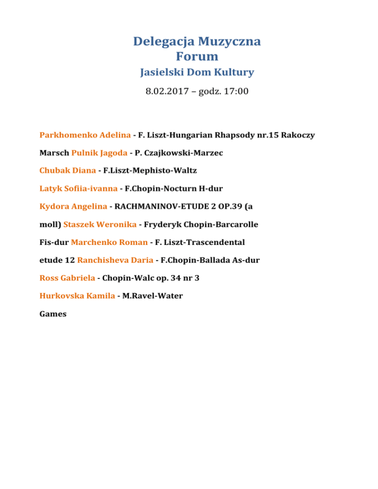 Delegacja Muzyczna Forum Jasielski Dom Kultury 8.02.2017 – godz. 17:00 Parkhomenko Adelina - F. Liszt-Hungarian Rhapsody nr.15 Rakoczy Marsch Pulnik Jagoda - P. Czajkowski-Marzec Chubak Diana - F.Liszt-Mephisto-Waltz Latyk Sofiia-ivanna - F.Chopin-Nocturn H-dur Kydora Angelina - RACHMANINOV-ETUDE 2 OP.39 (a moll) Staszek Weronika - Fryderyk Chopin-Barcarolle Fis-dur Marchenko Roman - F. Liszt-Trascendental etude 12 Ranchisheva Daria - F.Chopin-Ballada As-dur Ross Gabriela - Chopin-Walc op. 34 nr 3 Hurkovska Kamila - M.Ravel-Water Games