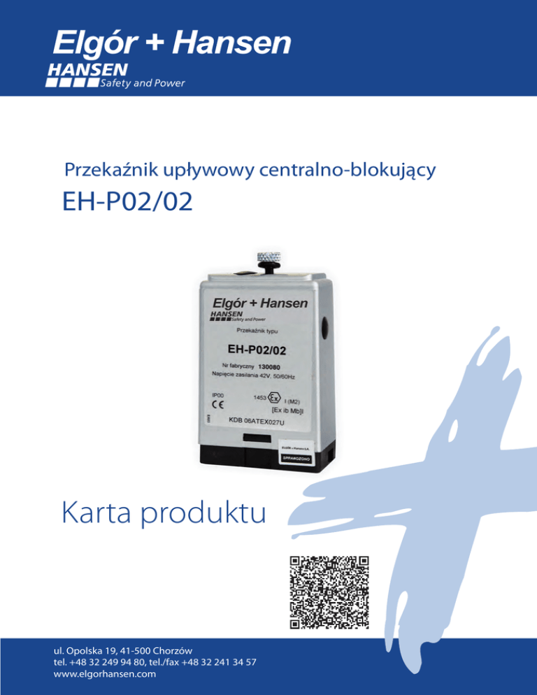 Przekaźnik upływowy centralno-blokujący EH-P02/02 Karta produktu ul. Opolska 19, 41-500 Chorzów tel. +48 32 249 94 80, tel./fax +48 32 241 34 57 www.elgorhansen.com CECHY CHARAKTERYSTYCZNE Przekaźnik upływowy centralno-blokujący typu EH-P02/02 przeznaczony jest do nadzorowania stanu izolacji trójfazowych instalacji elektroenergetycznych z izolowanym punktem neutralnym transformatora o napięciu znamionowym 230V. Przekaźnik zawiera człon centralny, realizujący pomiar wartości rezystancji doziemnej izolacji w czasie obecności w instalacji napięcia roboczego oraz dwa człony blokujące nadzorujące wartość rezystancji izolacji w stanie beznapięciowym. Aby umożliwić prawidłowe funkcjonowanie przekaźnika, instalacja nadzorowana powinna być wyposażona w dwa niezależne łączniki, zgodnie ze schematem aplikacyjnym. Obwody pomiarowe członu blokującego wykonane zostały jako iskrobezpieczne “ib”, zgodnie z wymaganiami norm PN-EN 50020 oraz PN-EN 50014. BUDOWA Przekaźnik wykonano w obudowie z tworzywa F III/L, w podstawie obudowy znajduje się złącze, służące do podłączenia obwodów zewnętrznych. Podzespoły elektroniczne zgrupowano na dwóch dwustronnych płytkach drukowanych. W celu uniknięcia omyłkowego podłączenia przekaźników różnego typu zastosowano bolce kodujące w podstawie przekaźników. OPIS DZIAŁANIA Działanie polega na pomiarze rezystancji doziemnej izolacji trójfazowych instalacji z izolowanym punktem neutralnym transformatora. Urządzenie składa się z dwóch członów blokujących oraz członu centralnego. Człony blokujące nadzorują stan izolacji w stanie beznapięciowym i zezwalają na podanie napięcia na odpowiedni obwód, gdy rezystancja izolacji doziemnej jest powyżej dopuszczalnej wartości. Człon centralny monitoruje instalację pod napięciem. Obniżenie wartości rezystancji doziemnej poniżej dopuszczalnej wartości powoduje odłączenie za pomocą styków przekaźników wykonawczych obydwu chronionych obwodów. Po zadziałaniu członu centralnego następuje zablokowanie przekaźników wykonawczych. Ponowne załączenie jest możliwe po wcześniejszym przywróceniu właściwego poziomu izolacji oraz skasowaniu blokady. Skasowania blokady członu centralnego można dokonać poprzez zwarcie ze sobą styków a3 i a4 przekaźnika lub za pośrednictwem szeregowego interfejsu transmisji danych zgodnie z zaimplementowanym protokołem, przy czym w danej aplikacji dostępna jest tylko jedna z w/w metod. Pierwsza metoda jest aktywna tylko wtedy, gdy adres przekaźnika ustawiony na zadajniku kodowym wynosi 0 DANE TECHNICZNE Typ EH-P02/02 Znamionowe napięcie zasilania 42V AC ±20% Maksymalne napięcie zasilania Um50,4V AC Moc znamionowa Maksymalne napięcie zacisków transmisji danych (a3, a4) <4W 50,4V AC Maksymalna długość przewodów transmisji danych Temperatura pracy Stopień ochrony obudowy Wilgotność względna powietrza przy temperaturze Wymiary zewnętrzne (szer. x wys. x gł.) Masa Cecha budowy przeciwwybuchowej Certyfikat badania typu 3m -10 C ÷ 65OC O IP00 35OC do 95% 115x70x40 mm 0,2kg 1453 I (M2) [Ex ib Mb] I WE KDB 06ATEX027U www.elgorhansen.com Przekaźnik upływowy centralno-blokujący EH-P02/02 Parametry pracy – człon centralny Znamionowe napięcie chronionej instalacji 230V Rezystancja zadziałania przy uszkodzeniu jednego toru 7kΩ± 20% Rezystancja zadziałania przy uszkodzeniu symetrycznym (21kΩ na fazę) 7kΩ+20% Czas zadziałania przy jednotorowym uszkodzeniu o wartości ≤1kΩ≤100ms Maksymalna pojemność zewnętrzna 1μF/faza Parametry pracy człon blokujący Rezystancja zadziałania 15kΩ±20% Maksymalna pojemność zewnętrzna 1µF/faza Współczynnik powrotu ≤1,5 Parametry obwodu iskrobezpiecznego U0 14,8V I0 241µA P0 0,89mW L0 8034H C0 3µF Obwód pomiarowy Napięcie pomiarowe członu centralnego 36V Maksymalny prąd pomiarowy członu centralnego 0,19mA Napięcie pomiarowe członu blokującego 12V Maksymalny prąd pomiarowy członu blokującego 0,4mA Wejście obwodu pomiarowego członu blokującego iskrobezpieczne „ib” Przekaźnik wykonawczy Prąd ciągły styków 5A cosφ=1, L/R=0 1,5A ACcosφ=0,4 0,5A DCL/R=7 ms Napięcie styków 50,4V AC Maksymalna długość przewodów łączących przekaźnik wykonawczy z obwodami zewnętrznymi SCHEMAT URZĄDZENIA b1 b2 a1 a2 42V AC a kasowanie członu centralnego R S485 b a3 a4 b3 b4 b5 CZŁON BLOKUJĄCY b6 b7 b8 a6 a7 a8 CZŁON BLOKUJĄCY ul. Opolska 19, 41-500 Chorzów tel. +48 32 249 94 80, tel./fax +48 32 241 34 57 www.elgorhansen.com 10 m