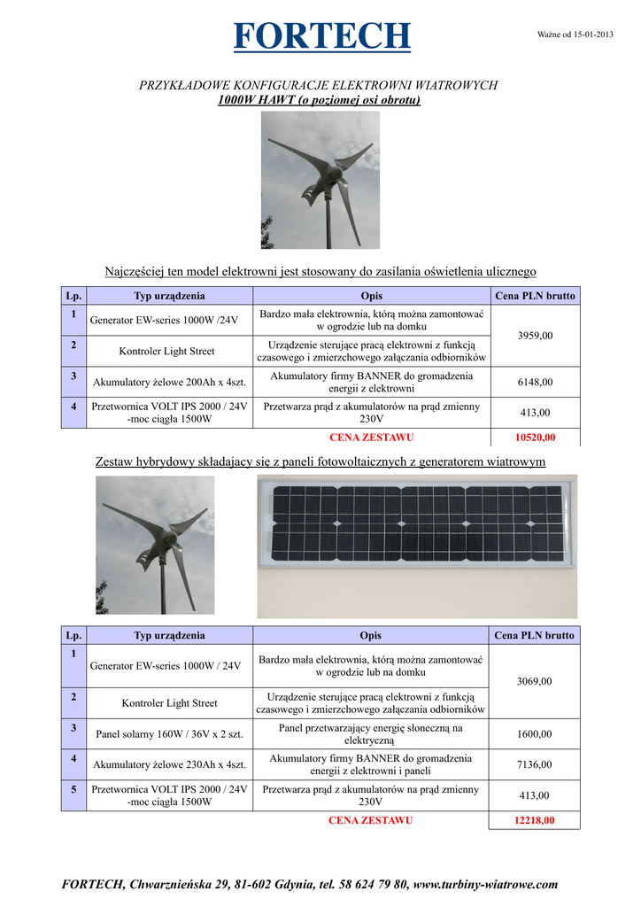 Ważne od 15-01-2013 PRZYKŁADOWE KONFIGURACJE ELEKTROWNI WIATROWYCH 1000W HAWT (o poziomej osi obrotu) Najczęściej ten model elektrowni jest stosowany do zasilania oświetlenia ulicznego Lp. 1 2 3 4 Typ urządzenia Opis Cena PLN brutto Generator EW-series 1000W /24V Bardzo mała elektrownia, którą można zamontować w ogrodzie lub na domku Kontroler Light Street Urządzenie sterujące pracą elektrowni z funkcją czasowego i zmierzchowego załączania odbiorników Akumulatory żelowe 200Ah x 4szt. Akumulatory firmy BANNER do gromadzenia energii z elektrowni 6148,00 Przetwornica VOLT IPS 2000 / 24V -moc ciągła 1500W Przetwarza prąd z akumulatorów na prąd zmienny 230V 413,00 CENA ZESTAWU 10520,00 3959,00 Zestaw hybrydowy składajacy się z paneli fotowoltaicznych z generatorem wiatrowym Lp. Typ urządzenia 1 Generator EW-series 1000W / 24V 2 3 4 5 Opis Bardzo mała elektrownia, którą można zamontować w ogrodzie lub na domku Cena PLN brutto 3069,00 Kontroler Light Street Urządzenie sterujące pracą elektrowni z funkcją czasowego i zmierzchowego załączania odbiorników Panel solarny 160W / 36V x 2 szt. Panel przetwarzający energię słoneczną na elektryczną 1600,00 Akumulatory żelowe 230Ah x 4szt. Akumulatory firmy BANNER do gromadzenia energii z elektrowni i paneli 7136,00 Przetwornica VOLT IPS 2000 / 24V -moc ciągła 1500W Przetwarza prąd z akumulatorów na prąd zmienny 230V 413,00 CENA ZESTAWU 12218,00 FORTECH, Chwarznieńska 29, 81-602 Gdynia, tel. 58 624 79 80, www.turbiny-wiatrowe.com Korzyści z własnej elektrowni wiatrowej § Produkuje energię elektryczną oraz cieplną (podgrzewanie ciepłej wody, centralne ogrzewanie) praktycznie za darmo § W miejscach gdzie nie ma sieci zwraca się w momencie uruchomienia § Standardowy czas zwrotu z inwestycji, w zależności od uwarunkowań lokalnych i konfiguracji elektrowni wiatrowej, wynosi 2-5 lat § Świetnie sprawdza się w przypadku zapewniania dostaw energii elektrycznej do: domów, obiektów gospodarczych, domków letniskowych, nadajników WiFi, kempingów, słupów oświetleniowych, pompek stawowych, fontann, przyczep campingowych, pól namiotowych, odległych domostw, a także obiektów, gdzie doprowadzenie energii jest zbyt kosztowne § Gwarantuje stałe i bezawaryjne dostawy energii § Turbiny małej mocy doskonale współpracują z panelami solarnymi w układach hybrydowych § W naszej szerokości geograficznej pozyskiwanie energii z wiatru jest znacznie bardziej efektywne od źródeł solarnych § Jest produktem w pełni ekologicznym, gdyż zamienia energię kinetyczną wiatru w energię elektryczną § Posiadając ją aktywnie chronisz środowisko naturalne, propagujesz zachowania przyjazne dla środowiska i budujesz swój pozytywny wizerunek Banki oraz instytucje wspierają inwestycje w odnawialne źródła energii proponując bardzo korzystne warunki kredytowania lub inne formy finansowania (w tym dotacje). Orientacyjna kwota rocznej oszczędności w PLN przy określonej stawce za 1kWh (~0,55 zł/kWh) w oparciu o roczną ilość wytwarzanej energii przez elektrownie. Moc elektrowni Prędkość wiatru/ (m/s) 4 4,5 5 5,5 6 6,5 7 7,5 8 8,5 9 9,5 10 12 500W 1kW 2kW 3kW 5kW 10kW 20kW 578,00 703,45 823,90 1002,10 1180,30 1435,50 1686,30 2047,65 2049,00 2567,95 2721,95 2900,70 3073,95 2225,85 809,60 982,85 1156,10 1406,90 1652,75 2009,15 2360,60 2866,60 3372,60 4095,30 4818,00 5155,15 5492,30 7140,10 1618,65 1965,70 2312,75 2808,85 3304,95 4013,35 4721,75 5733,20 6745,20 8190,60 9636,00 10310,30 10985,15 14275,80 1700,60 2033,35 2428,25 2905,10 3468,85 4148,10 4957,70 5926,25 7082,35 8465,05 10117,80 12093,40 14454,00 19272,00 2833,05 3386,90 4046,90 4837,25 5781,60 6914,05 8262,65 9876,90 11804,10 14106,95 16863,00 20153,65 24090,00 29924,40 3083,30 4389,00 6022,50 8017,35 10407,10 11030,25 16525,85 20325,90 24668,05 29587,25 35123,00 41309,40 48180,00 54408,00 5555,00 6639,05 7935,40 9486,40 11336,60 13548,15 16193,10 19358,90 23136,30 27650,70 33051,70 39502,65 47216,40 96360,00 Ceny mogą ulec zmianie. Aktualna cena uzależniona jest od kursu Euro. Konfiguracja zestawu elektrowni wiatrowej Uwaga: Zasady instalacji elementów elektronicznych takich jak kontroler, przetwornica oraz inwerter zostały szczegółowo opisane w osobnych instrukcjach. Skrócona, poglądowa instrukcja podłączania podzespołów elektronicznych do standardowego kontrolera (dostarczany opcjonalnie) FORTECH, Chwarznieńska 29, 81-602 Gdynia, tel. 58 624 79 80, www.turbiny-wiatrowe.com