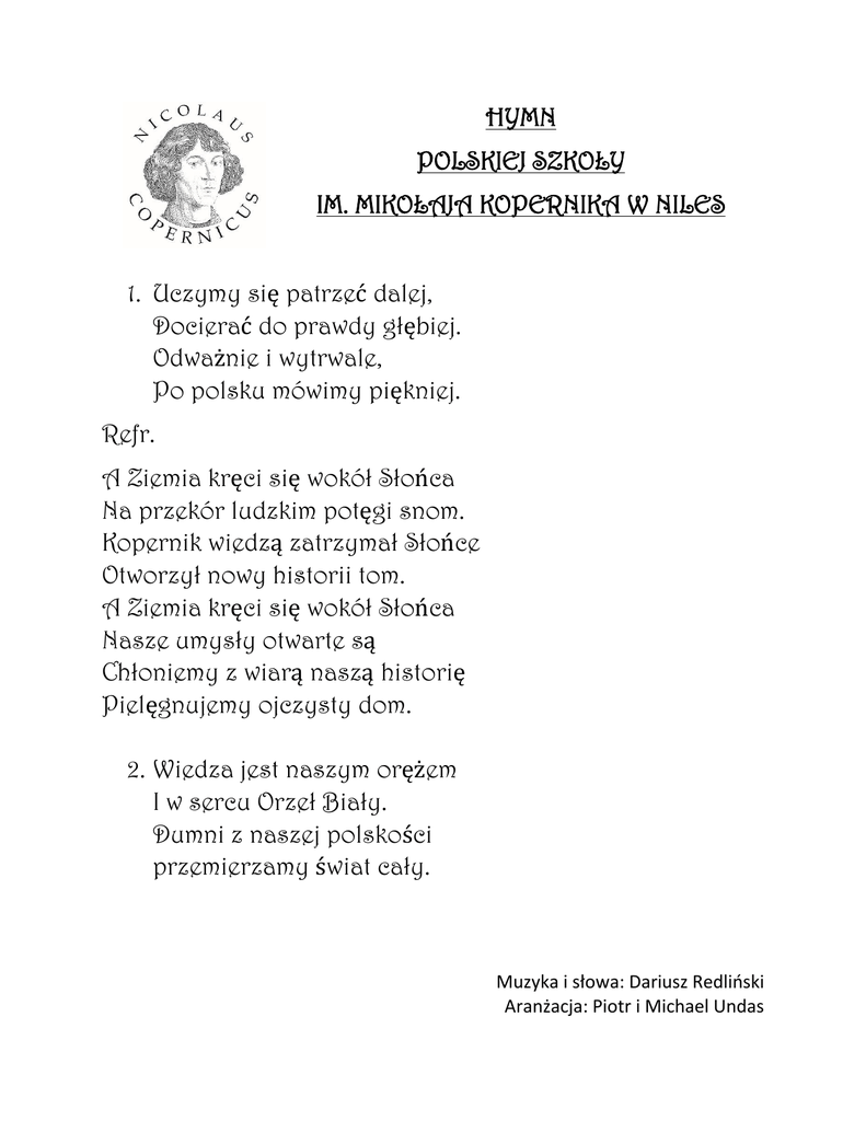 HYMN POLSKIEJ SZKOŁY IM. MIKOŁAJA KOPERNIKA W NILES 1. Uczymy się patrzeć dalej, Docierać do prawdy głębiej. Odważnie i wytrwale, Po polsku mówimy piękniej. Refr. A Ziemia kręci się wokół Słońca Na przekór ludzkim potęgi snom. Kopernik wiedzą zatrzymał Słońce Otworzył nowy historii tom. A Ziemia kręci się wokół Słońca Nasze umysły otwarte są Chłoniemy z wiarą naszą historię Pielęgnujemy ojczysty dom. 2. Wiedza jest naszym orężem I w sercu Orzeł Biały. Dumni z naszej polskości przemierzamy świat cały. Muzyka i słowa: Dariusz Redliński Aranżacja: Piotr i Michael Undas
