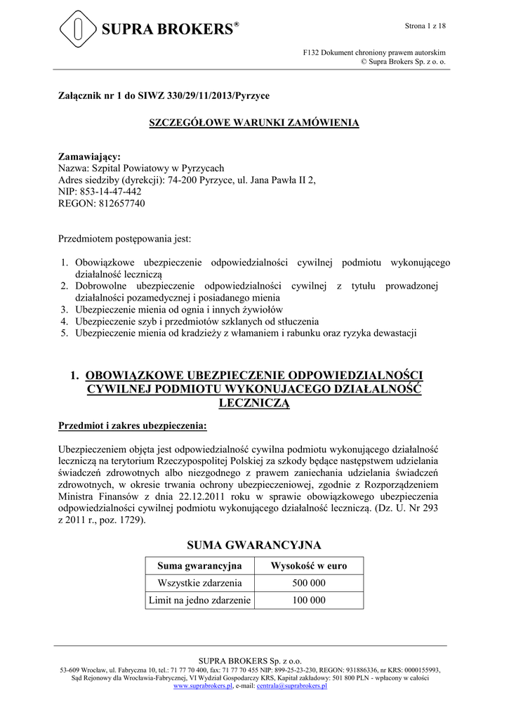 Strona 1 z 18 F132 Dokument chroniony prawem autorskim © Supra Brokers Sp. z o. o. Załącznik nr 1 do SIWZ 330/29/11/2013/Pyrzyce SZCZEGÓŁOWE WARUNKI ZAMÓWIENIA Zamawiający: Nazwa: Szpital Powiatowy w Pyrzycach Adres siedziby (dyrekcji): 74-200 Pyrzyce, ul. Jana Pawła II 2, NIP: 853-14-47-442 REGON: 812657740 Przedmiotem postępowania jest: 1. Obowiązkowe ubezpieczenie odpowiedzialności cywilnej podmiotu wykonującego działalność leczniczą 2. Dobrowolne ubezpieczenie odpowiedzialności cywilnej z tytułu prowadzonej działalności pozamedycznej i posiadanego mienia 3. Ubezpieczenie mienia od ognia i innych żywiołów 4. Ubezpieczenie szyb i przedmiotów szklanych od stłuczenia 5. Ubezpieczenie mienia od kradzieży z włamaniem i rabunku oraz ryzyka dewastacji 1. OBOWIĄZKOWE UBEZPIECZENIE ODPOWIEDZIALNOŚCI CYWILNEJ PODMIOTU WYKONUJACEGO DZIAŁALNOŚĆ LECZNICZĄ Przedmiot i zakres ubezpieczenia: Ubezpieczeniem objęta jest odpowiedzialność cywilna podmiotu wykonującego działalność leczniczą na terytorium Rzeczypospolitej Polskiej za szkody będące następstwem udzielania świadczeń zdrowotnych albo niezgodnego z prawem zaniechania udzielania świadczeń zdrowotnych, w okresie trwania ochrony ubezpieczeniowej, zgodnie z Rozporządzeniem Ministra Finansów z dnia 22.12.2011 roku w sprawie obowiązkowego ubezpieczenia odpowiedzialności cywilnej podmiotu wykonującego działalność leczniczą. (Dz. U. Nr 293 z 2011 r., poz. 1729). SUMA GWARANCYJNA Suma gwarancyjna Wysokość w euro Wszystkie zdarzenia 500 000 Limit na jedno zdarzenie 100 000 SUPRA BROKERS Sp. z o.o. 53-609 Wrocław, ul. Fabryczna 10, tel.: 71 77 70 400, fax: 71 77 70 455 NIP: 899-25-23-230, REGON: 931886336, nr KRS: 0000155993, Sąd Rejonowy dla Wrocławia-Fabrycznej, VI Wydział Gospodarczy KRS, Kapitał zakładowy: 501 800 PLN - wpłacony w całości www.suprabrokers.pl, e-mail: [email protected] Strona 2 z 18 F132 Dokument chroniony prawem autorskim © Supra Brokers Sp. z o. o. Udział własny: brak Franszyza integralna: brak Franszyza redukcyjna: brak 2. DOBROWOLNE UBEZPIECZENIE ODPOWIEDZIALNOŚCI CYWILNEJ Z TYTUŁU PROWADZONEJ DZIAŁALNOŚCI POZAMEDYCZNEJ I POSIADANEGO MIENIA Przedmiot i zakres ubezpieczenia: Odpowiedzialność cywilna za szkody osobowe powstałe w związku z prowadzoną działalnością pozamedyczną oraz wszelkie szkody rzeczowe w związku posiadanym i użytkowanym mieniem związanym z prowadzoną działalnością. Ubezpieczeniem objęte są również szkody powstałe w następstwie działania urządzeń wodociągowo - kanalizacyjnych, centralnego ogrzewania, gazu lub urządzeń związanych z dostarczaniem energii elektrycznej. Odpowiedzialnością Zakładu Ubezpieczeń objęte są wypadki ubezpieczeniowe, które zaszły w okresie ubezpieczenia, choćby roszczenia z ich tytułu zostały zgłoszone po tym okresie, jednakże przed upływem kodeksowego terminu przedawnienia. Przez wypadek ubezpieczeniowy rozumie się śmierć, uszkodzenie ciała, doznanie rozstroju zdrowia, utratę, zniszczenie, uszkodzenie rzeczy. Zakres odpowiedzialności Zakładu Ubezpieczeń zawiera ponadto następująco zdefiniowane rozszerzenia o szkody: 1) odpowiedzialność cywilna pracodawcy za wypadki przy pracy. Franszyza redukcyjna w kwocie wypłaconych świadczeń ZUS. Limit: 200 000 zł na jedno i wszystkie zdarzenia w okresie ubezpieczenia 2) OC za produkt (żywienie) Limit: 200 000 zł na jedno i wszystkie zdarzenia w okresie ubezpieczenia 3) w mieniu przechowywanym (pacjentów) Rozszerzenie zakresu odpowiedzialności o szkody w rzeczach wniesionych przez pacjenta w podmiocie leczniczym wykonującym działalność leczniczą w rodzaju stacjonarne i całodobowe świadczenia zdrowotne. 1. Z zachowaniem pozostałych nie zmienionych niniejszą klauzulą postanowień OWU, strony postanowiły rozszerzyć zakres ubezpieczenia o odpowiedzialność cywilną za szkody w rzeczach wniesionych przez pacjenta w podmiocie leczniczym oddanych na przechowanie w związku z udzielaniem świadczeń zdrowotnych. 2. Przez rzeczy oddane na przechowanie rozumie się rzeczy zwyczajowo posiadane przez pacjenta przyjmowanego w związku z udzielaniem świadczeń zdrowotnych. 3. Rzeczy wniesione przez pacjenta i oddane na przechowanie muszą być przechowywane w osobnych zamykanych pomieszczeniach, do których dostęp ma wyłącznie osoba odpowiedzialna – przyjmująca rzeczy na przechowanie. SUPRA BROKERS Sp. z o.o. 53-609 Wrocław, ul. Fabryczna 10, tel.: 71 77 70 400, fax: 71 77 70 455 NIP: 899-25-23-230, REGON: 931886336, nr KRS: 0000155993, Sąd Rejonowy dla Wrocławia-Fabrycznej, VI Wydział Gospodarczy KRS, Kapitał zakładowy: 501 800 PLN - wpłacony w całości www.suprabrokers.pl, e-mail: [email protected] Strona 3 z 18 F132 Dokument chroniony prawem autorskim © Supra Brokers Sp. z o. o. 4. 5. Rzeczy wniesione przez pacjenta i oddane na przechowanie muszą być przyjęte na przechowanie na podstawie kwitu, na którym zostaną wyszczególnione wszystkie rzeczy otrzymane od pacjenta przyjętego w związku z udzieleniem świadczeń zdrowotnych. Ubezpieczyciel nie odpowiada za szkody powstałe w związku z prowadzeniem przez podmiot leczniczy depozytu. Limit: 10 000 zł na jedno i wszystkie zdarzenia w okresie ubezpieczenia 4) wyrządzone przez podwykonawców (ubezpieczyciel zachowuje prawo do regresu) Limit: 200 000 zł na jedno i wszystkie zdarzenia w okresie ubezpieczenia 5) w mieniu nieruchomym, z którego Ubezpieczony korzysta na podstawie umowy najmu, dzierżawy, użytkowania, użyczenia, leasingu lub innej podobnej formy korzystania z cudzej rzeczy Limit: 100 000 zł na jedno i wszystkie zdarzenia w okresie ubezpieczenia 6) w mieniu ruchomym, z którego Ubezpieczony korzysta na podstawie umowy najmu, dzierżawy, użytkowania, użyczenia, leasingu lub innej podobnej formy korzystania z cudzej rzeczy Limit: 50 000 zł na jedno i wszystkie zdarzenia w okresie ubezpieczenia 7) powstałe w pojazdach pracowników (